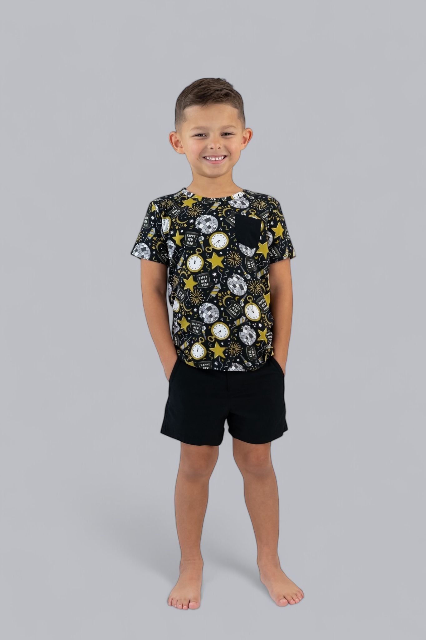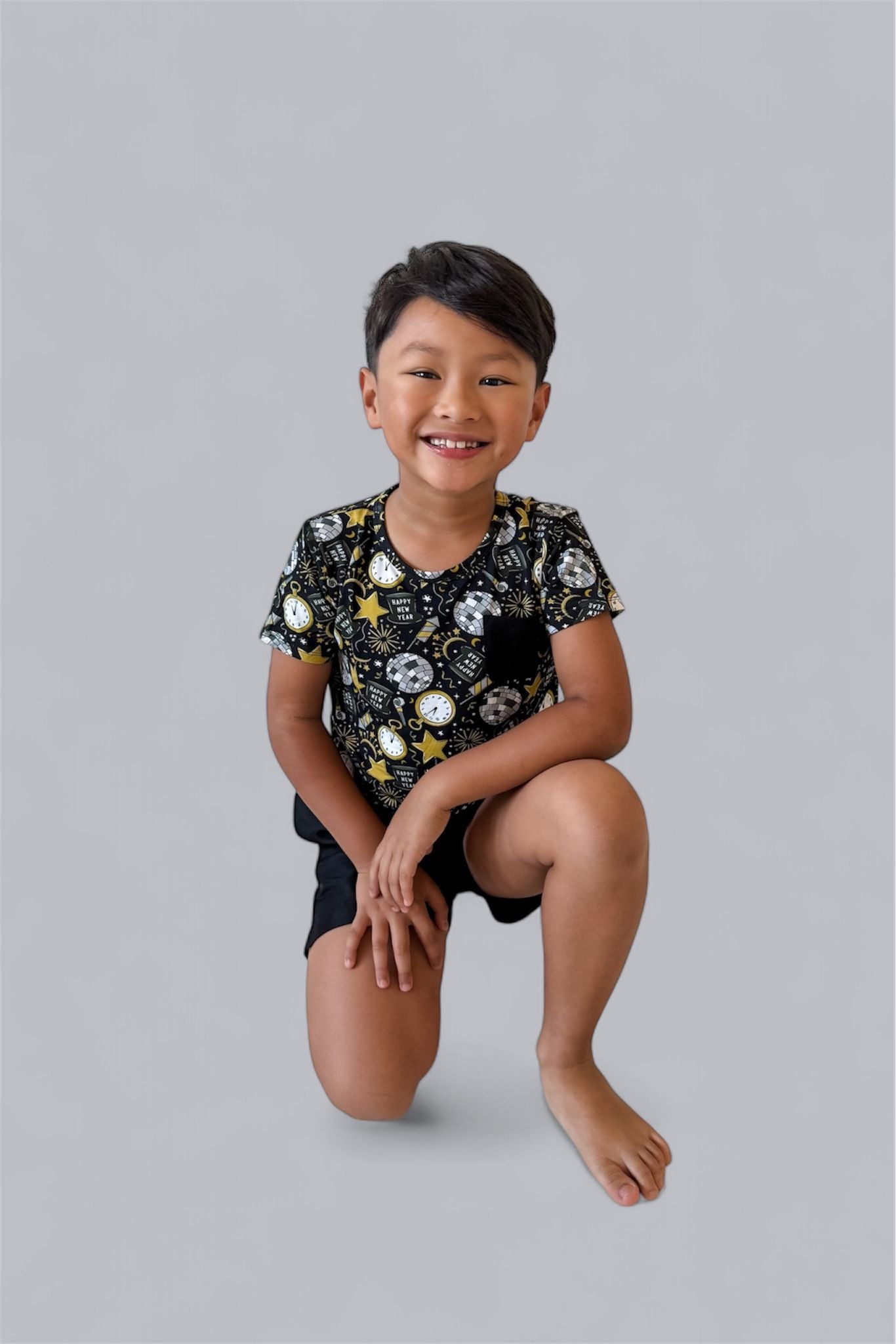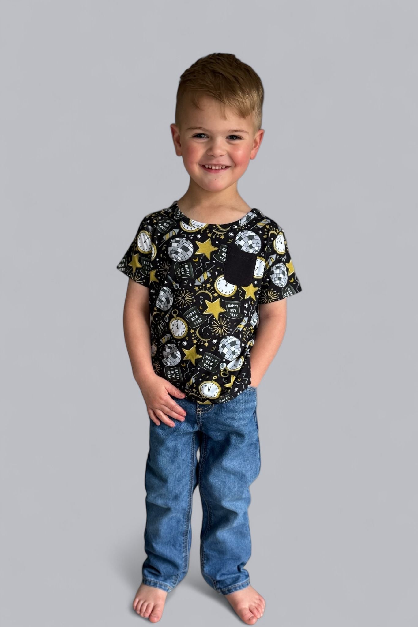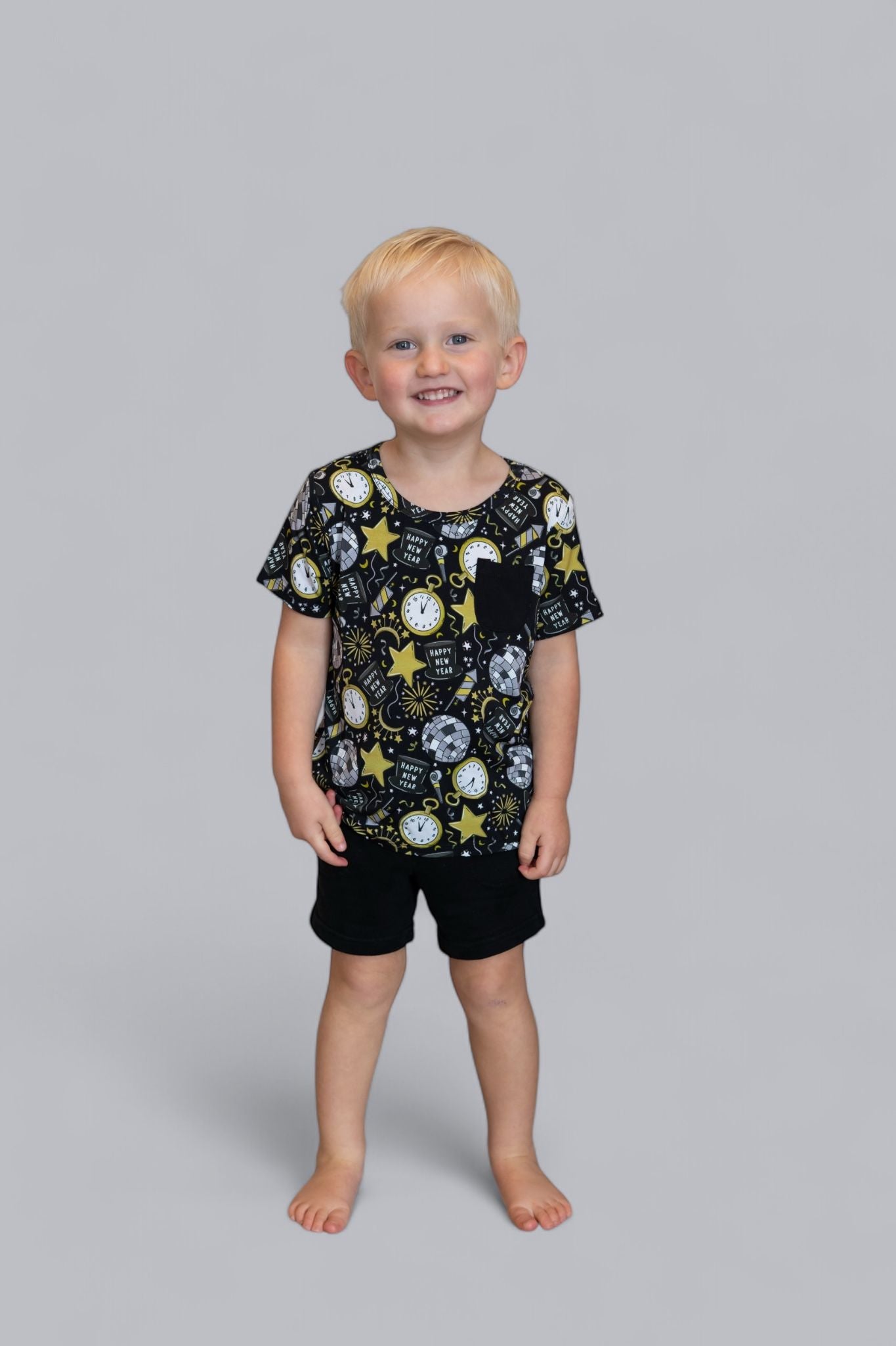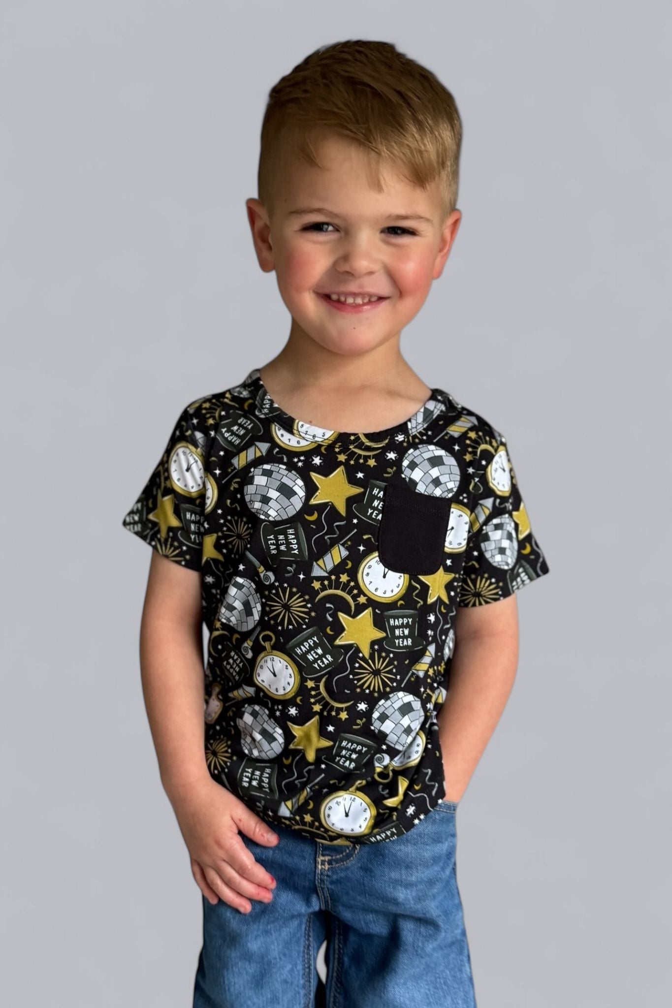 Party-ready and cozy as ever, the NYE Disco & Dreams Dream Pocket Tee is the perfect piece for ringing in the new year in style! Featuring a fun and festive print filled with disco balls, countdown clocks, party hats, and more—all in shimmering gold, silver, and black—this tee adds a pop of celebration to your little one’s wardrobe.