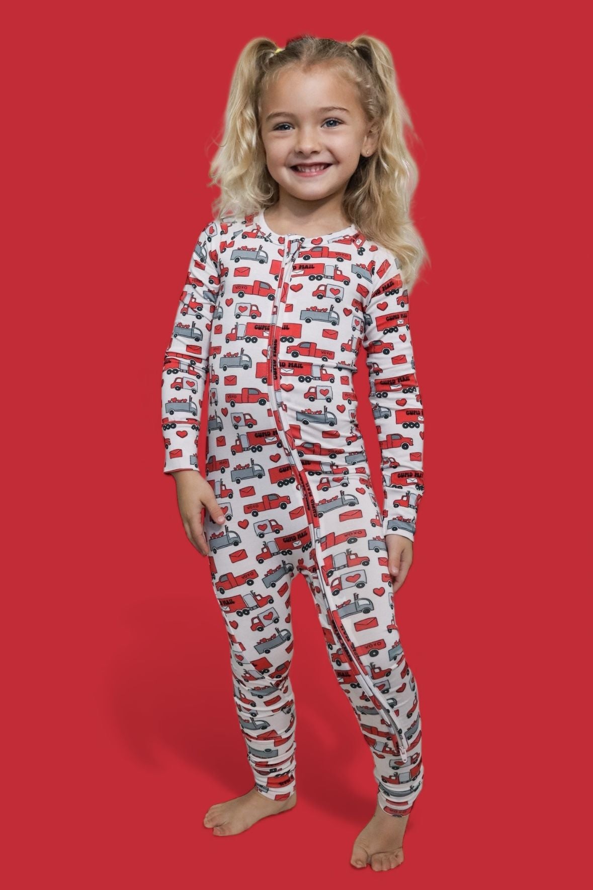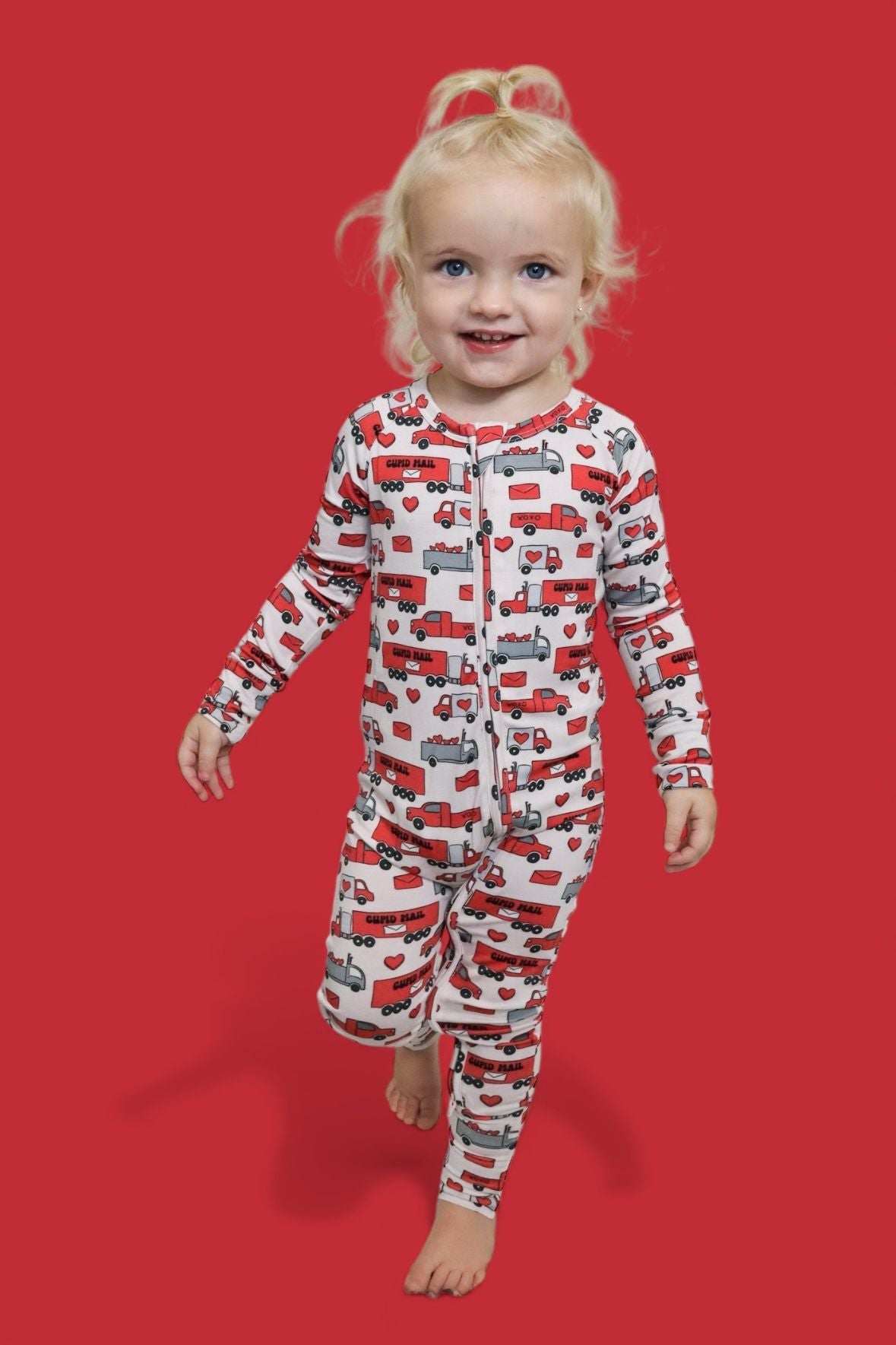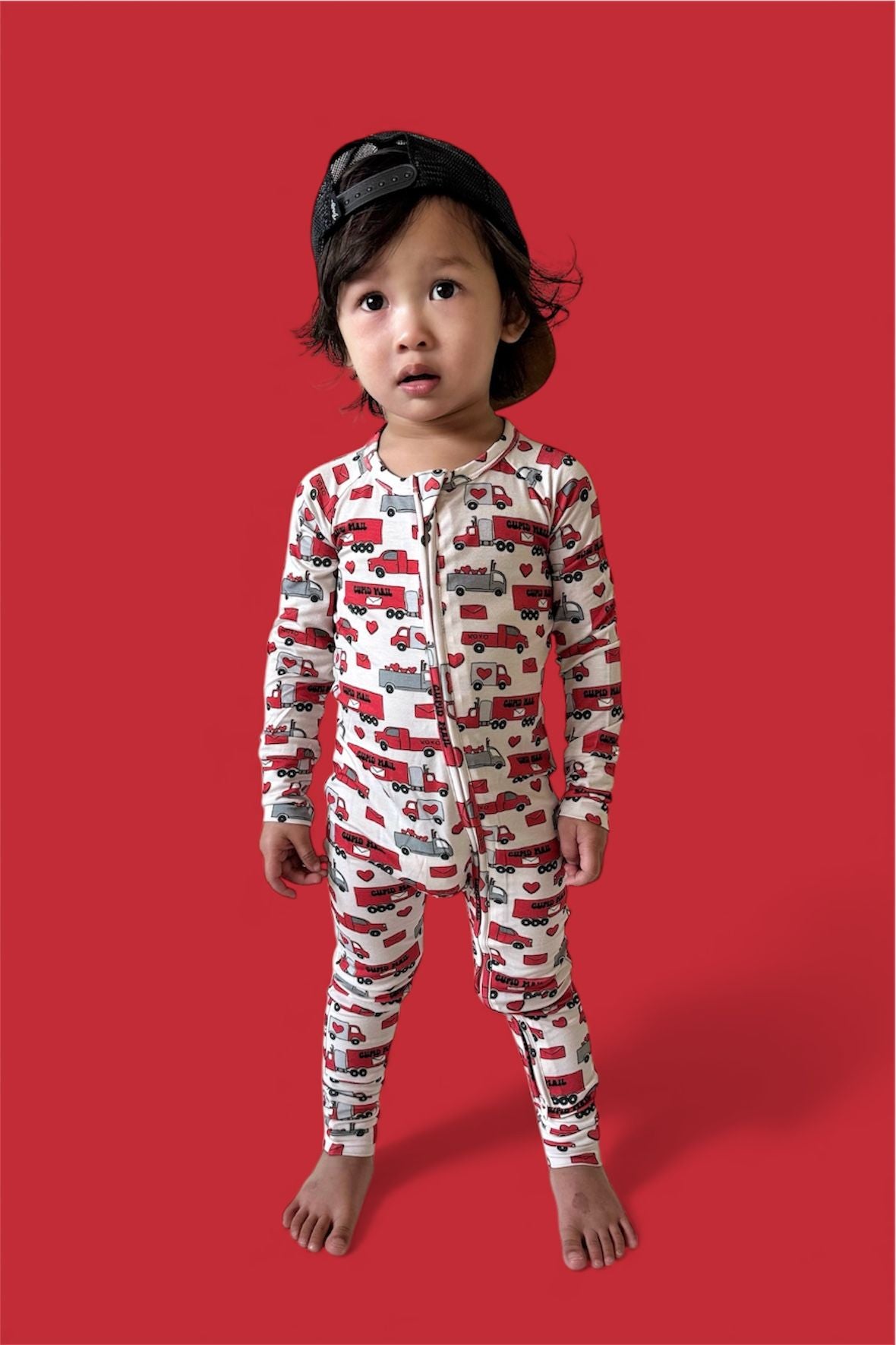 Love on the go! The Haulin’ Hearts Dream Romper is covered in a cheerful print of red + gray trucks, letters, and hearts delivering “Cupid Mail.” Made from our signature buttery-soft bamboo fabric, this romper is breathable, stretchy, and perfect for cuddles, play, and sweet deliveries of love. A two-way zipper makes diaper changes quick and easy so your little one stays comfy on the move.