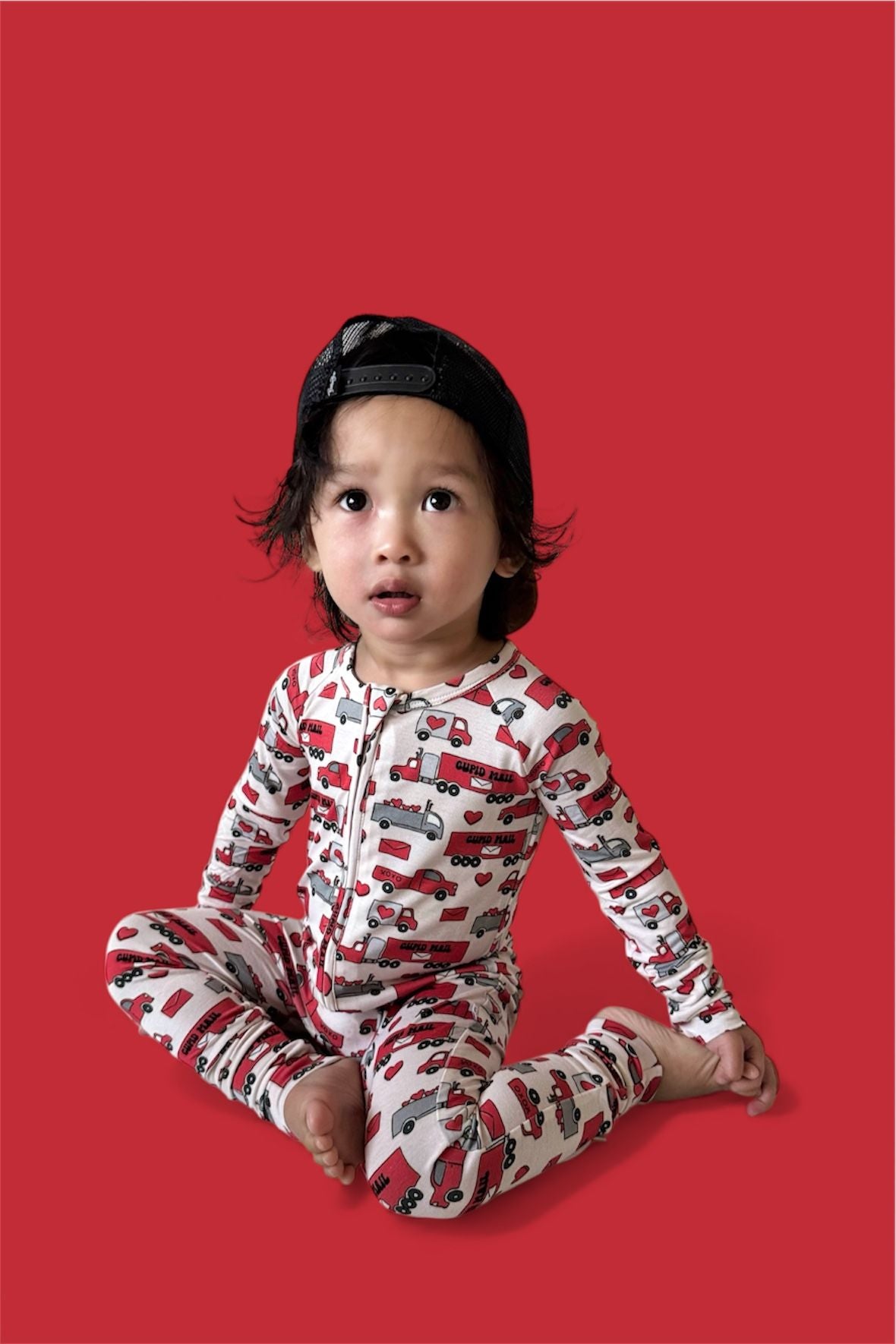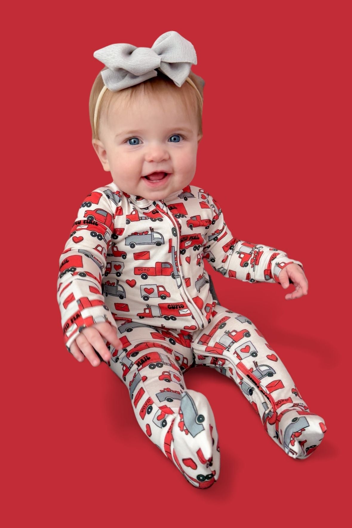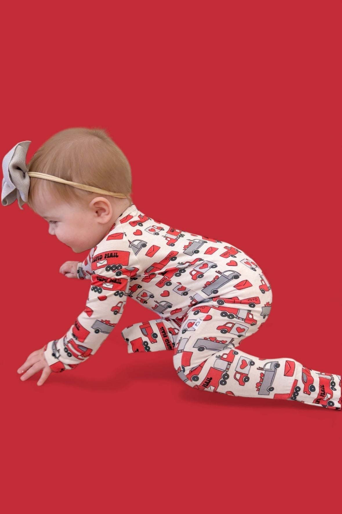 Love on the go! The Haulin’ Hearts Dream Romper is covered in a cheerful print of red + gray trucks, letters, and hearts delivering “Cupid Mail.” Made from our signature buttery-soft bamboo fabric, this romper is breathable, stretchy, and perfect for cuddles, play, and sweet deliveries of love. A two-way zipper makes diaper changes quick and easy so your little one stays comfy on the move.