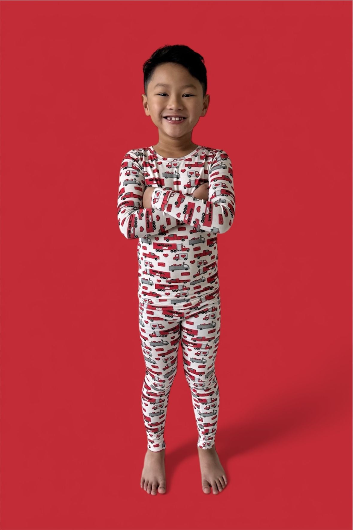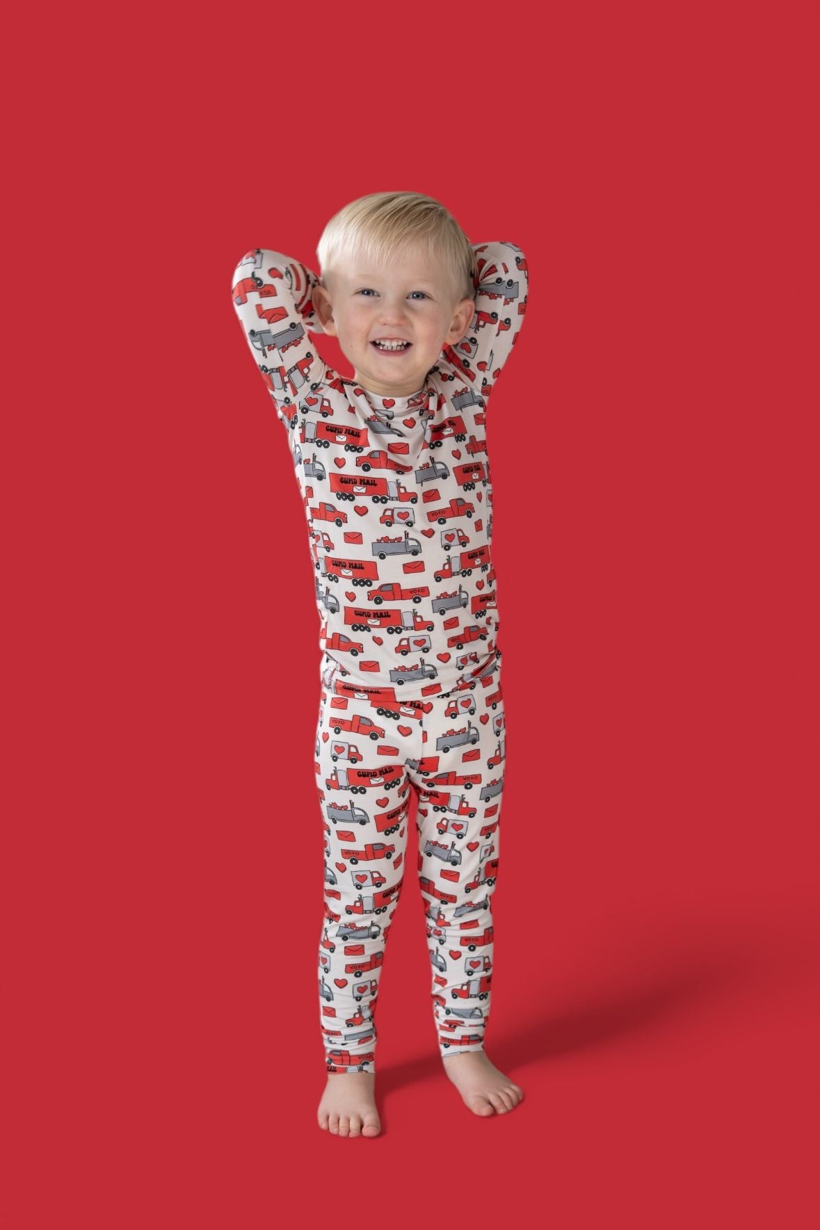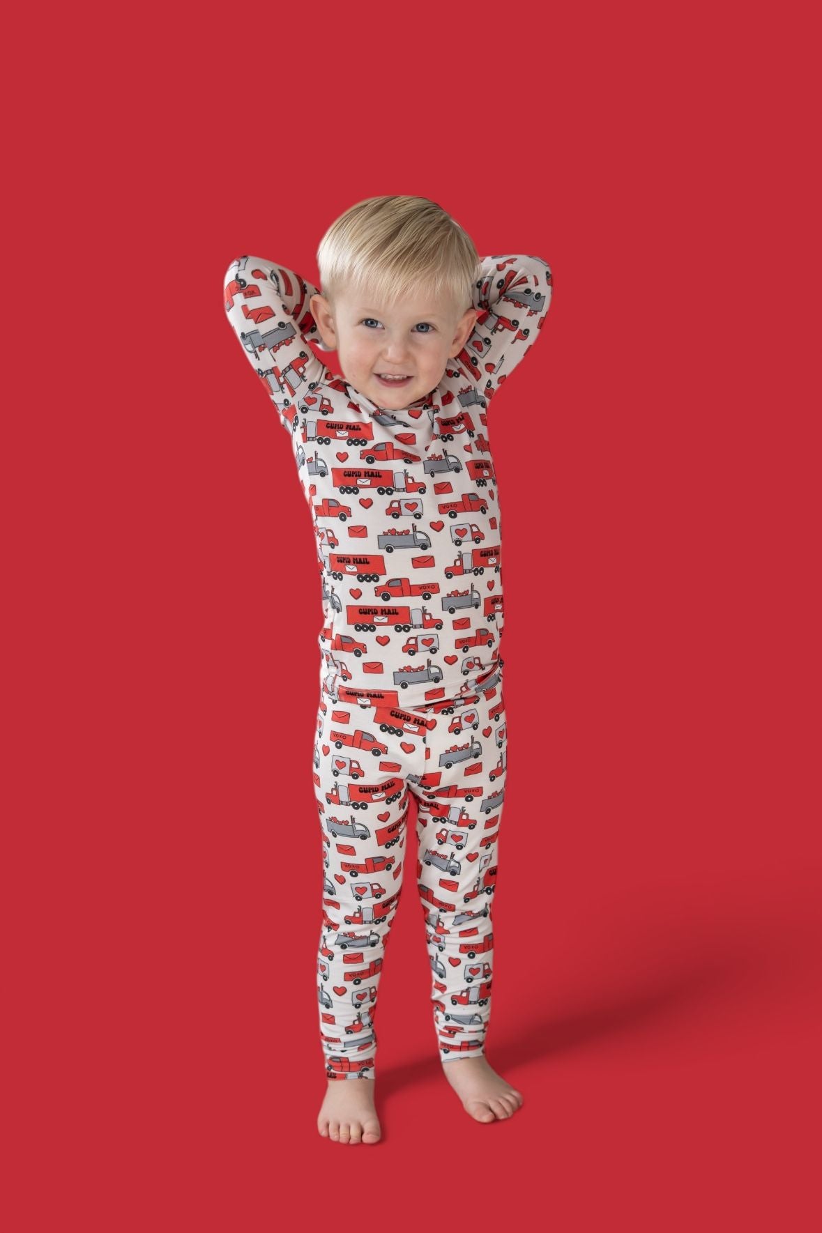 Love on the go, now in a two-piece! The Haulin’ Hearts Dream Set features a long sleeve top and matching pants with a cheerful print of red + gray trucks, letters, and hearts delivering “Cupid Mail.” Crafted from our signature buttery-soft bamboo fabric, this set is breathable, stretchy, and perfect for snuggles, playtime, or drifting into heart-filled dreams.