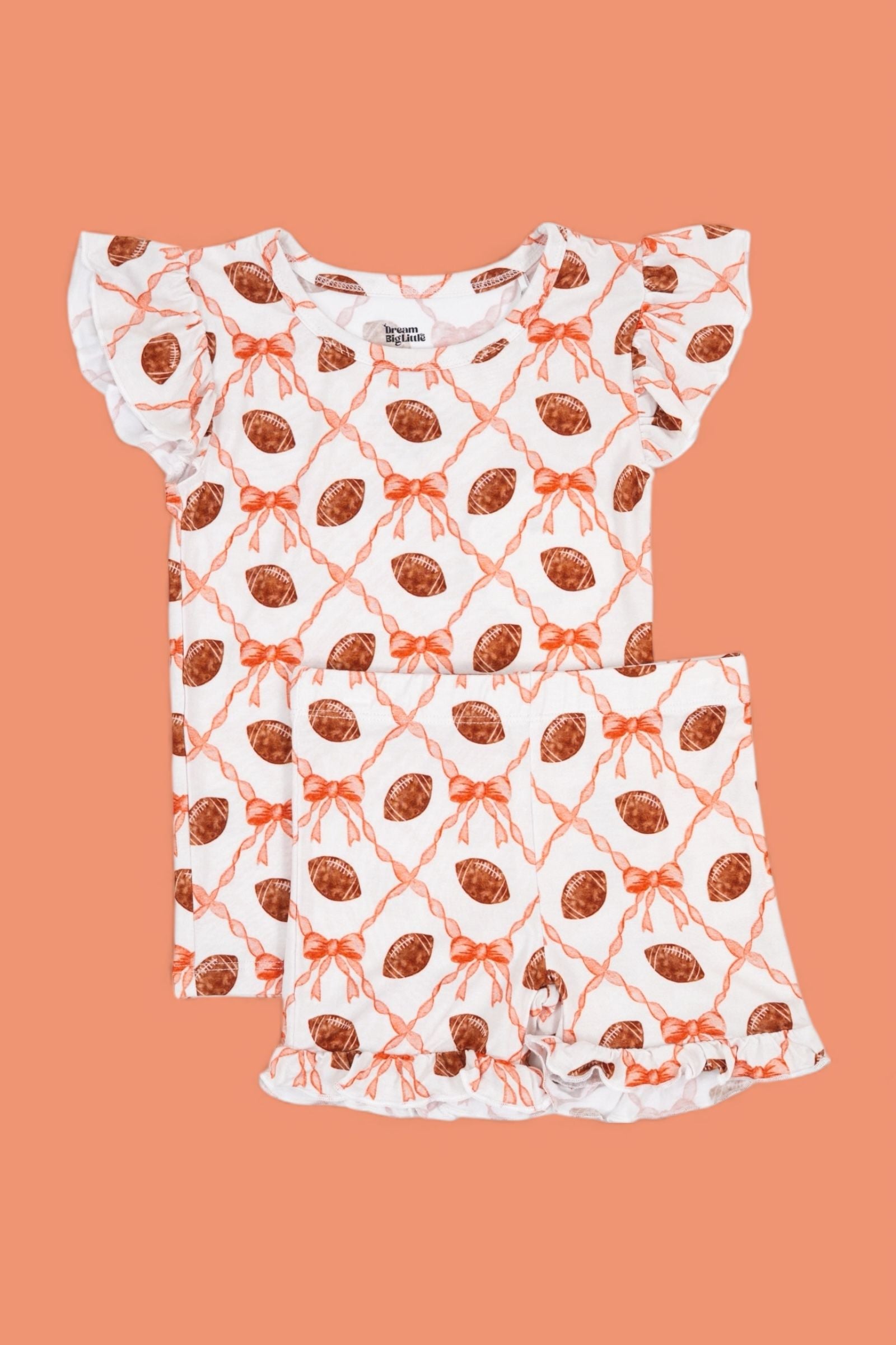 Cheer in comfort and style! The Game Day Glam Dream Ruffle Short Set features a ruffle-trimmed top and matching shorts, all decked out in our playful football + bow print. Made from our signature buttery-soft bamboo fabric, this set is breathable, stretchy, and perfect for game days, playdays, and everything in between.