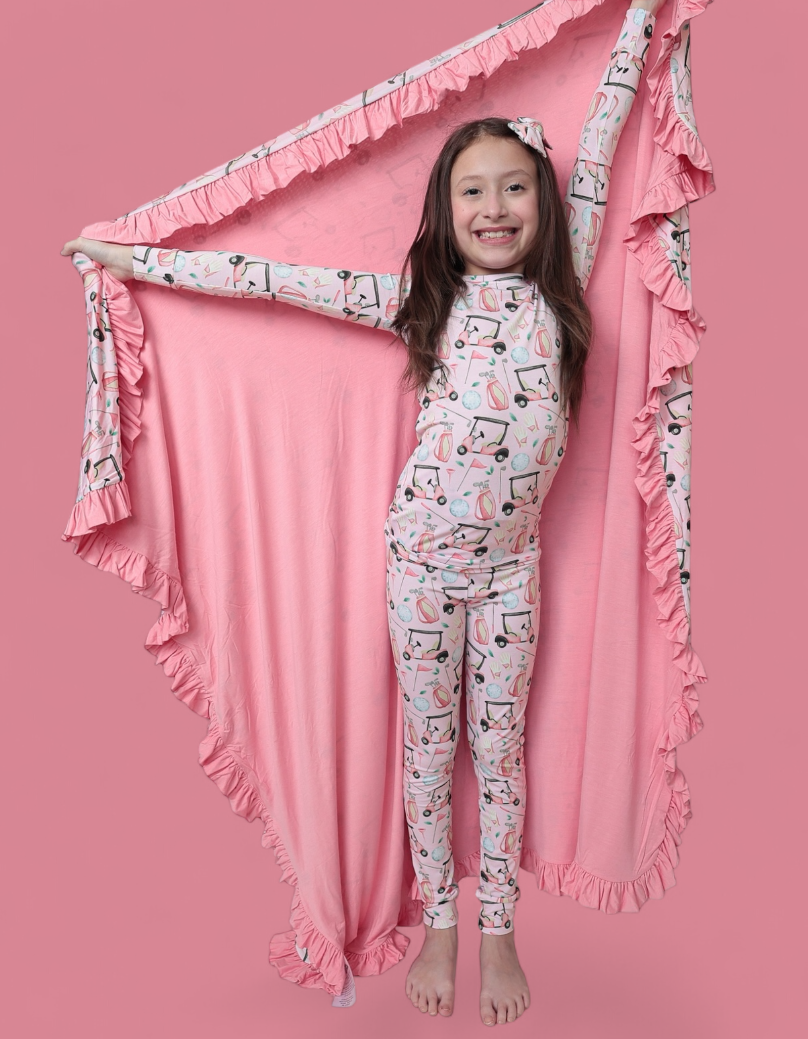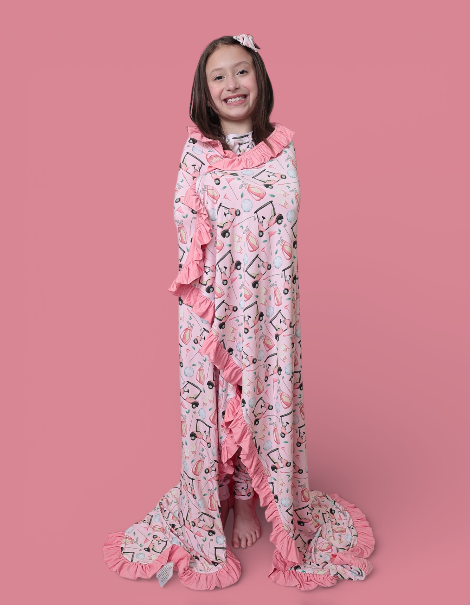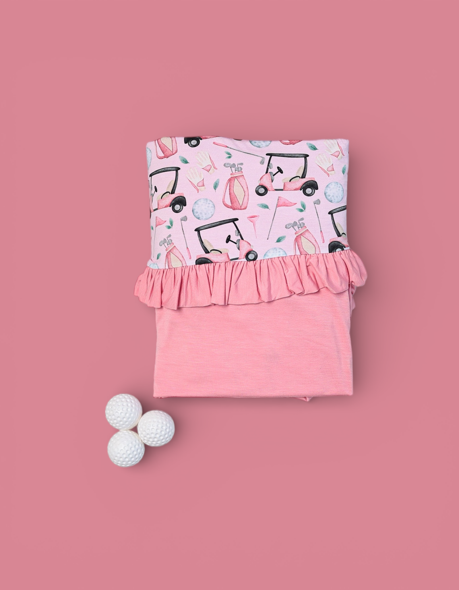 The Pretty and Par Dream Ruffle Blanket is perfect for snuggles, naps, and sweet little moments at home or on the go. Featuring an adorable golf-inspired print with soft feminine details, this blanket is finished with charming ruffle trim and crafted from our signature buttery-soft bamboo fabric for a breathable, gentle feel your little one will love.
