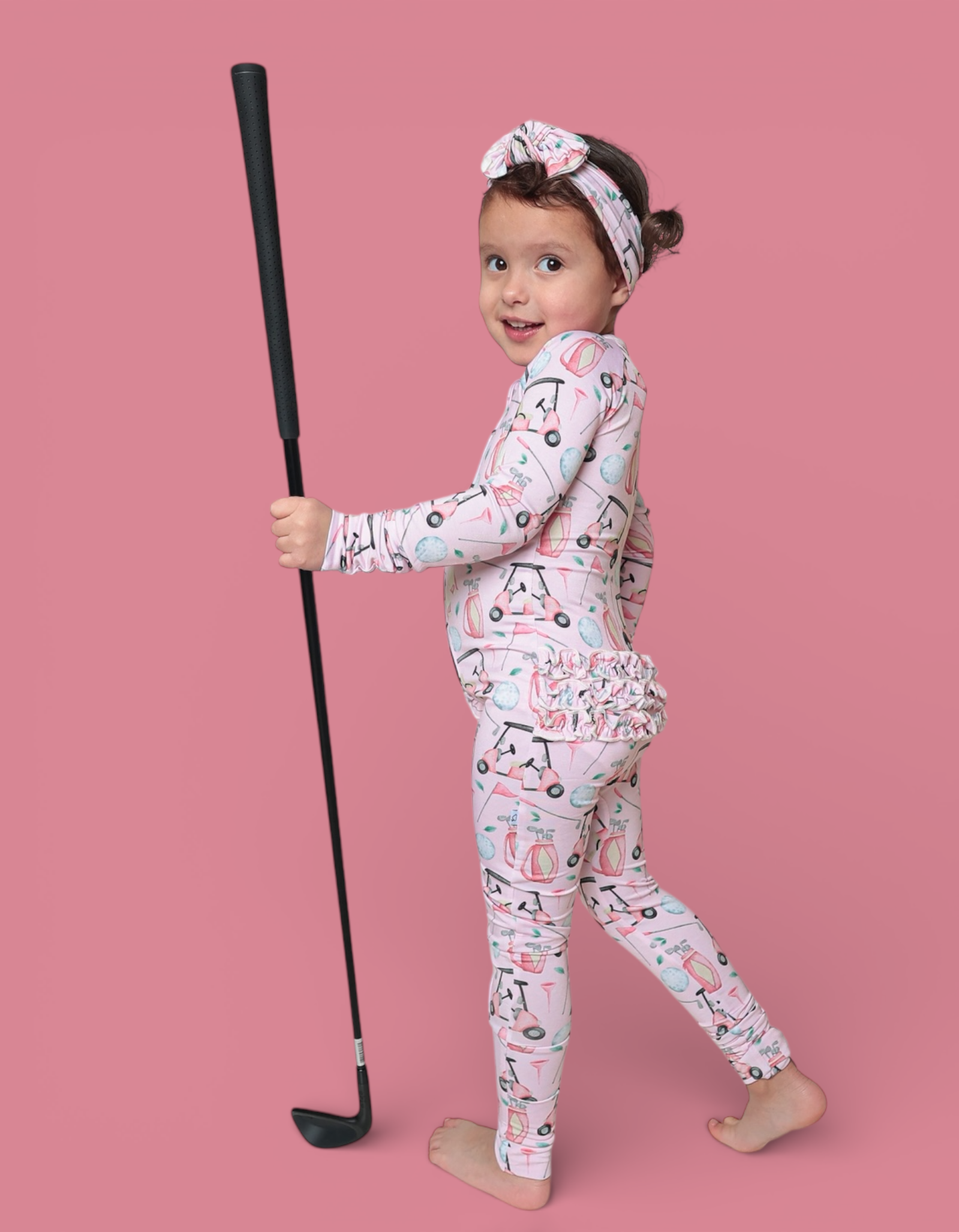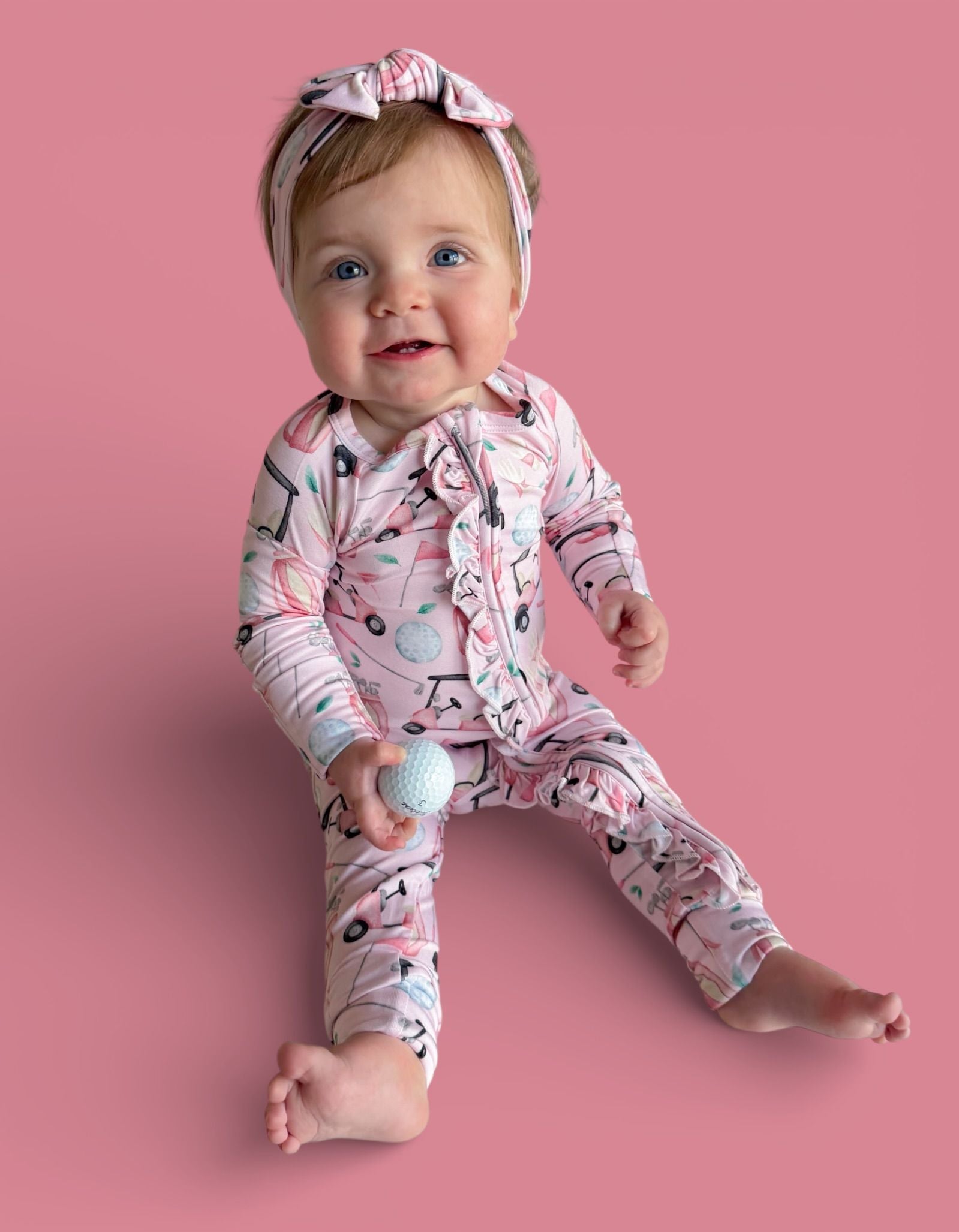 The Pretty and Par Dream Ruffle Romper brings playful elegance to everyday comfort, featuring an adorable golf-inspired print with soft pink details for the cutest sporty vibe. Made from our signature buttery-soft bamboo fabric, this cozy one-piece is breathable, gentle, and perfect for all-day wear. Finished with darling ruffle accents for an extra dose of charm.