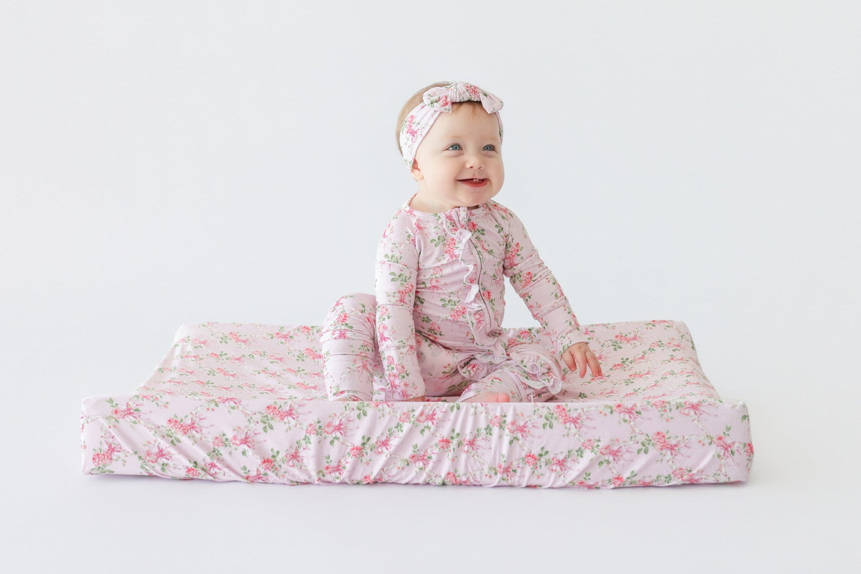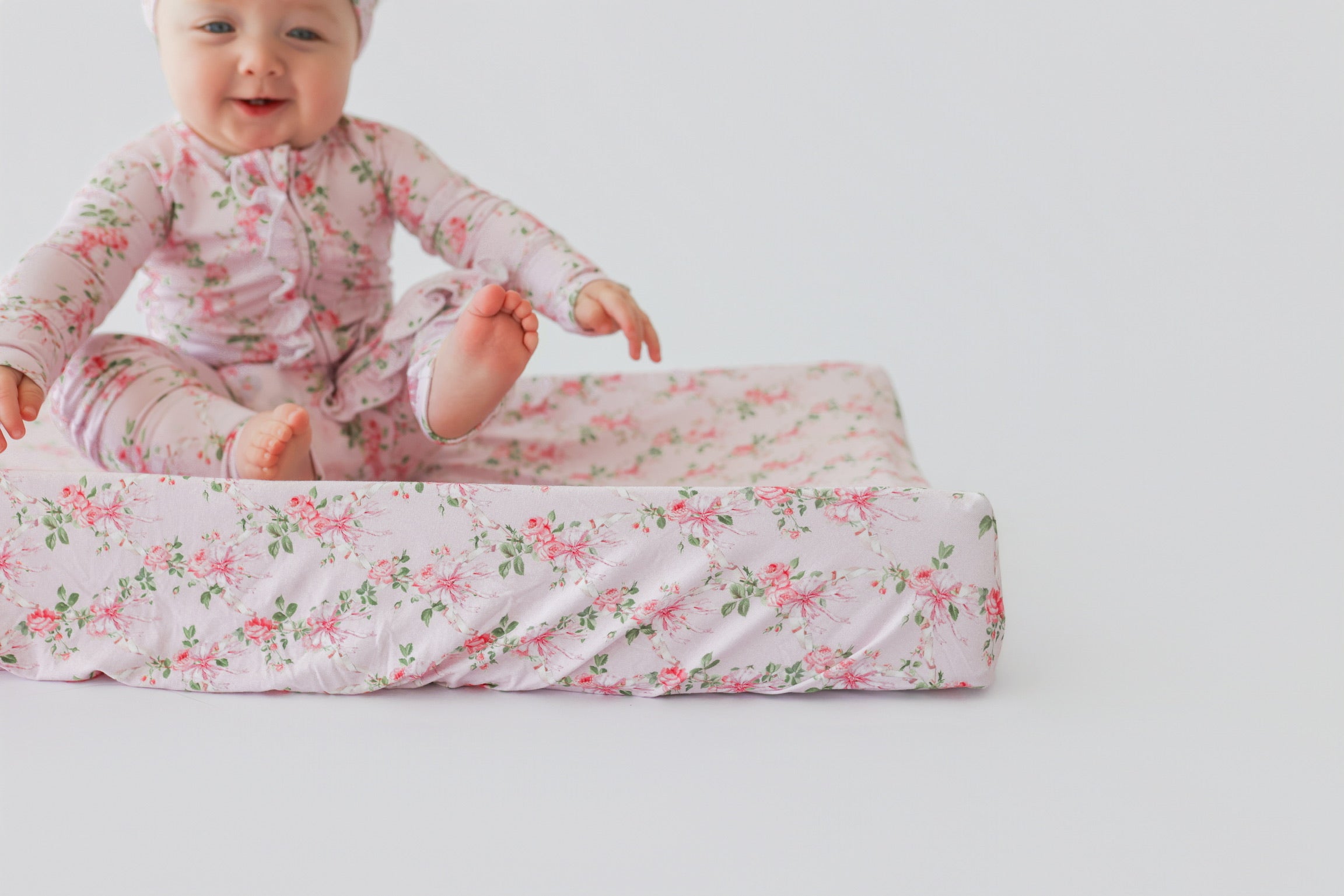 The Blooming Trellis Dream Changing Pad brings soft floral charm to diaper changes. Featuring a delicate floral trellis print in gentle pink hues, this beautiful essential adds a calm, cozy feel to your nursery routine. Crafted from our signature buttery-soft bamboo fabric, it’s breathable, gentle, and comfy for your little one.