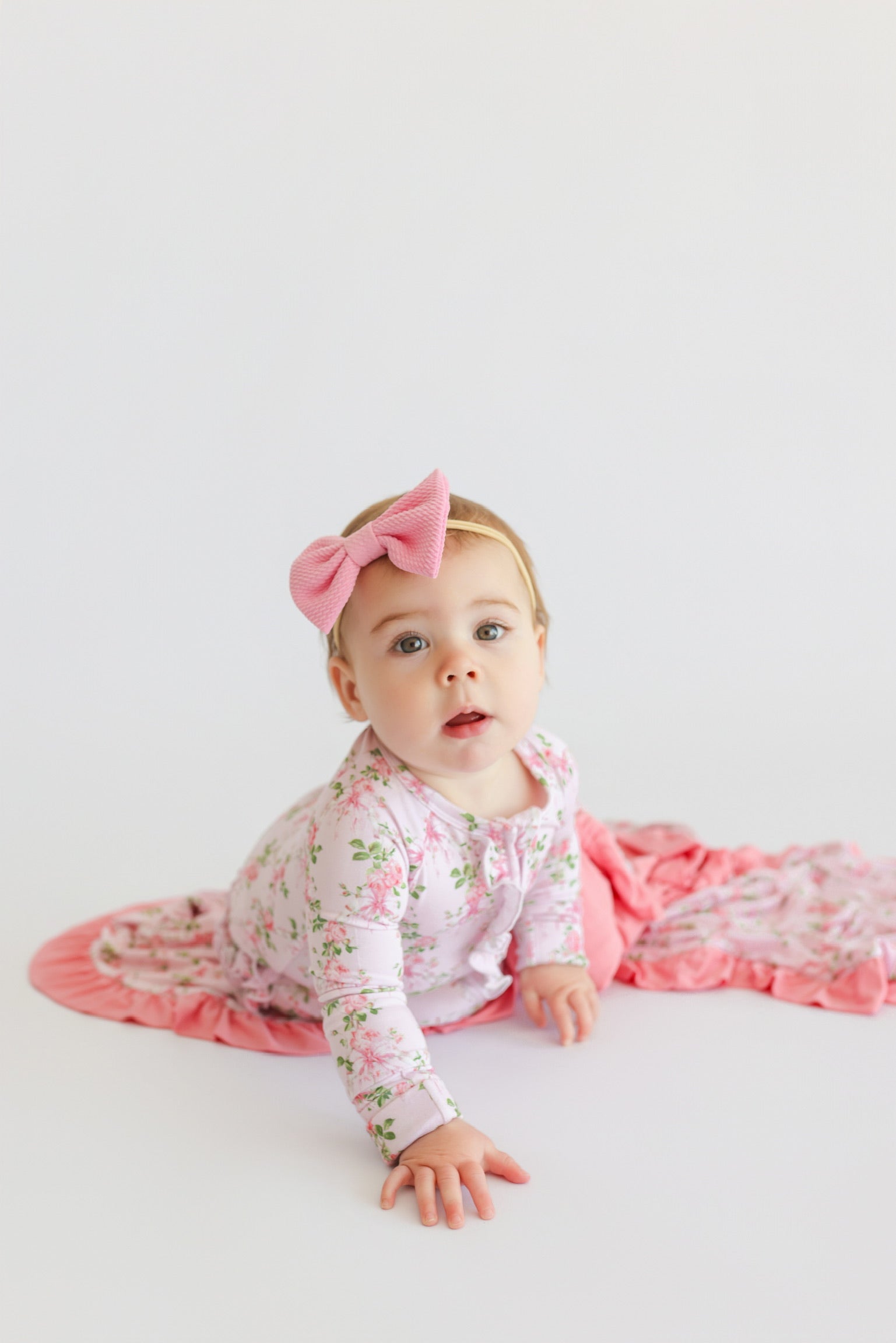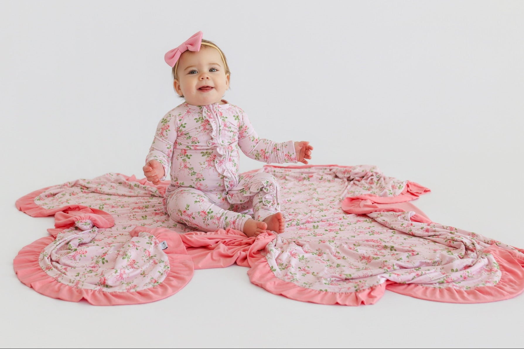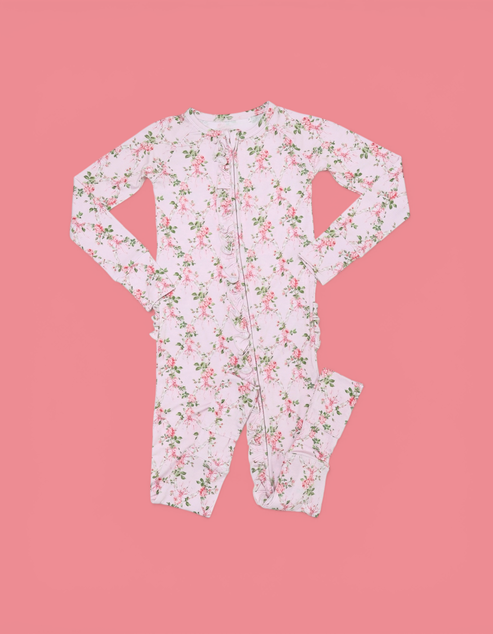 The Blooming Trellis Dream Ruffle Romper is a romantic take on everyday comfort. Featuring a delicate allover floral trellis design in soft pink tones, this sweet romper is finished with charming ruffle details for an extra-pretty touch. Crafted from our signature buttery-soft bamboo fabric, it’s breathable, gentle, and perfect for cozy cuddles, playtime, and special moments.