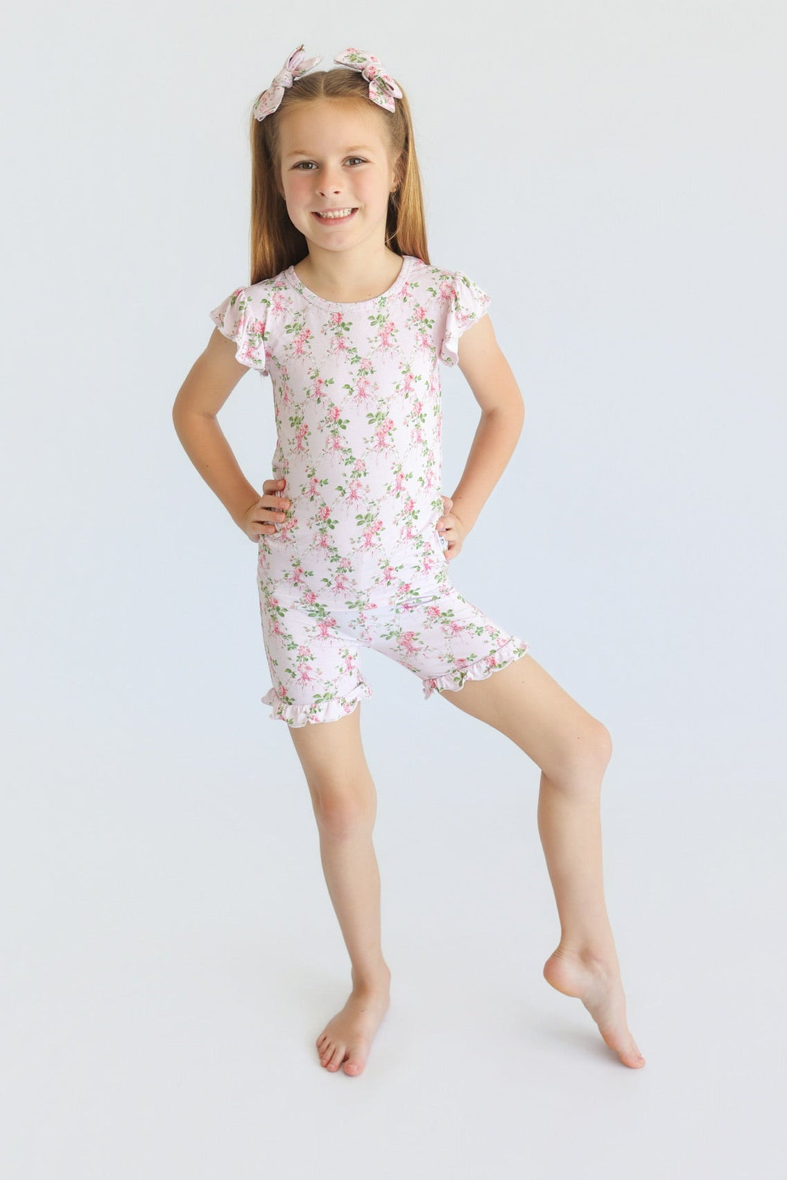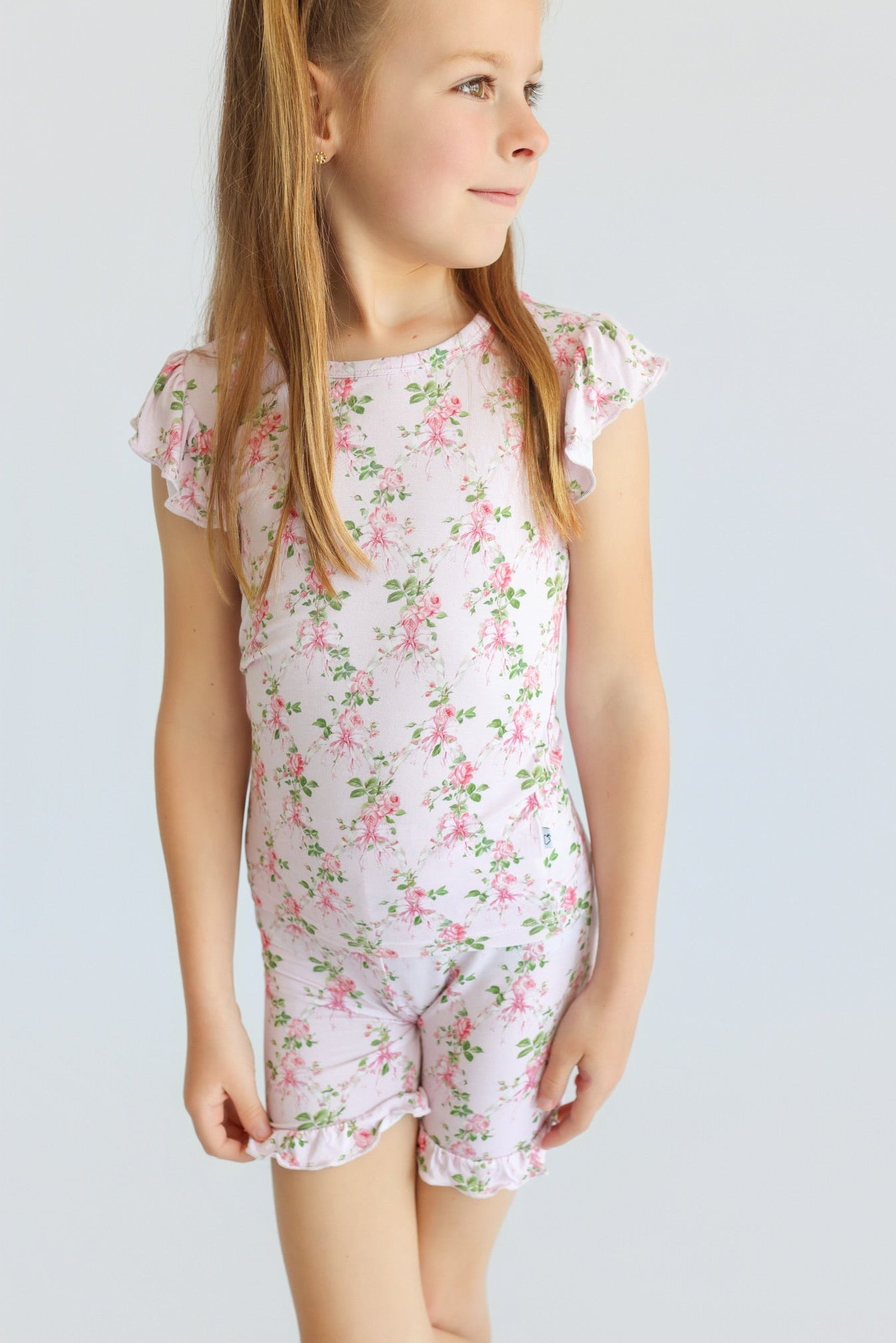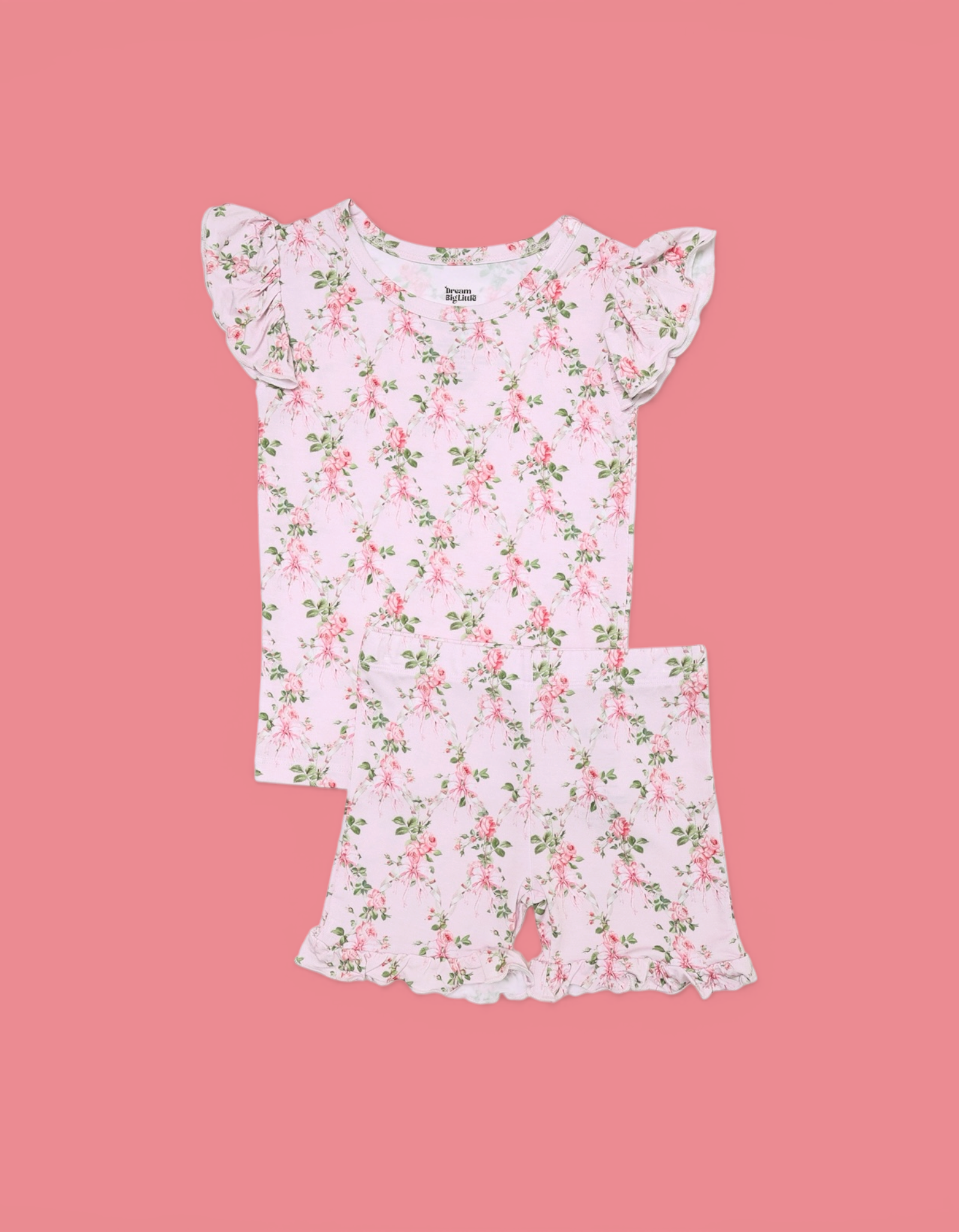 The Blooming Trellis Dream Ruffle Short Set brings soft florals and feminine charm to warm-weather wear. Featuring a delicate floral trellis print in gentle pink hues, this two-piece set is finished with sweet ruffle details for an extra-pretty touch. Made from our signature buttery-soft bamboo fabric, it’s breathable, gentle, and perfect for play, lounging, and everyday adventures.