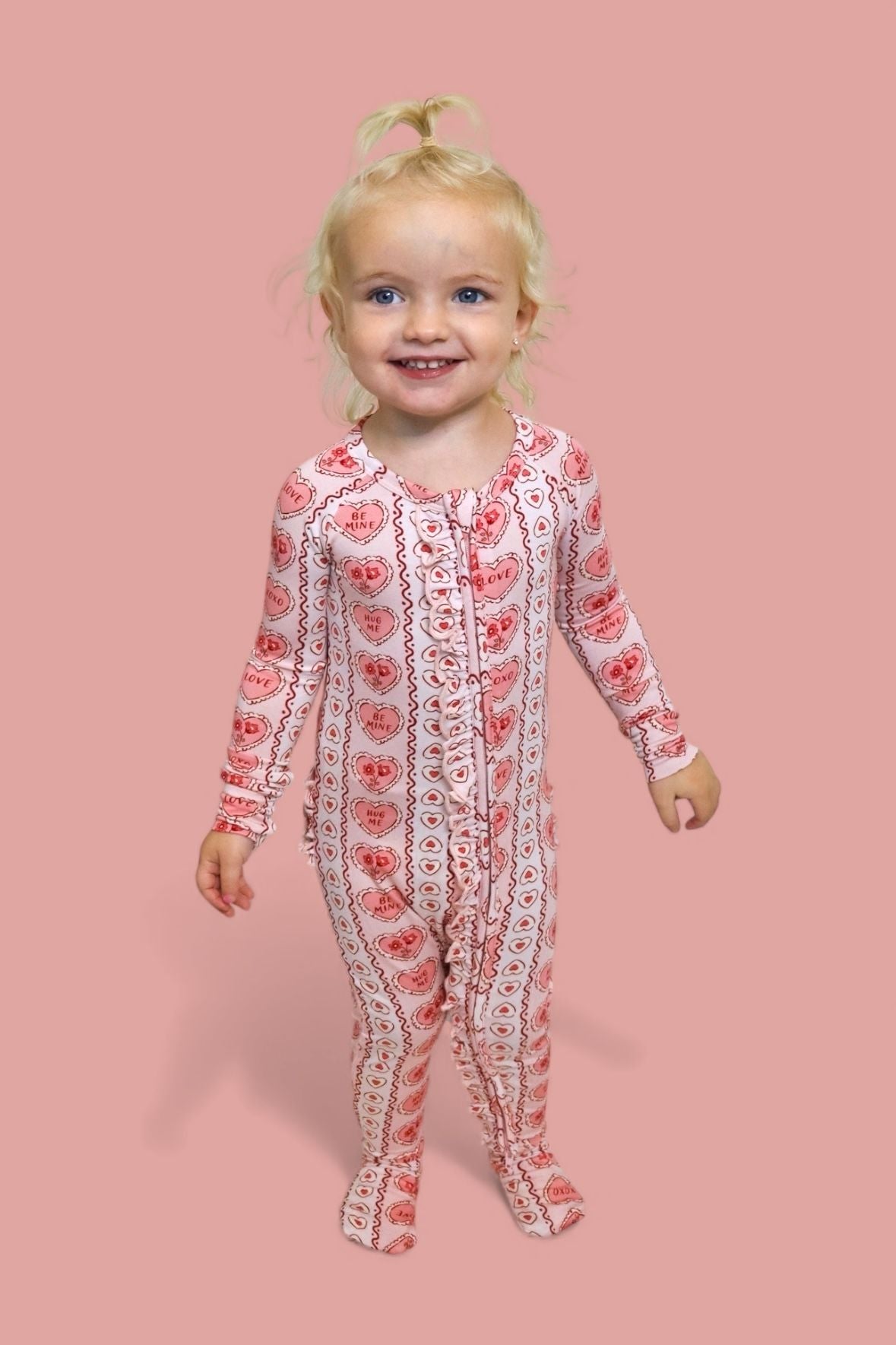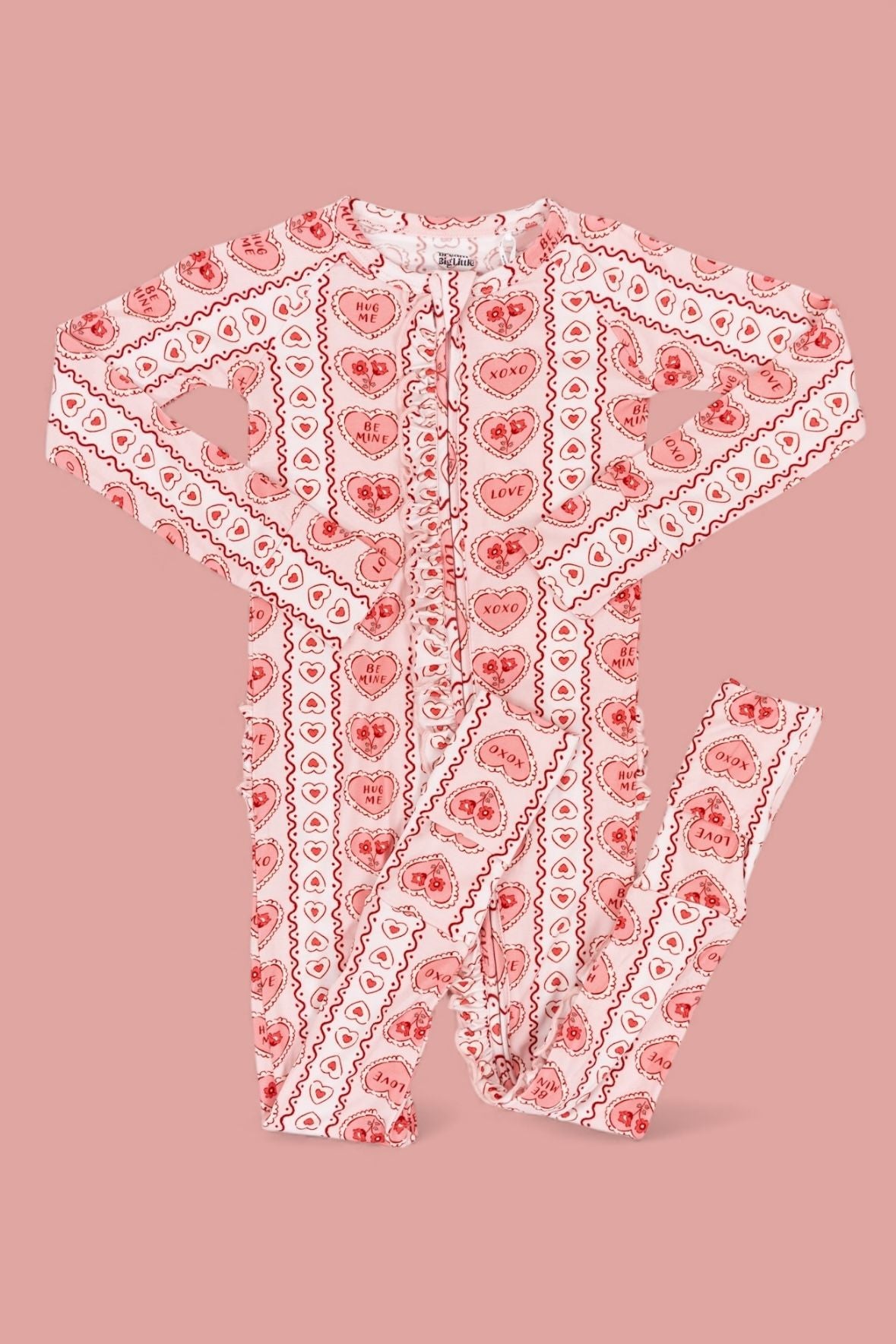 Your little sweetheart will be ready for hugs, kisses, and all the “Be Mine” moments in our Candy Hearts Dream Ruffle Romper! This adorable romper features rows of pastel candy hearts printed with sweet sayings like “Love,” “XOXO,” and “Hug Me,” plus dainty ruffle details for an extra touch of charm. Crafted from buttery-soft bamboo, it’s breathable, stretchy, and gentle on sensitive skin—perfect for day or night.