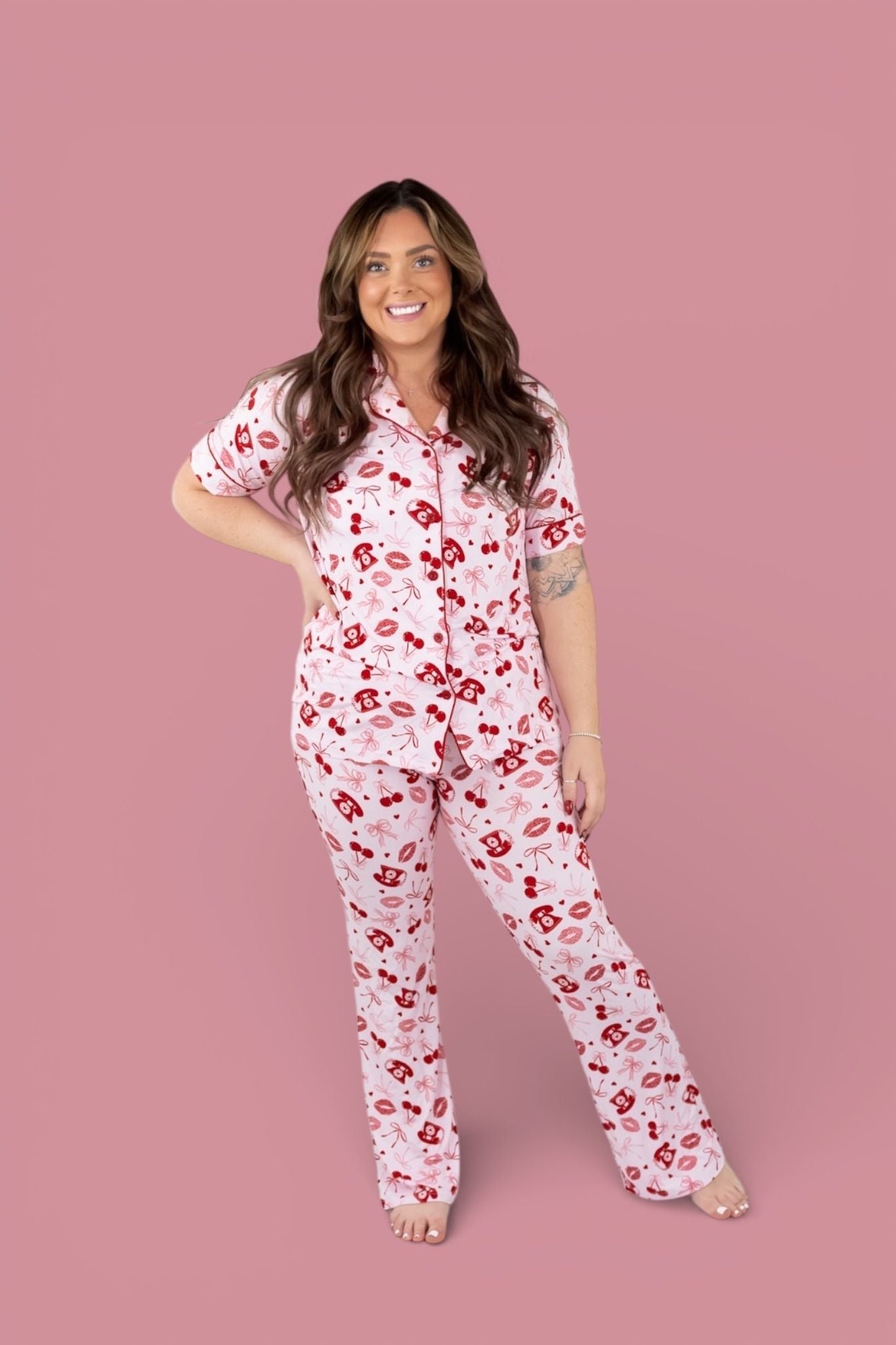 Fall in love with bedtime! Our Sealed With Love Women’s Dream Flare Set brings vintage-Valentine charm to your sleepwear. Featuring retro telephones, kissy lips, bows, and cherries on buttery-soft bamboo, this set combines playful nostalgia with dreamy comfort. The relaxed button-front top pairs with flattering flare-leg pants for an effortlessly chic look you’ll reach for night after night.