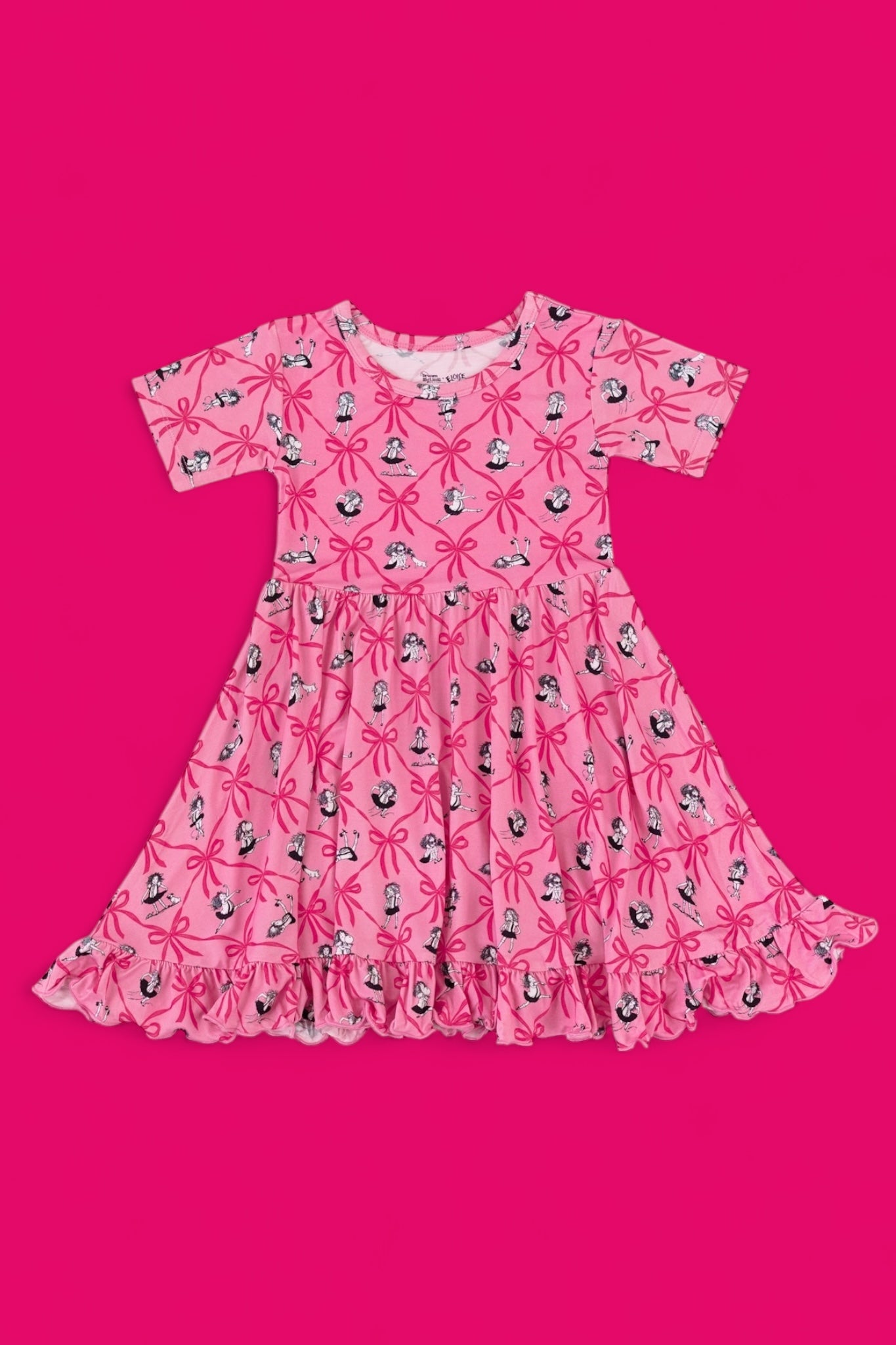 The Eloise Royal Ribbons Dream Ruffle Night Dress is sweet, spunky, and full of charm—just like Eloise herself! Featuring iconic Eloise illustrations surrounded by oversized pink bows, this short sleeve ruffle night dress is crafted from our signature buttery-soft fabric for maximum comfort and flair. It’s perfect for cozy nights or simply feeling fabulous.