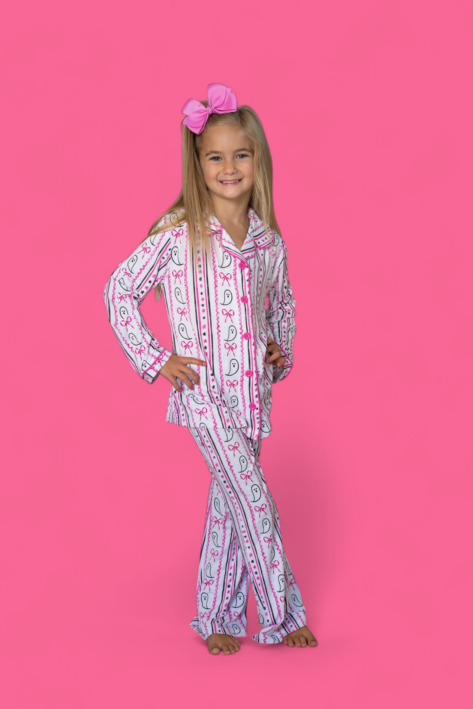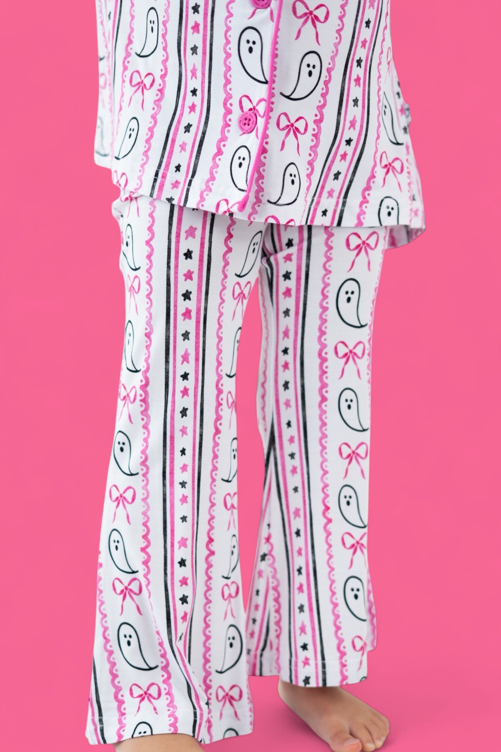Twirls have never looked so spooky-sweet! The Boo and Bows Dream Girl’s Flare Set features a charming Halloween print filled with friendly ghosts, dainty bows, scalloped stripes, and twinkling stars—all in soft pink and classic black. With flowy flare pants and a comfy long sleeve top made from our signature buttery-soft fabric, it’s perfect for school days, playdates, and magical Halloween memories.