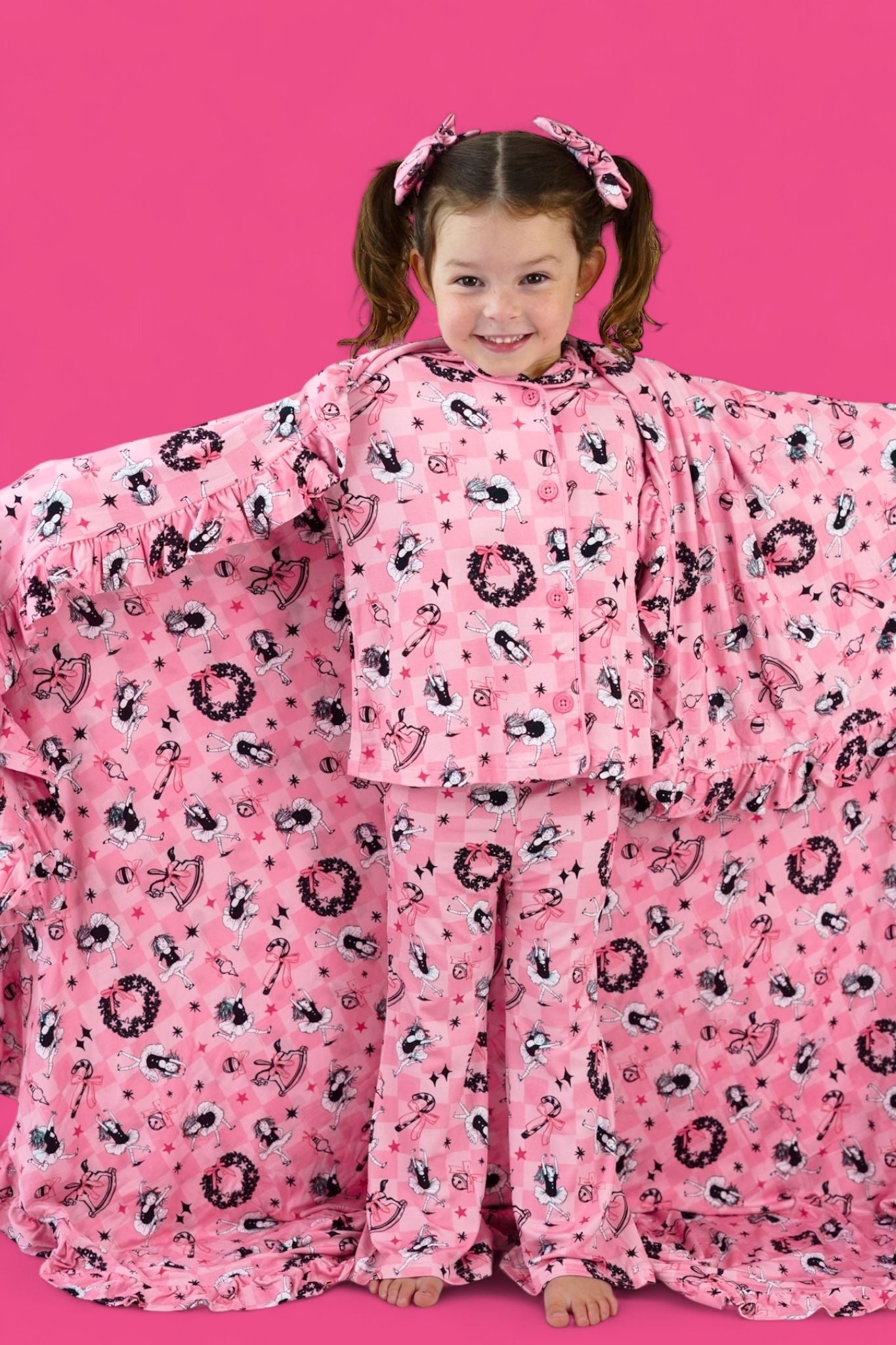 She’ll be pirouetting through the season in the Eloise Holiday Ballet Dream Girl’s Flare Set! Featuring the iconic Eloise in her ballet best, twirling across a pink checkerboard background sprinkled with festive wreaths, stars, bows, and ornaments—this buttery-soft set is made for magical moments. With a comfy long sleeve top and flowy flare pants, it’s the perfect combo of cozy and glam.