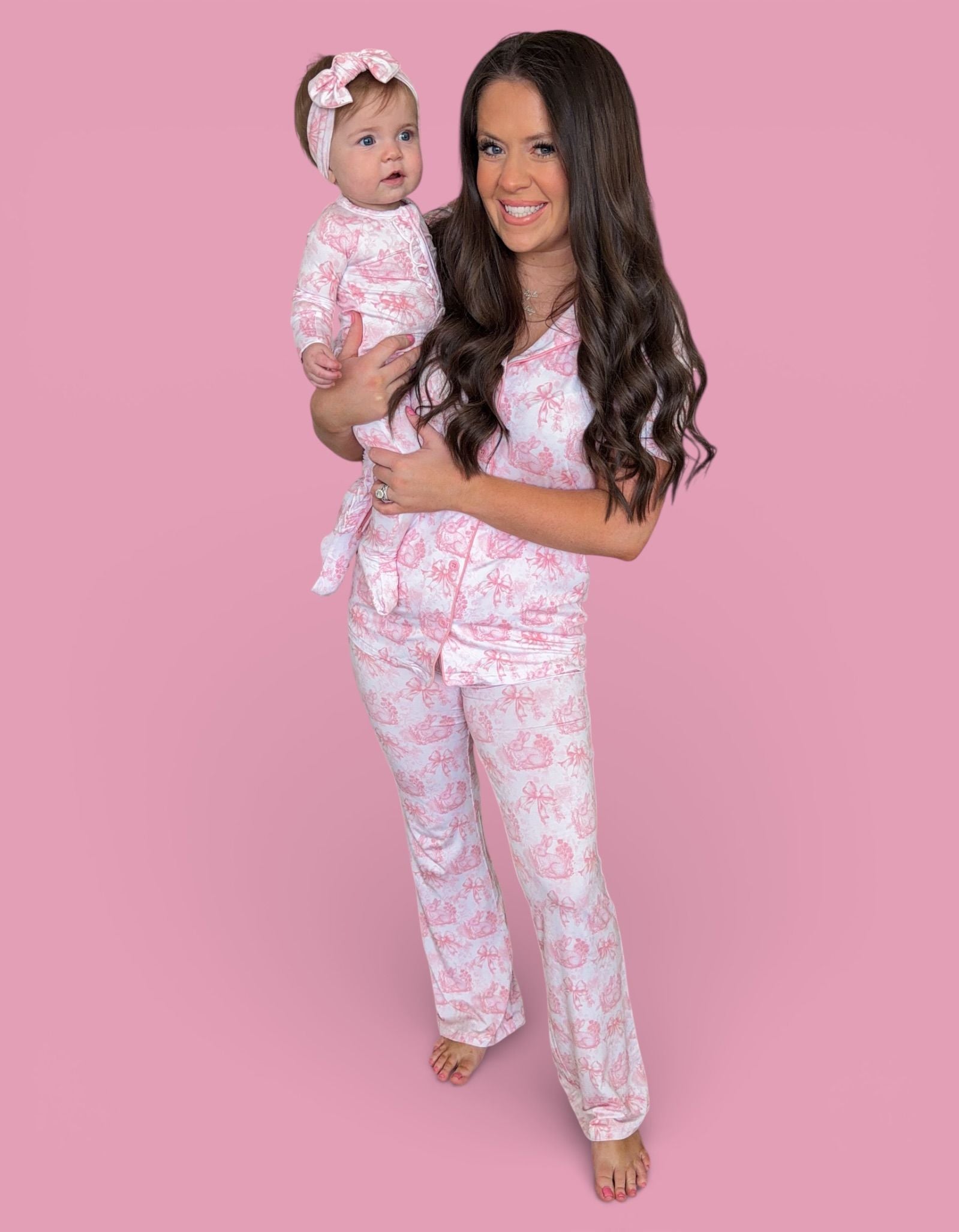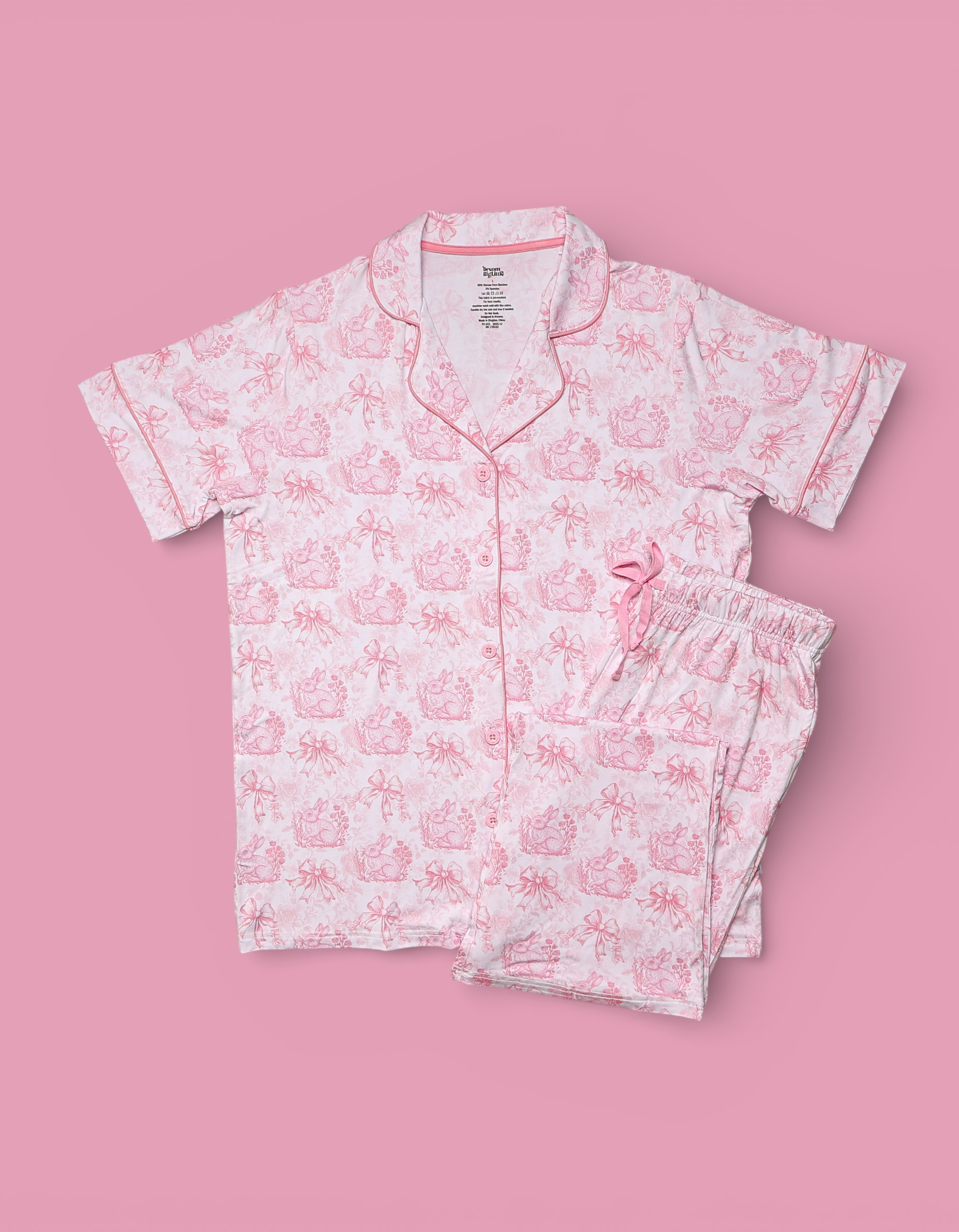 Pretty, feminine, and unbelievably soft. Our Blush Bunny Toile Women’s Dream Flare Set features an elegant blush toile print with bunnies, bows, and florals — a timeless spring look perfect for Easter morning, matching moments with littles, or lounging in dreamy comfort. 🌸✨