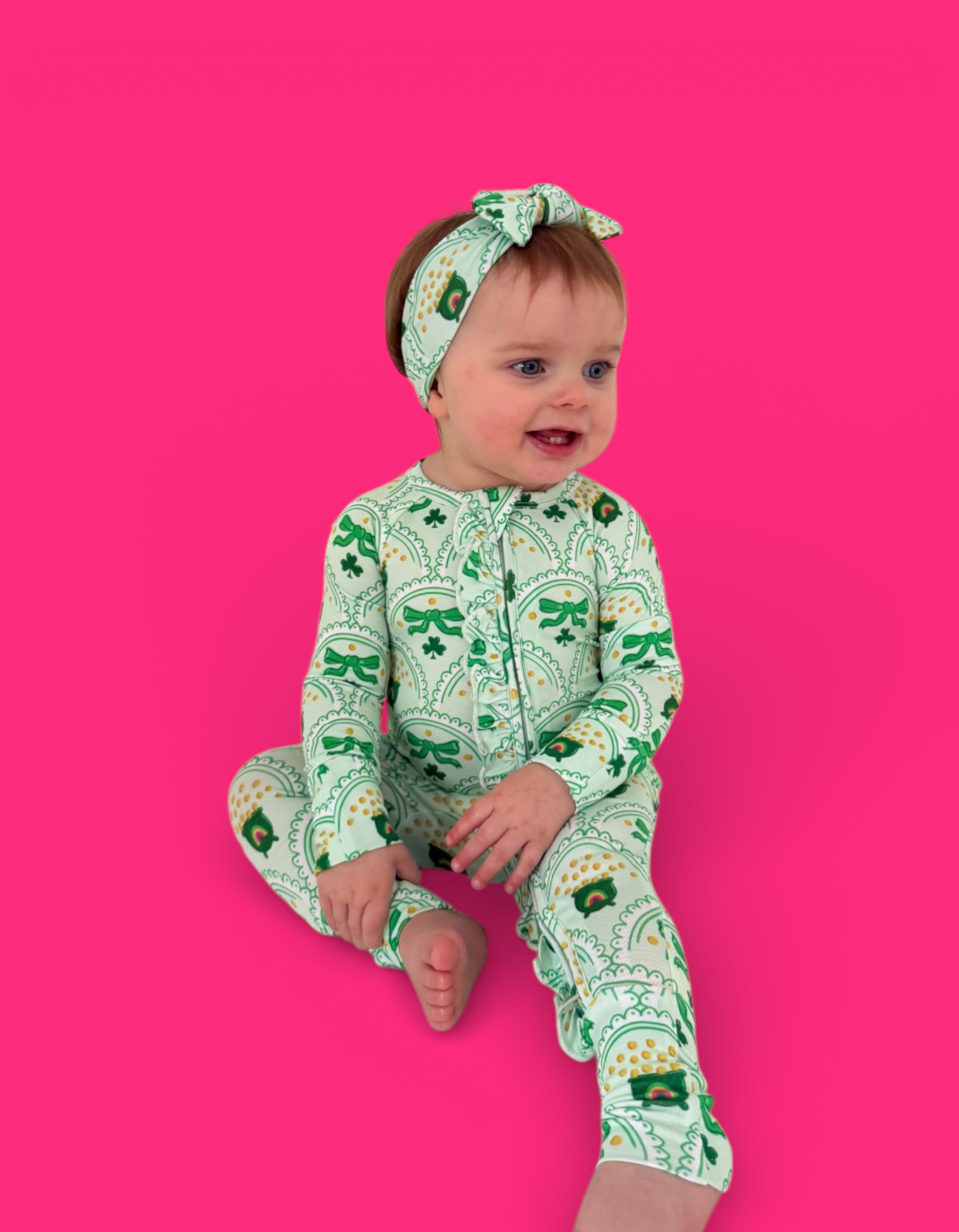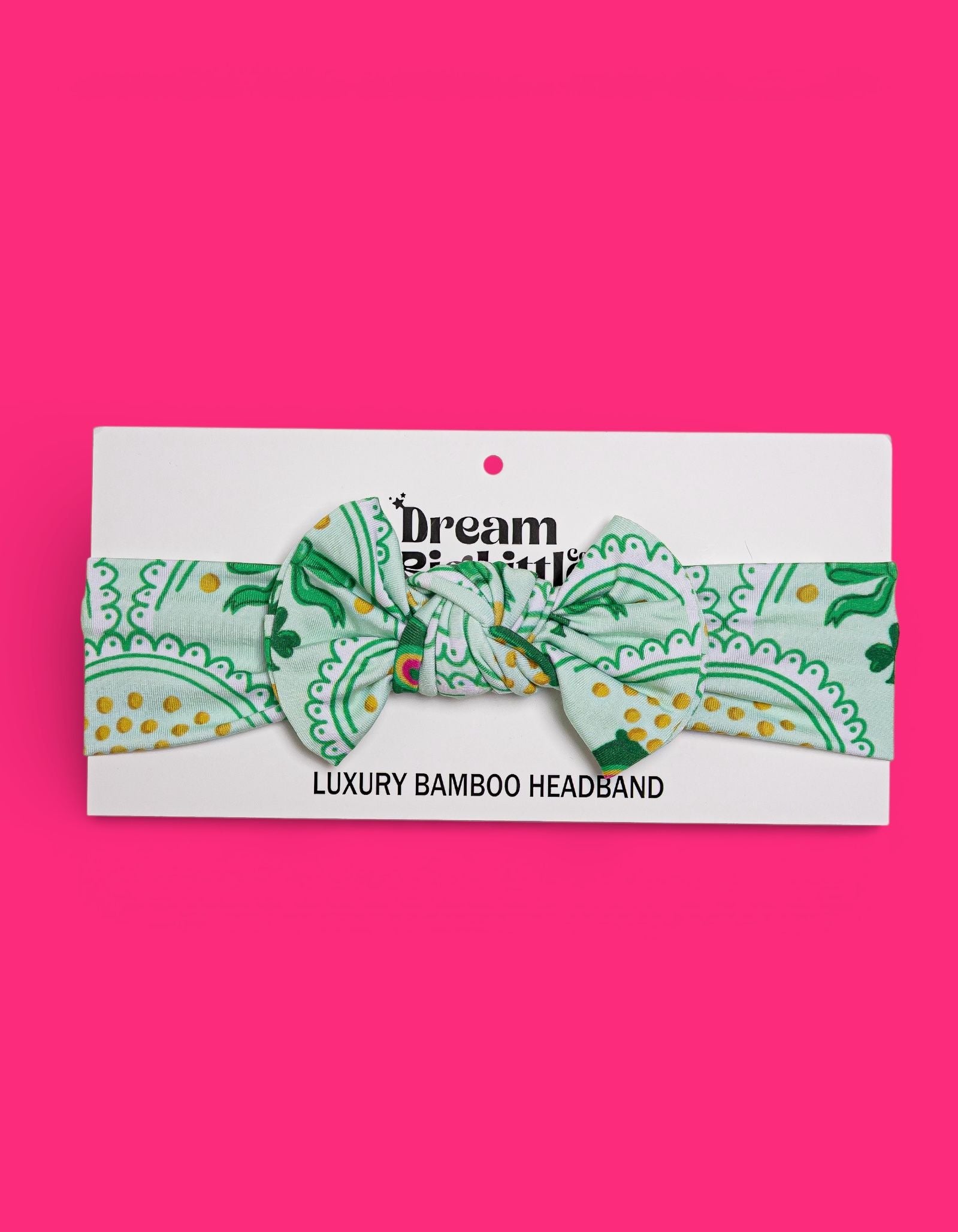 Sweet, festive, and full of lucky charm, the Clover & Coins Dream Bow features a scalloped pattern of shamrocks, lucky coins, and tiny bows in soft greens and whites — the perfect accessory to complete any St. Patrick’s Day look. Soft, stretchy, and comfortable for all-day wear, it adds an adorable sparkle to every outfit. 💚✨