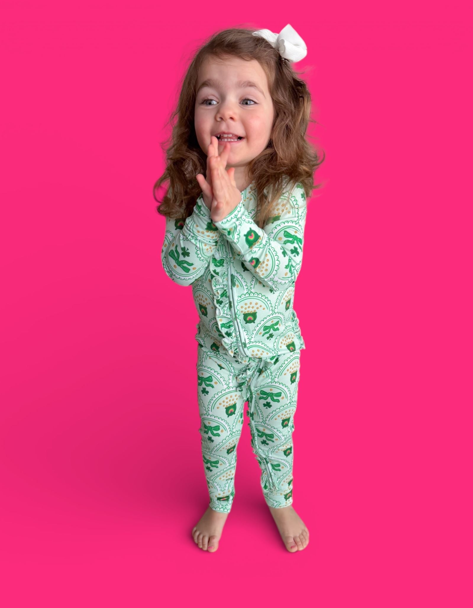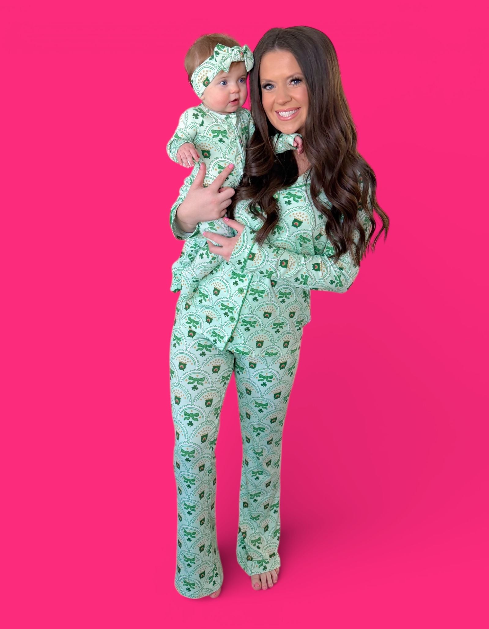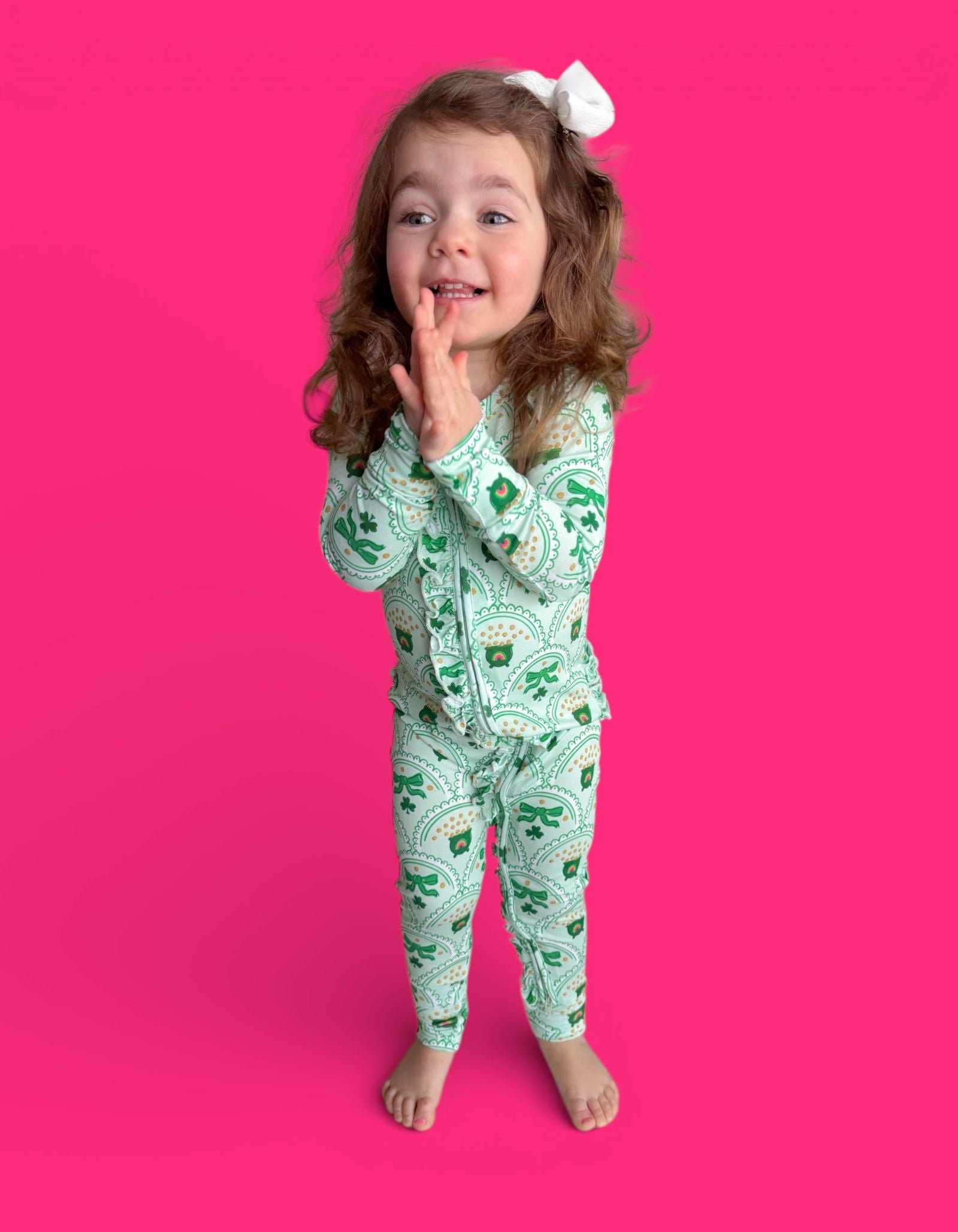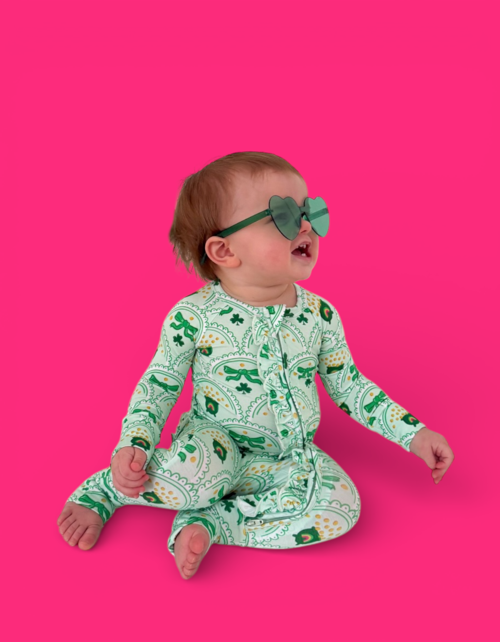 Lucky, adorable, and full of charm, the Clover & Coins Dream Ruffle Romper features a sweet scalloped print decorated with shamrocks, lucky coins, and tiny bows, paired with playful ruffles for the cutest festive touch. Soft, stretchy, and perfect for St. Patrick’s Day photos, everyday play, and all-day comfort, this romper brings a bright and cheerful sparkle to every moment. 💚✨
