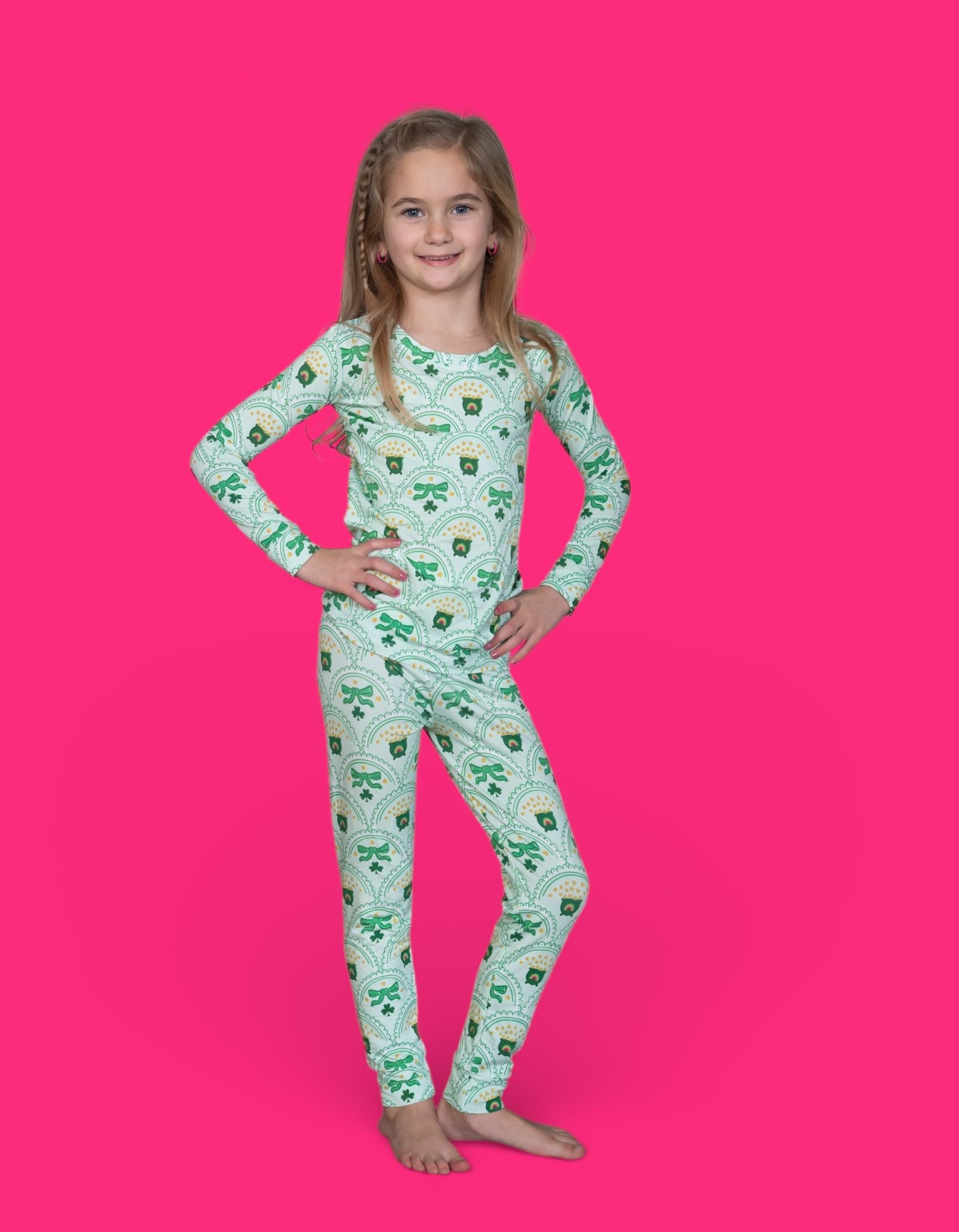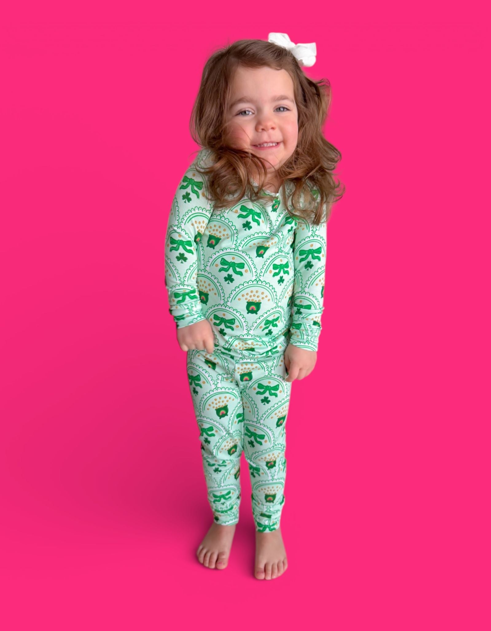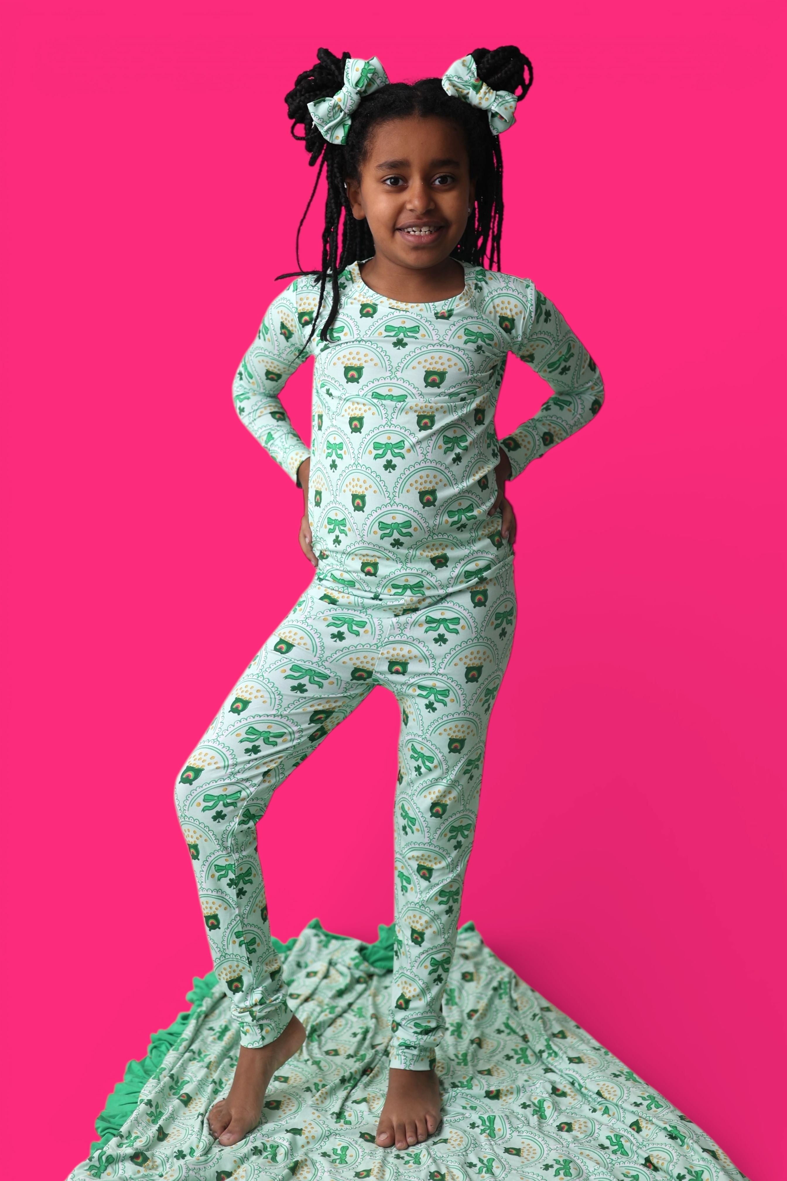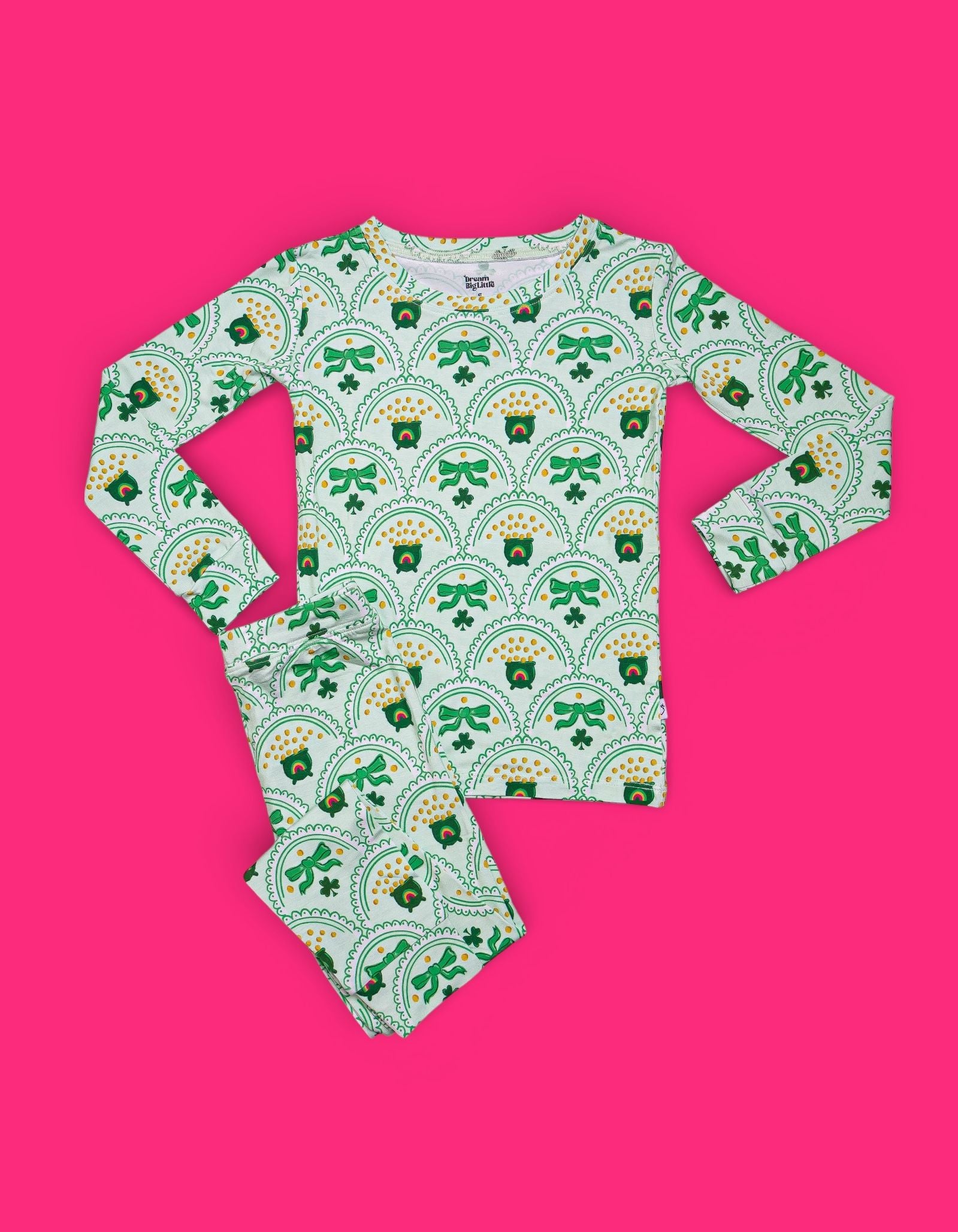 Bright, fun, and full of lucky charm, the Clover & Coins Dream Set features matching top-and-bottom pieces covered in a scalloped pattern of shamrocks, lucky coins, and sweet bows. Soft, stretchy, and perfect for play, sleep, and celebrating St. Patrick’s Day in cozy style, this set brings a festive sparkle to every little moment. 💚✨