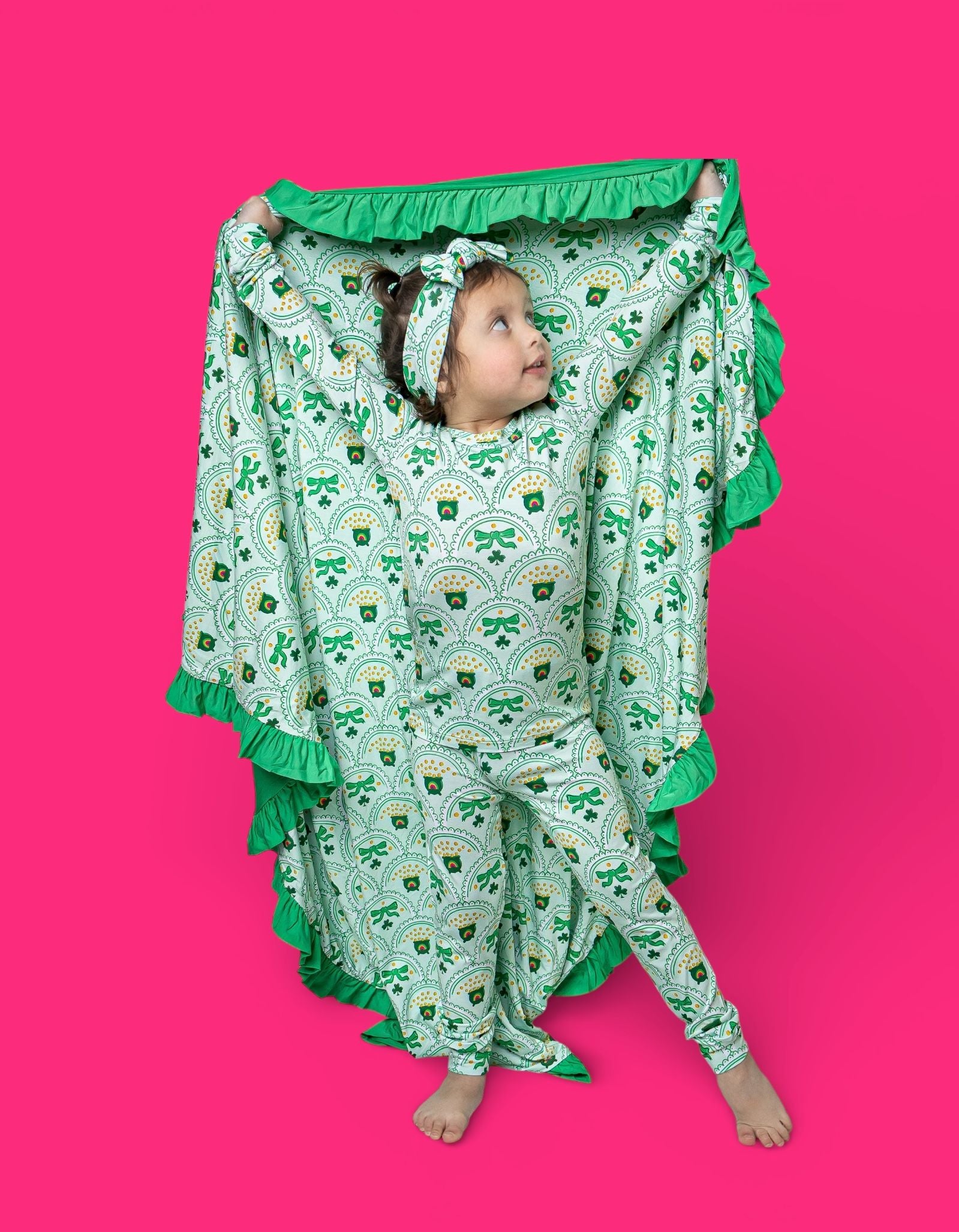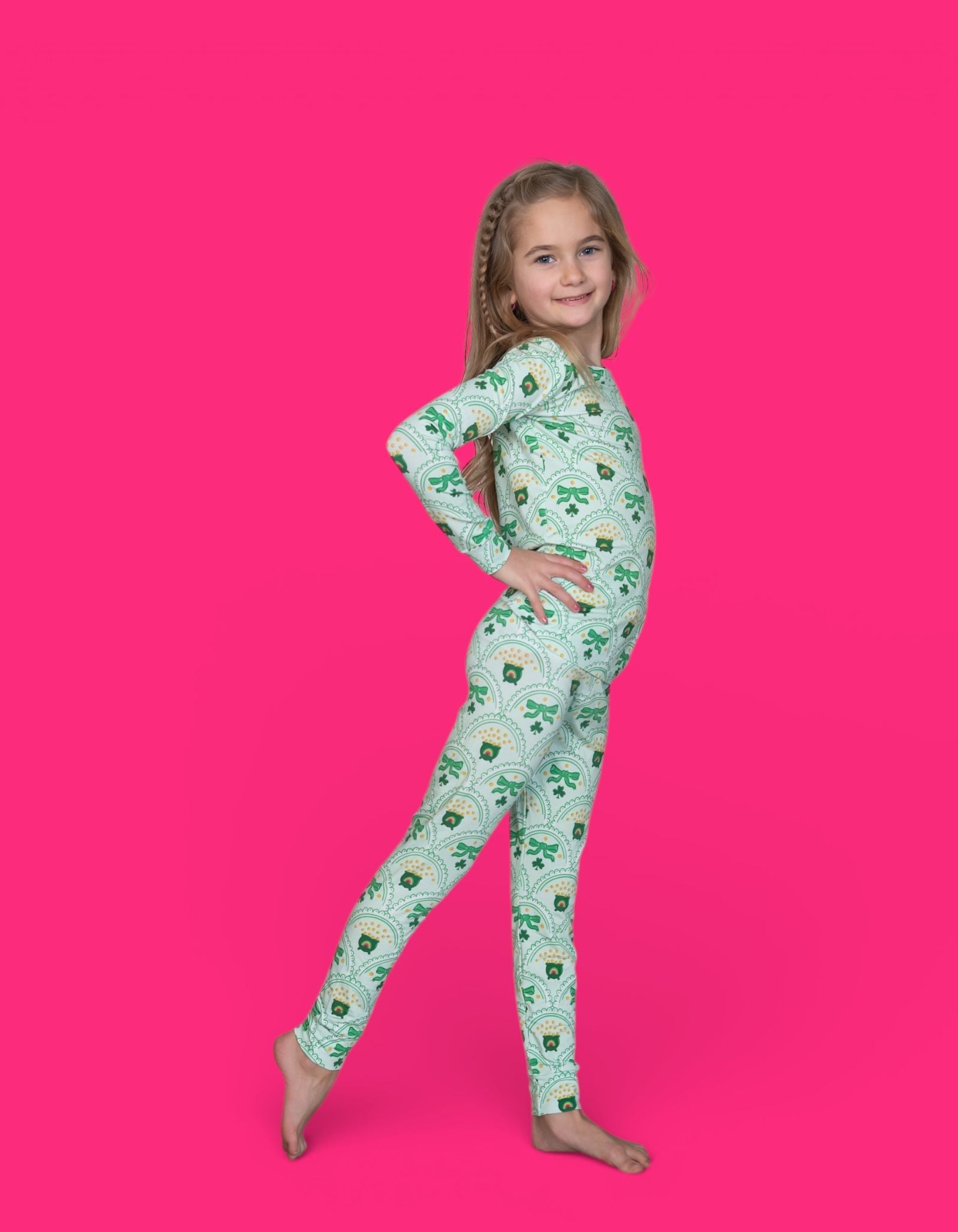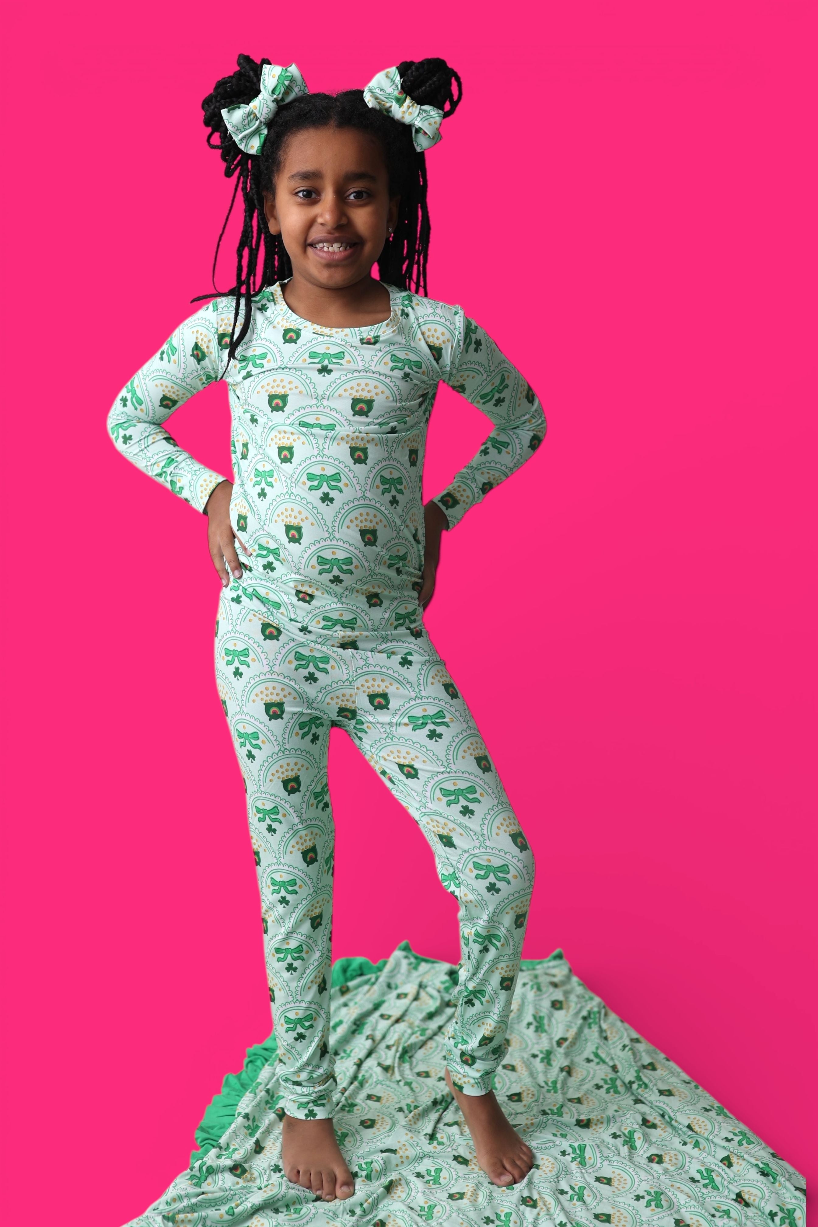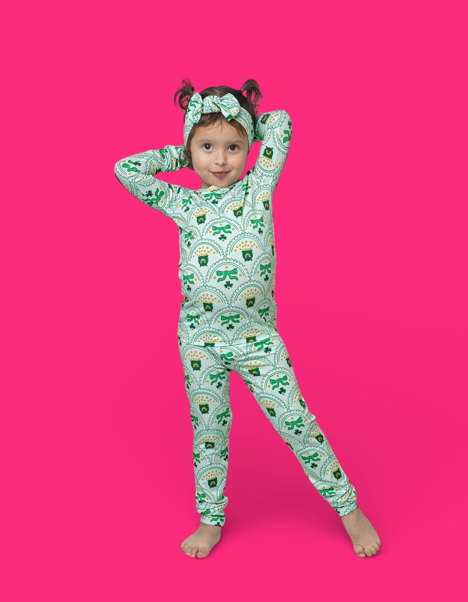 Bright, fun, and full of lucky charm, the Clover & Coins Dream Set features matching top-and-bottom pieces covered in a scalloped pattern of shamrocks, lucky coins, and sweet bows. Soft, stretchy, and perfect for play, sleep, and celebrating St. Patrick’s Day in cozy style, this set brings a festive sparkle to every little moment. 💚✨