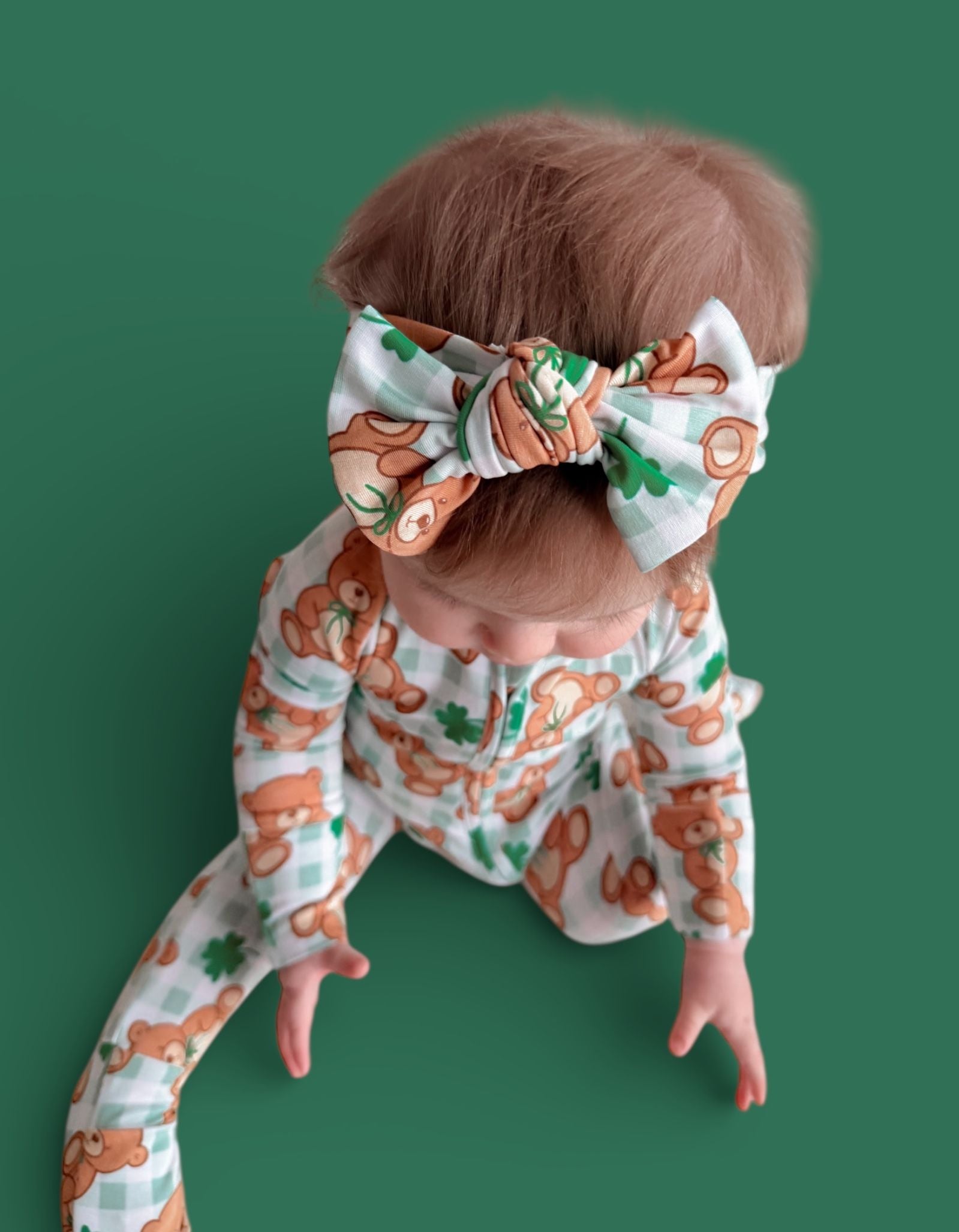 Add a lucky little finishing touch! The Teddy O’Luck Dream Bow features a soft green gingham print covered in sweet teddy bears and four-leaf clovers, creating the perfect accessory for St. Patrick’s Day outfits, sibling matching, and everyday charm. Cute, comfy, and the perfect pop of festive fun. 💚☘️