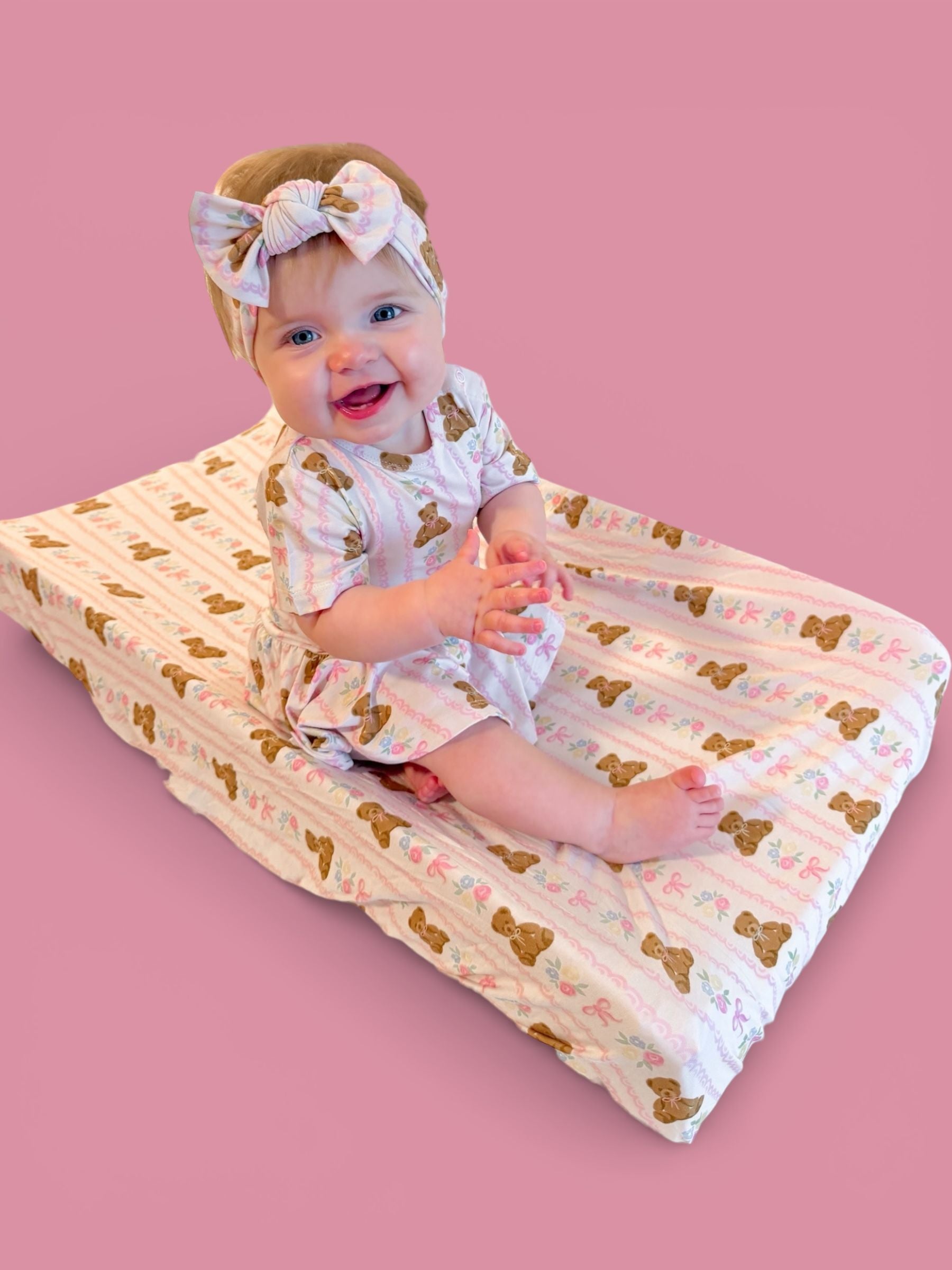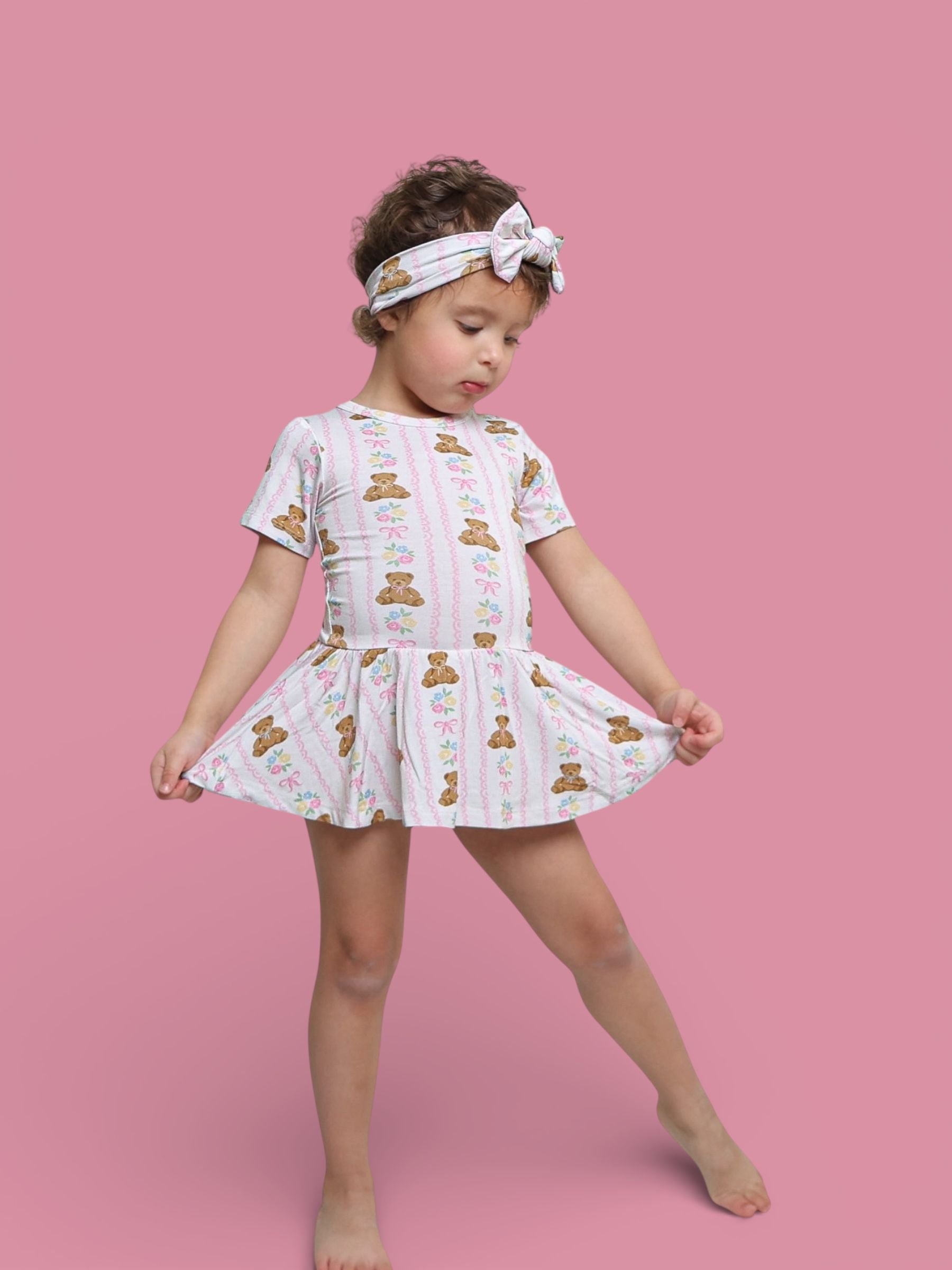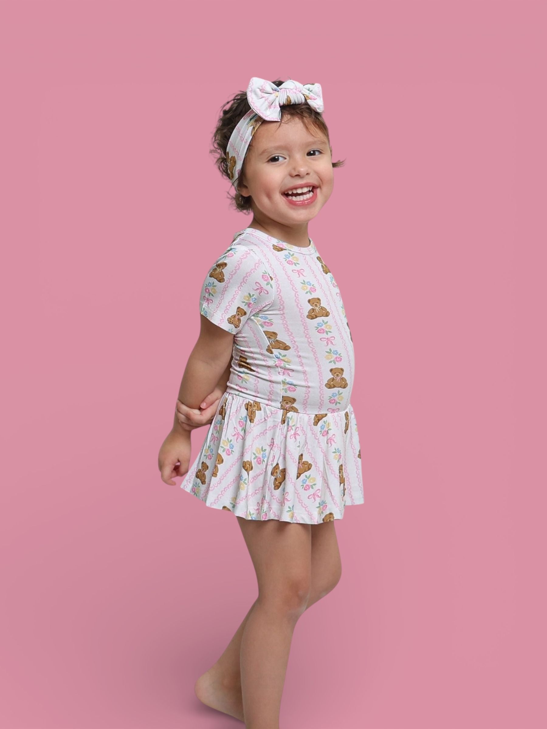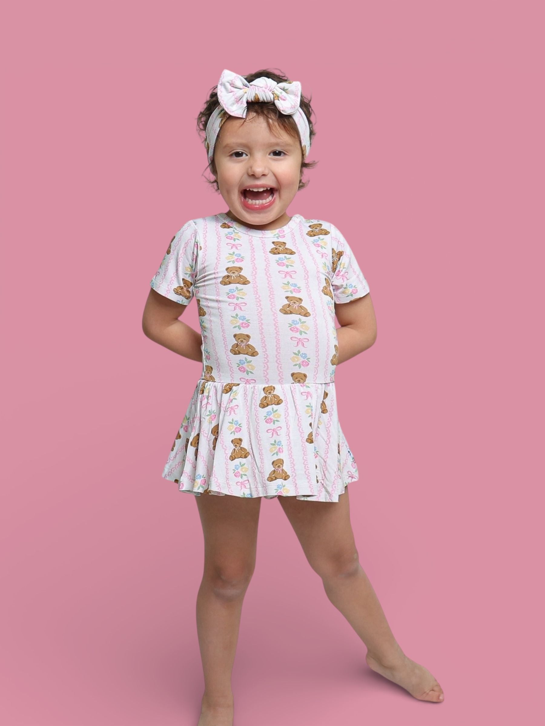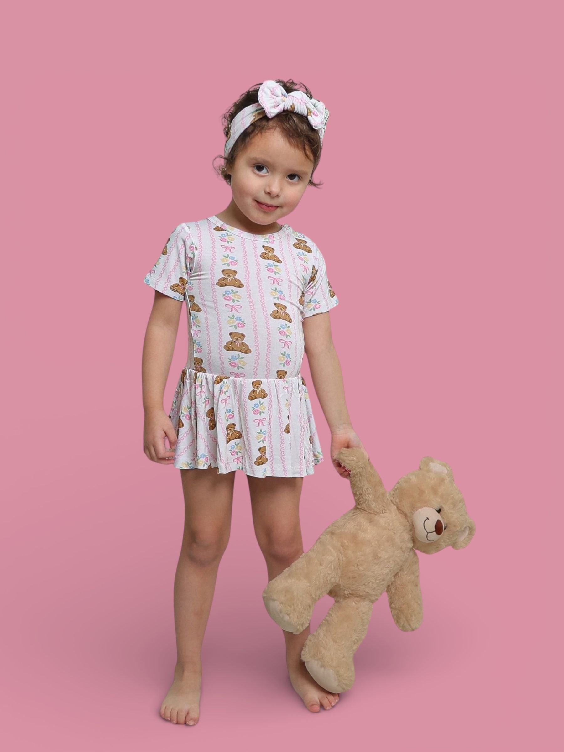 Your little sweetheart will be cute as can BEAR! This buttery-soft bodysuit dress features cuddly teddy bears, soft florals, and pink bows—finished with a twirly skirt for extra girly charm. Built-in bodysuit = easy changes + comfy all-day wear! 💕✨