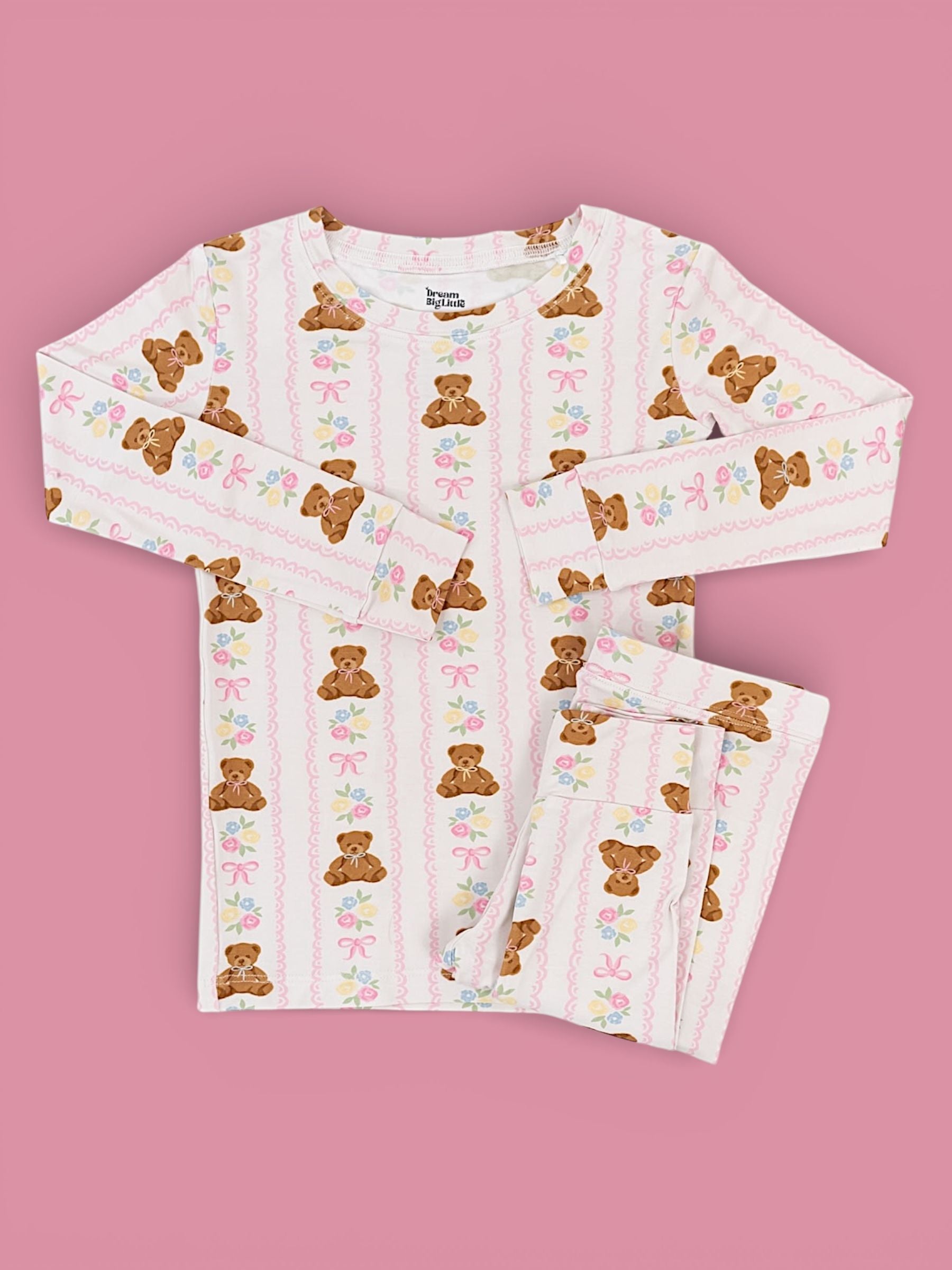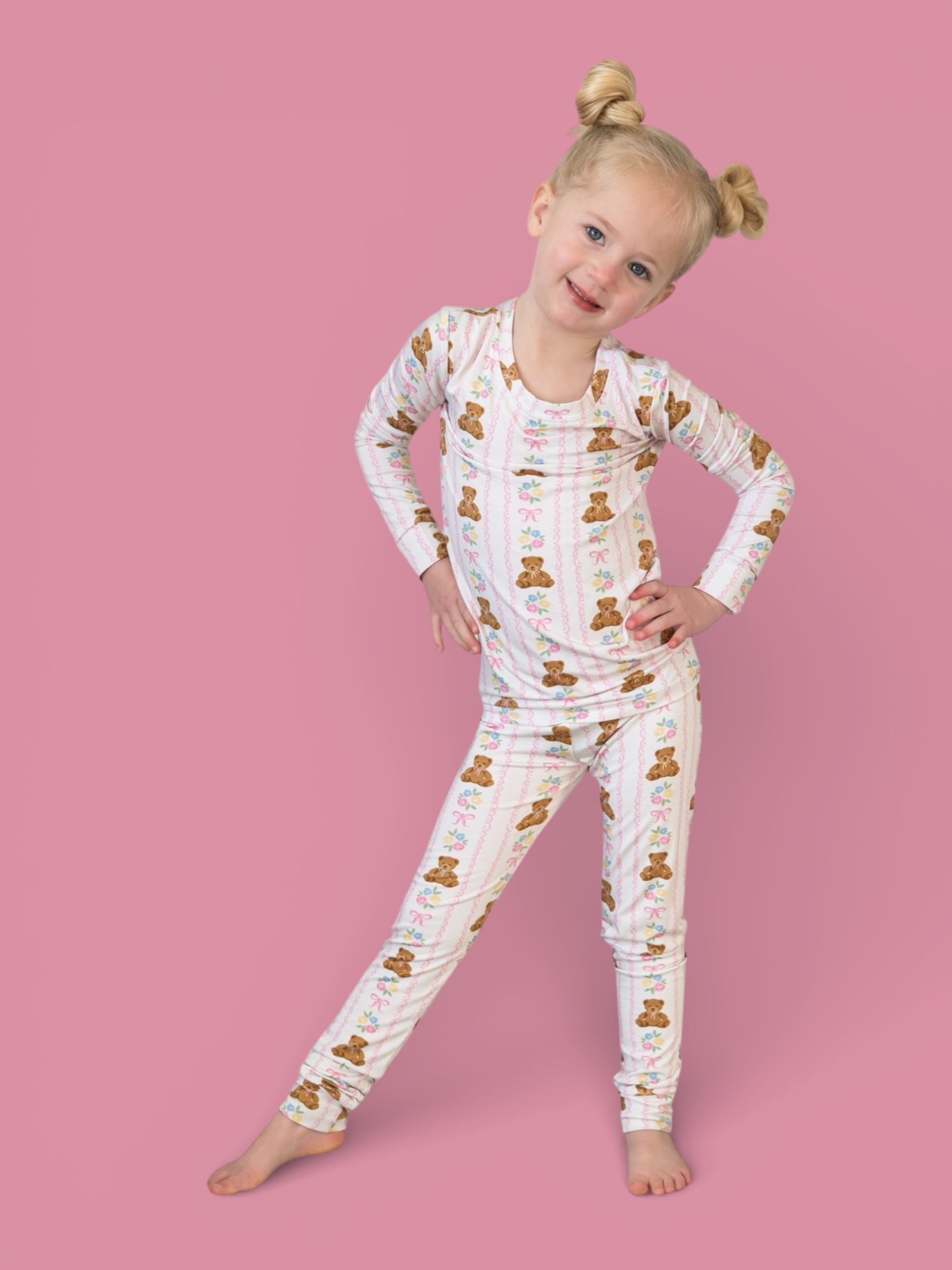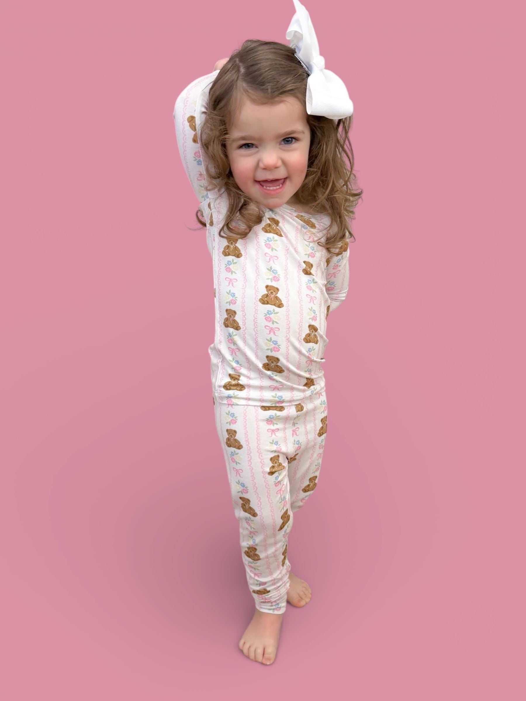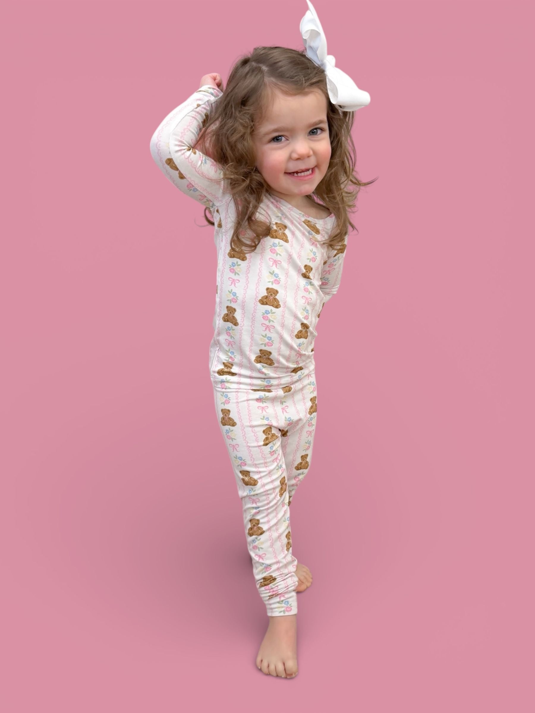 Soft, sweet, and oh-so-girly! This darling pajama set features cuddly bears, pastel florals, and pretty pink bows on our signature buttery-soft, super stretchy fabric. Perfect for cozy nights, playtime mornings, and all the snuggles in between. ✨💕