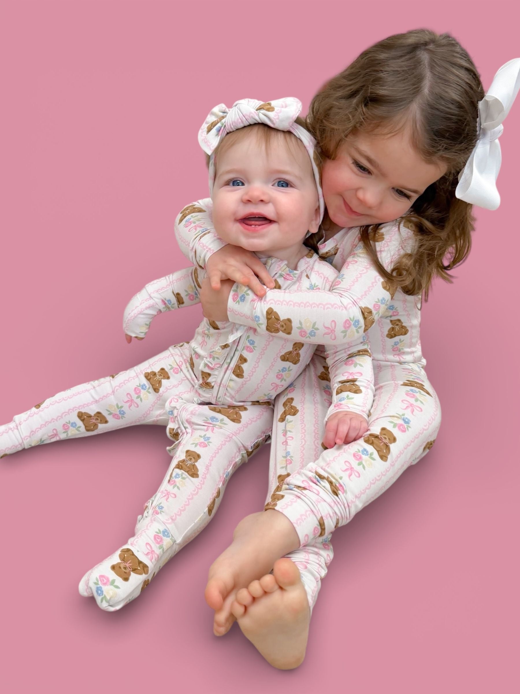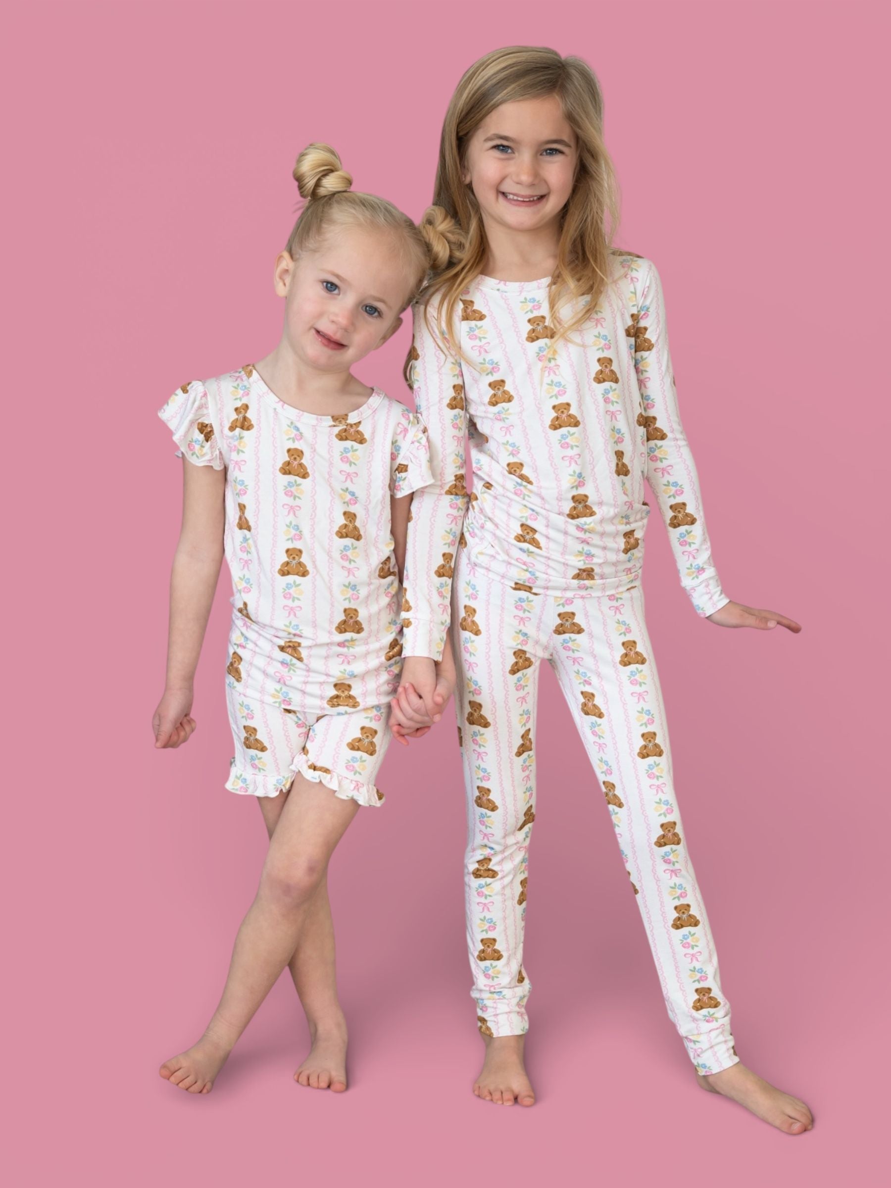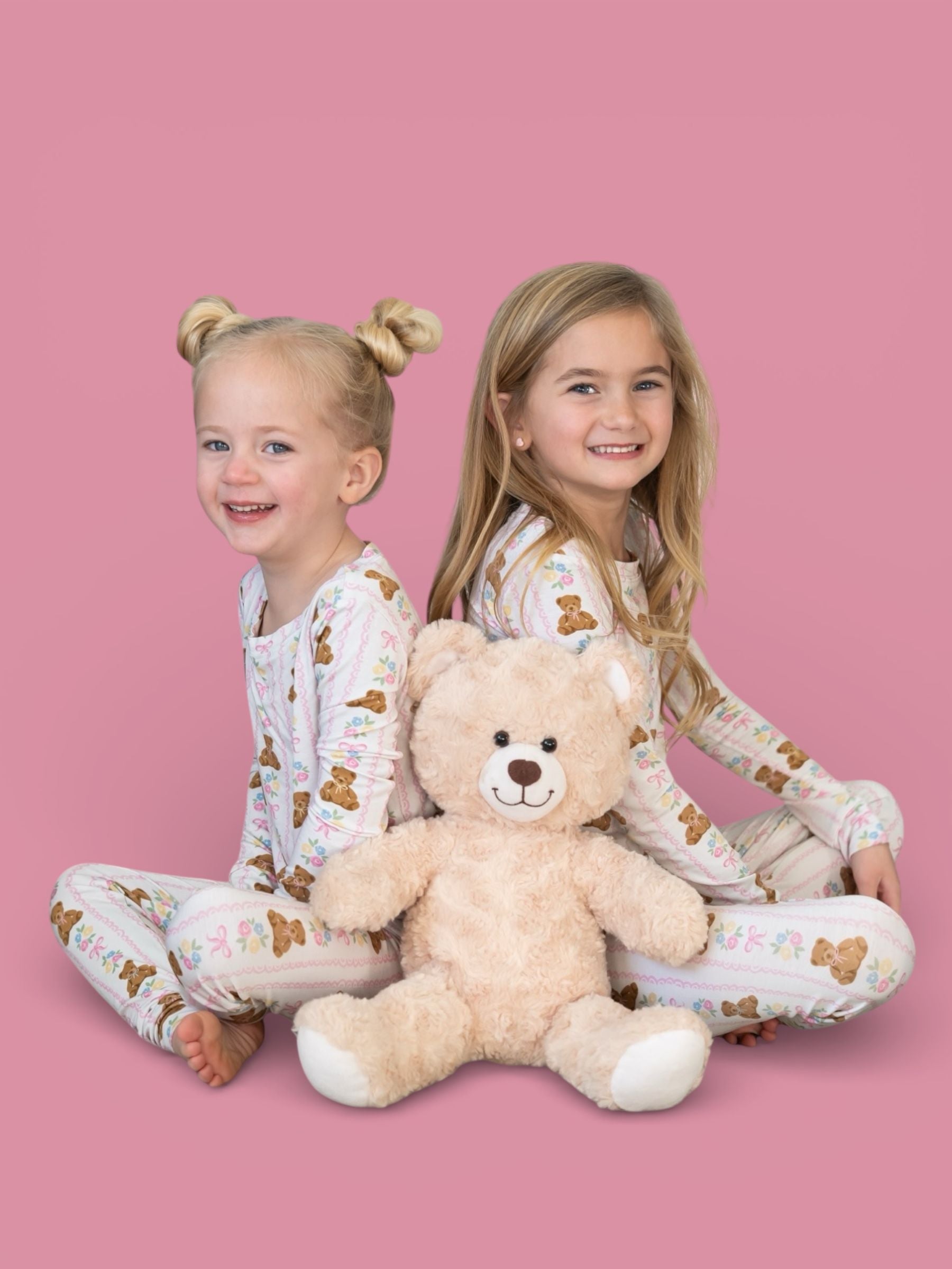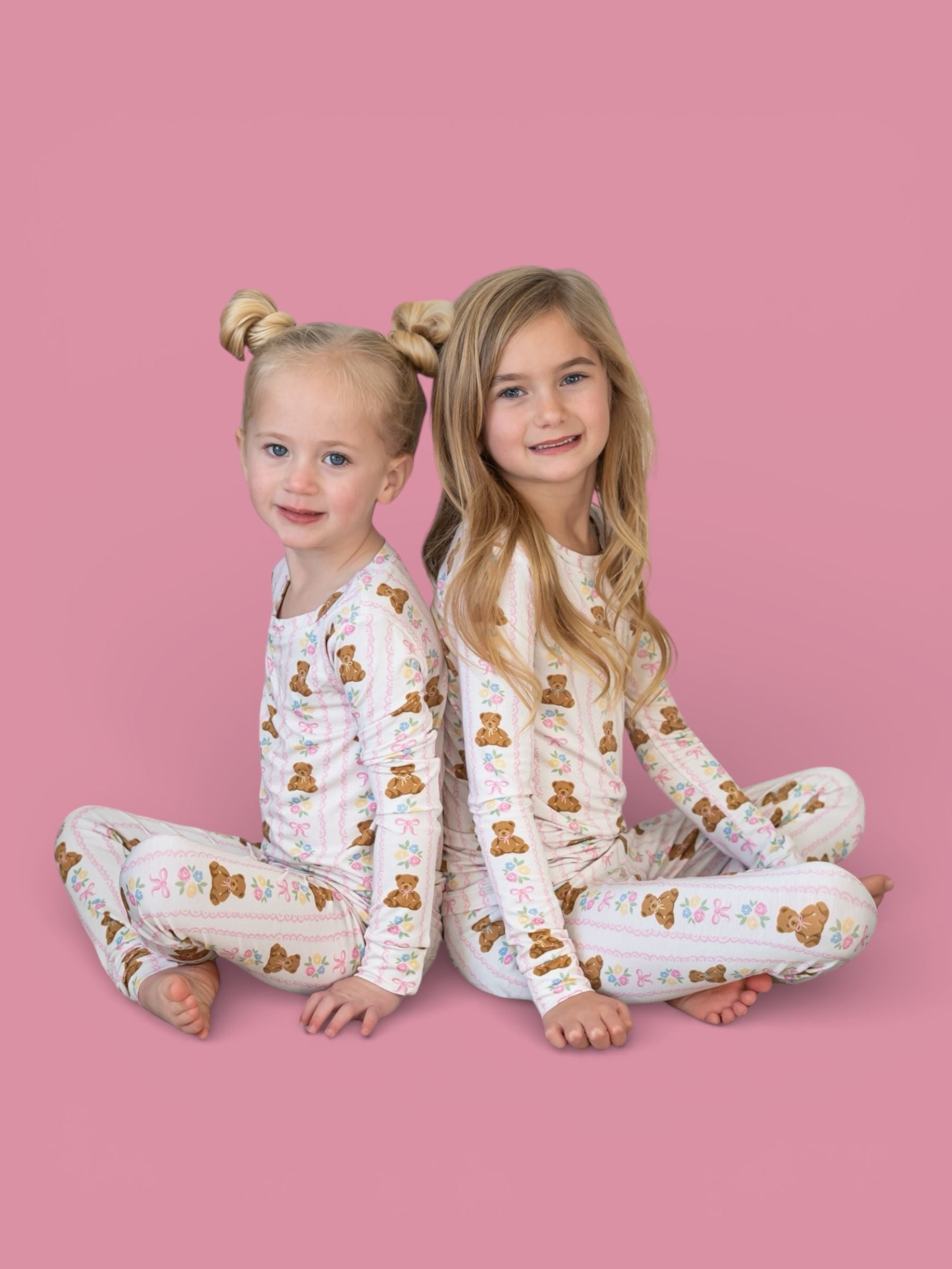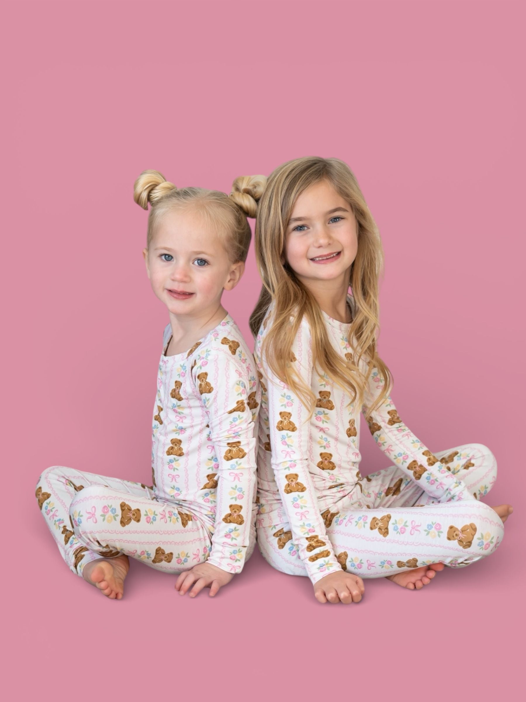Soft, sweet, and oh-so-girly! This darling pajama set features cuddly bears, pastel florals, and pretty pink bows on our signature buttery-soft, super stretchy fabric. Perfect for cozy nights, playtime mornings, and all the snuggles in between. ✨💕