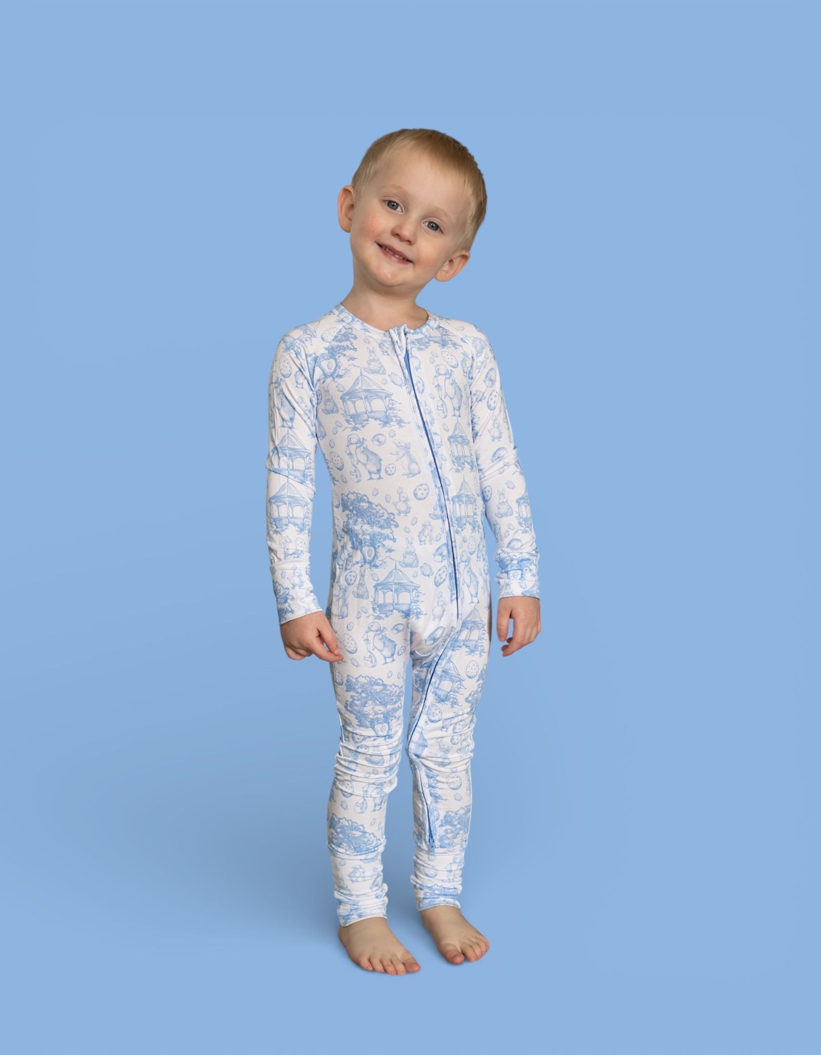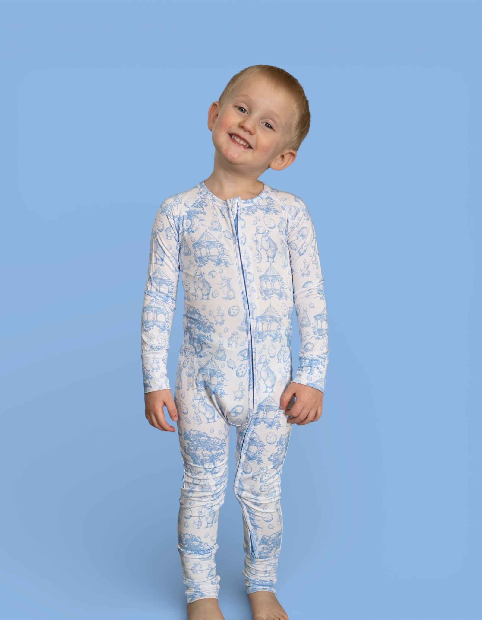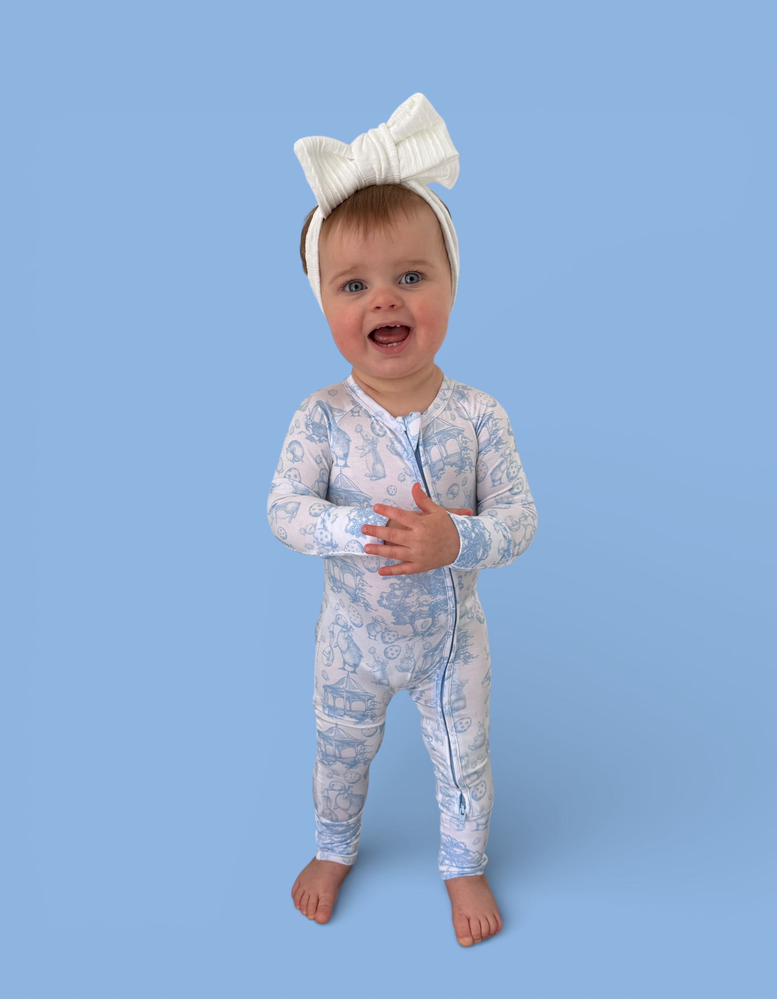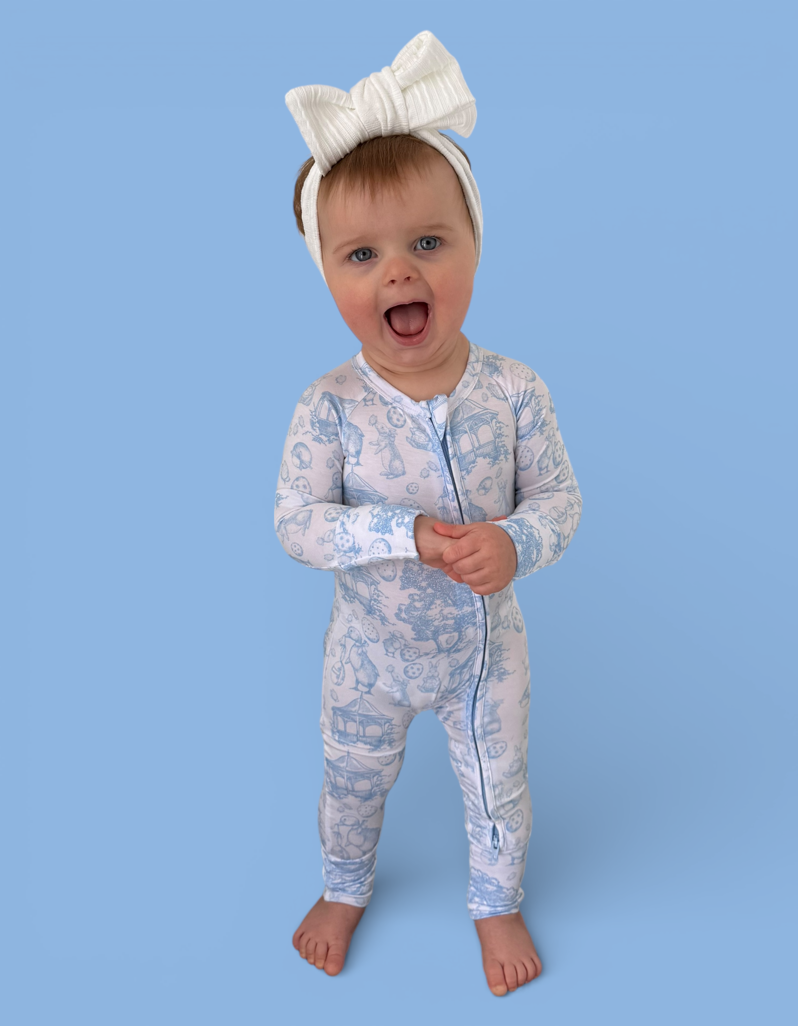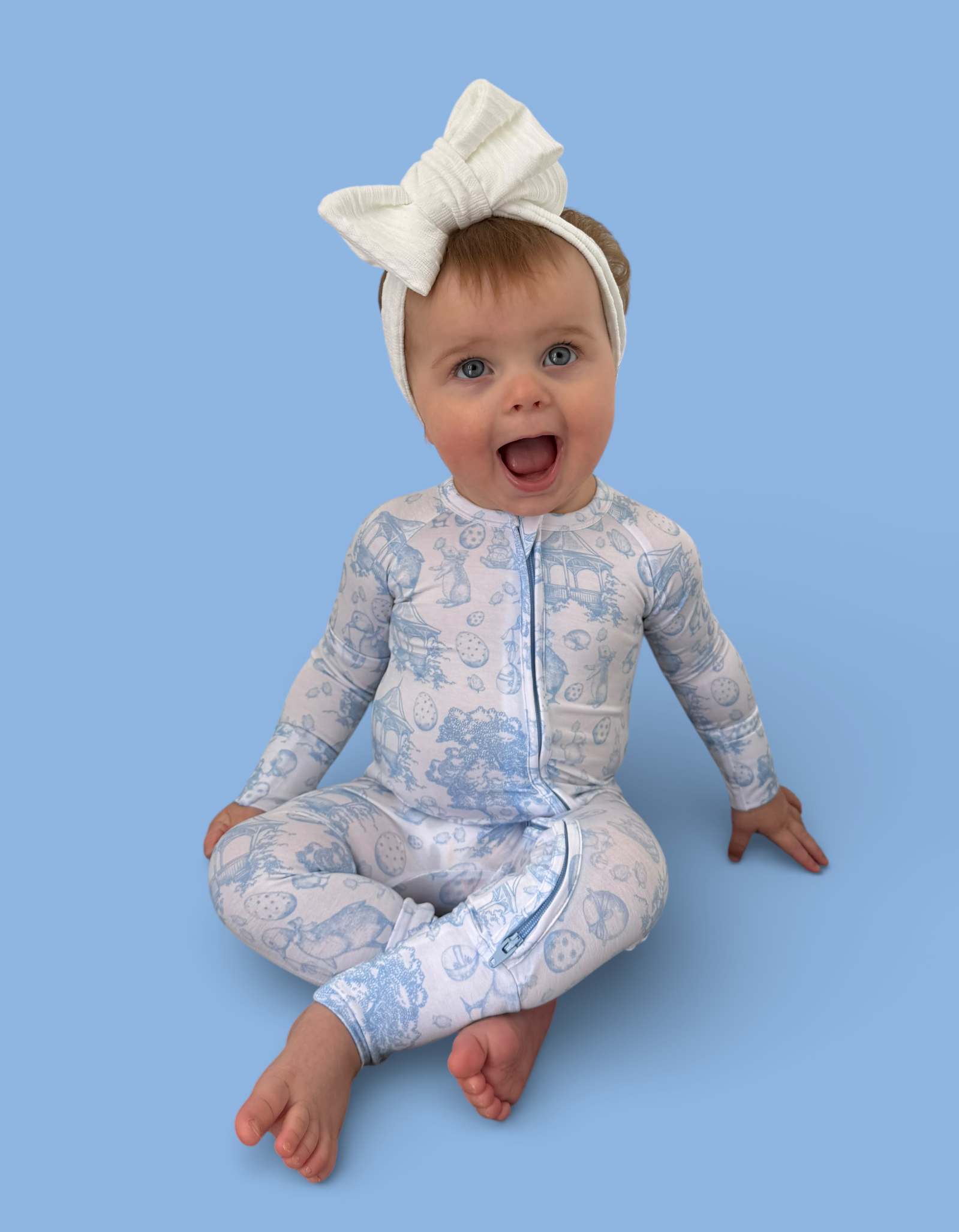 Timeless, elegant, and full of Easter charm. Our Bluebell Easter Toile Dream Romper features a delicate toile-style print in soft powder blue — complete with bunnies, eggs, spring florals, and storybook scenes that feel straight out of a fairytale garden. Perfect for Easter morning, spring photos, and sweet seasonal snuggles. 🌿✨