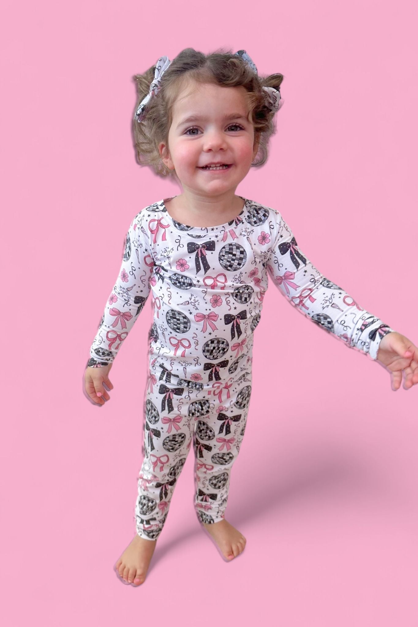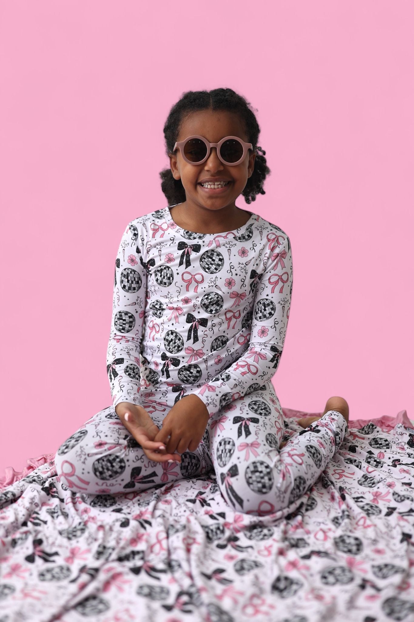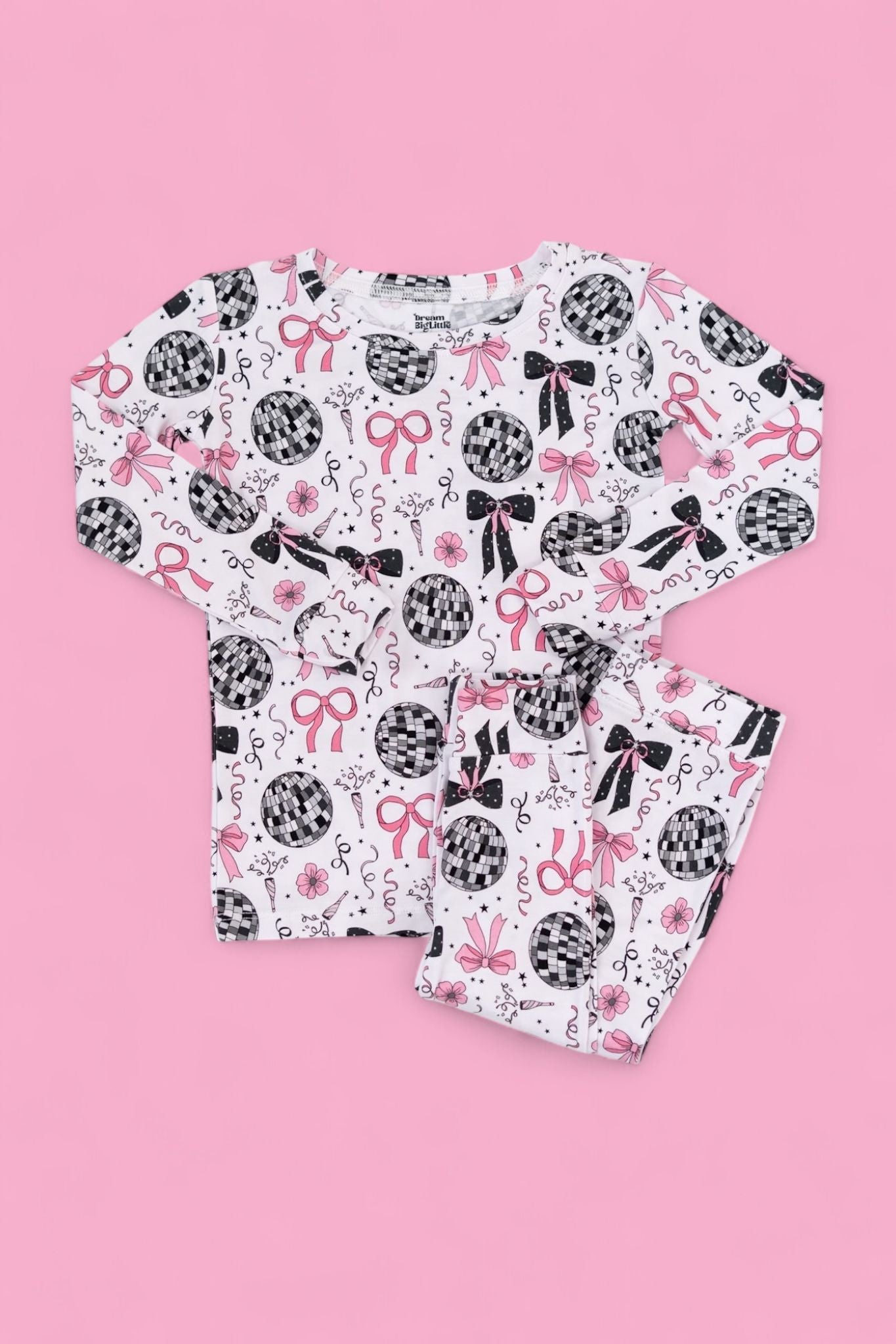 Bring on the sparkle and snuggles with our Midnight Disco Darling Dream Set! Covered in glitzy disco balls, twinkling stars, festive confetti, and pink bows, this dreamy set is perfect for your little star. Made from buttery-soft bamboo, it’s cozy enough for bedtime and cute enough for a pajama party!