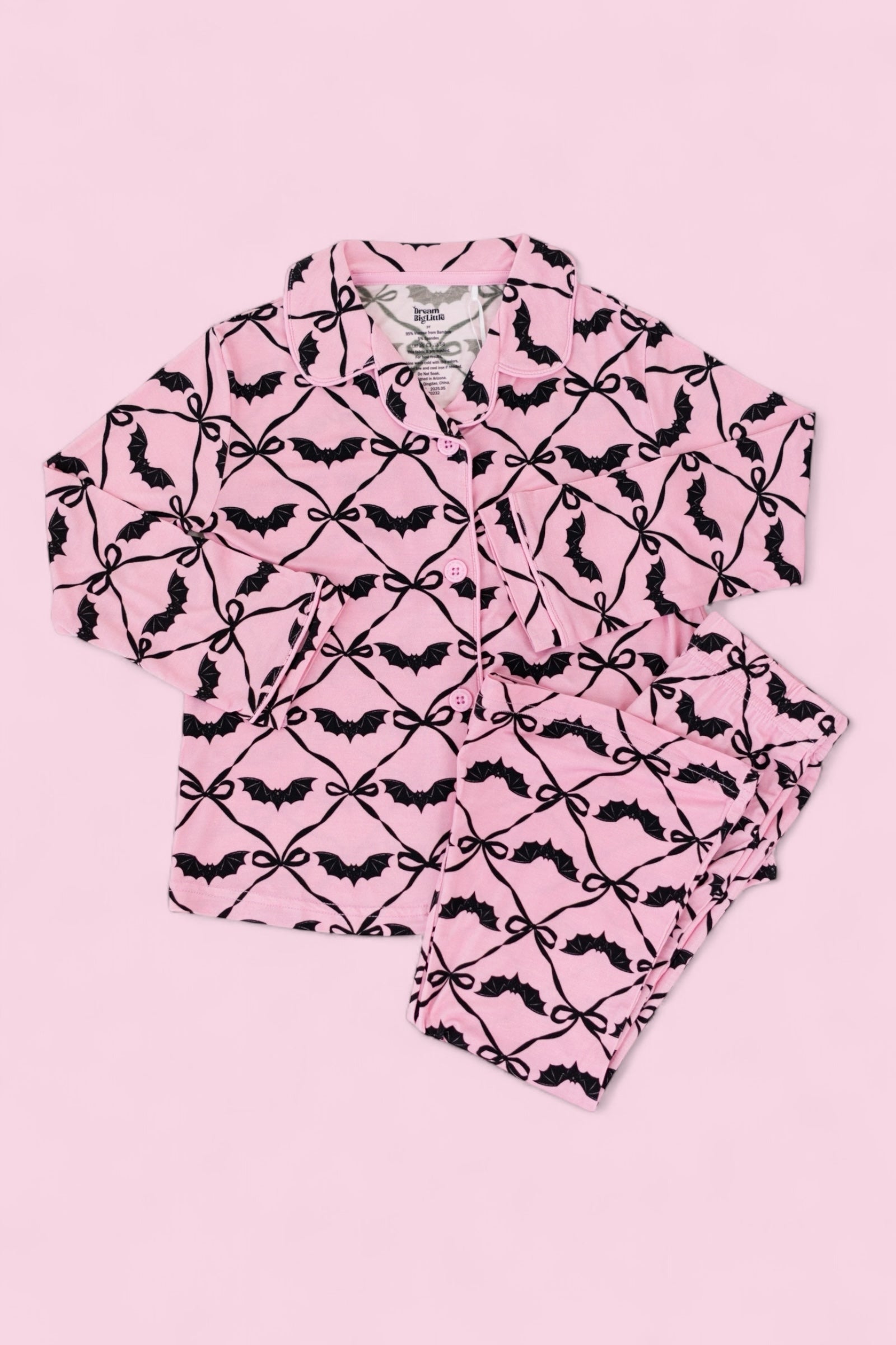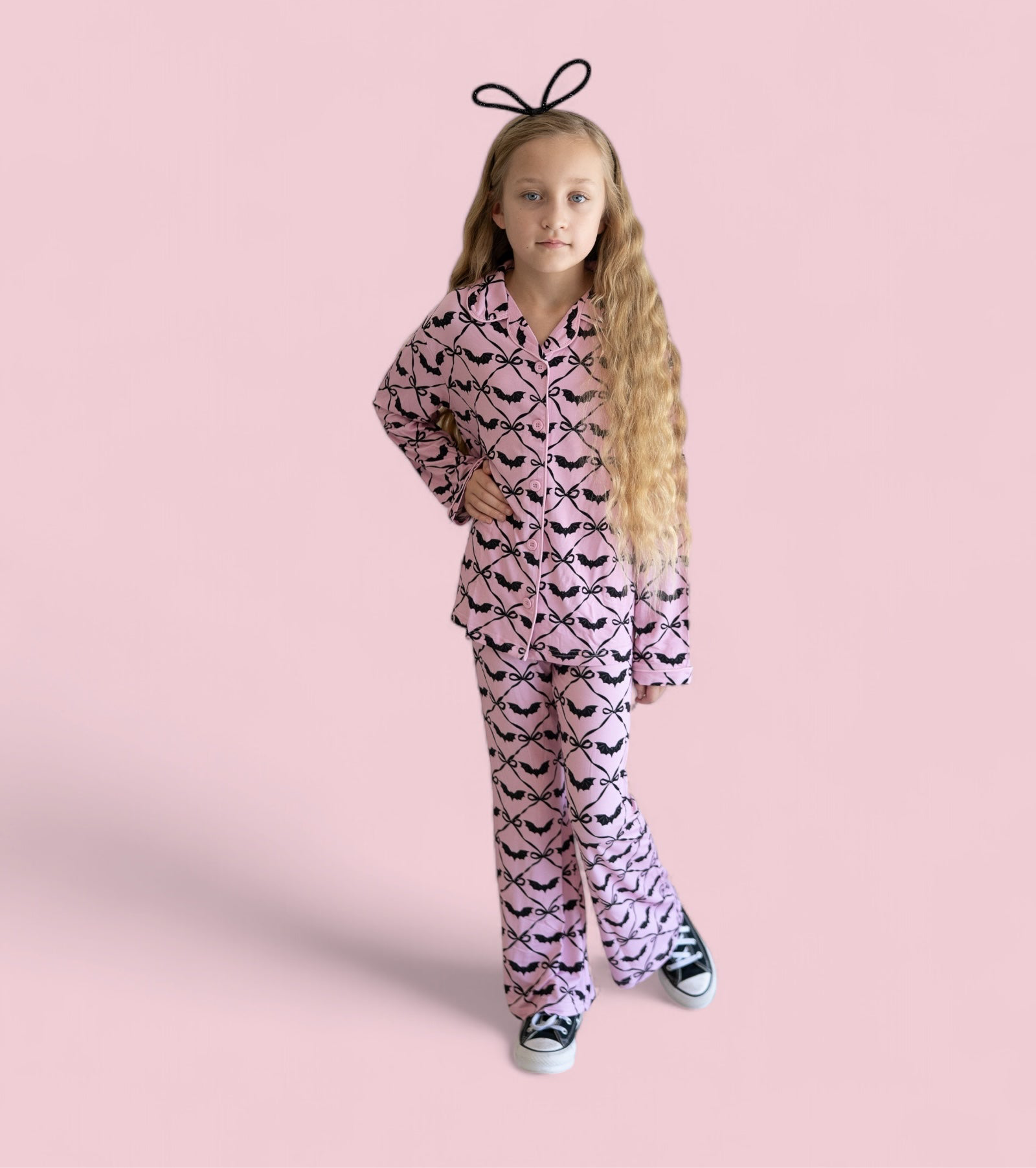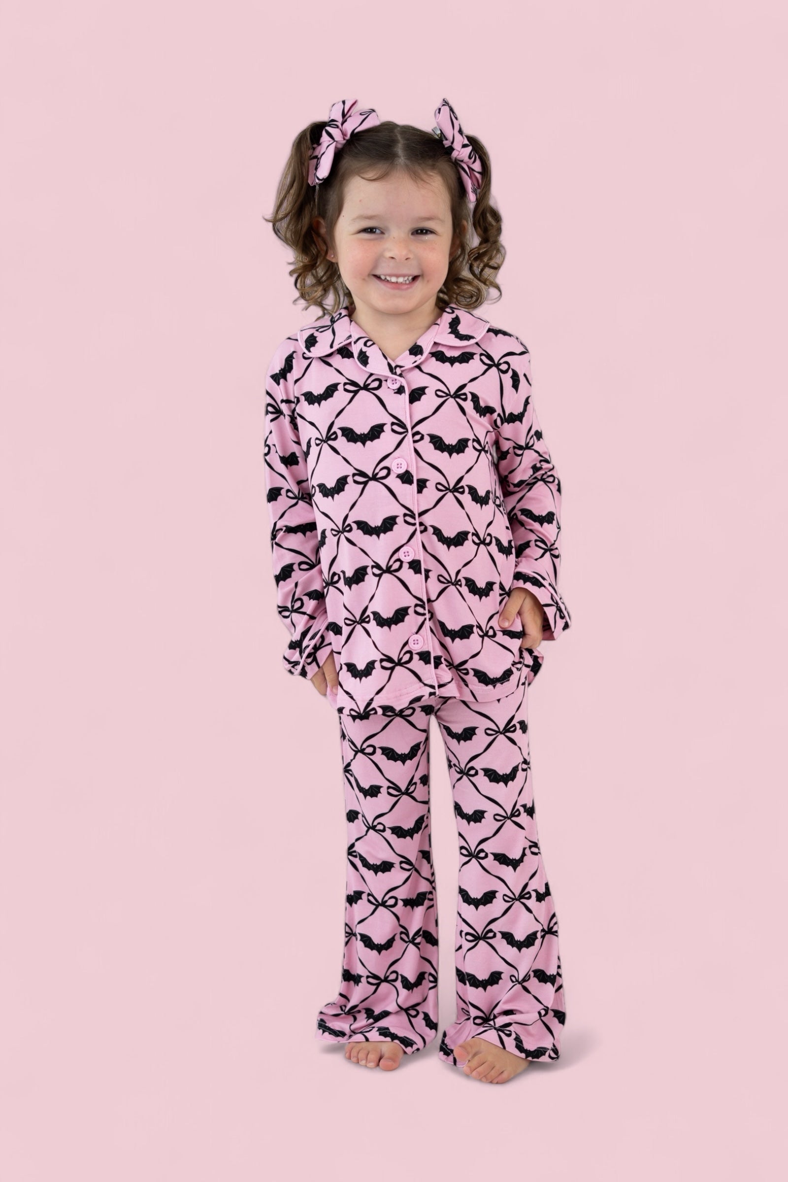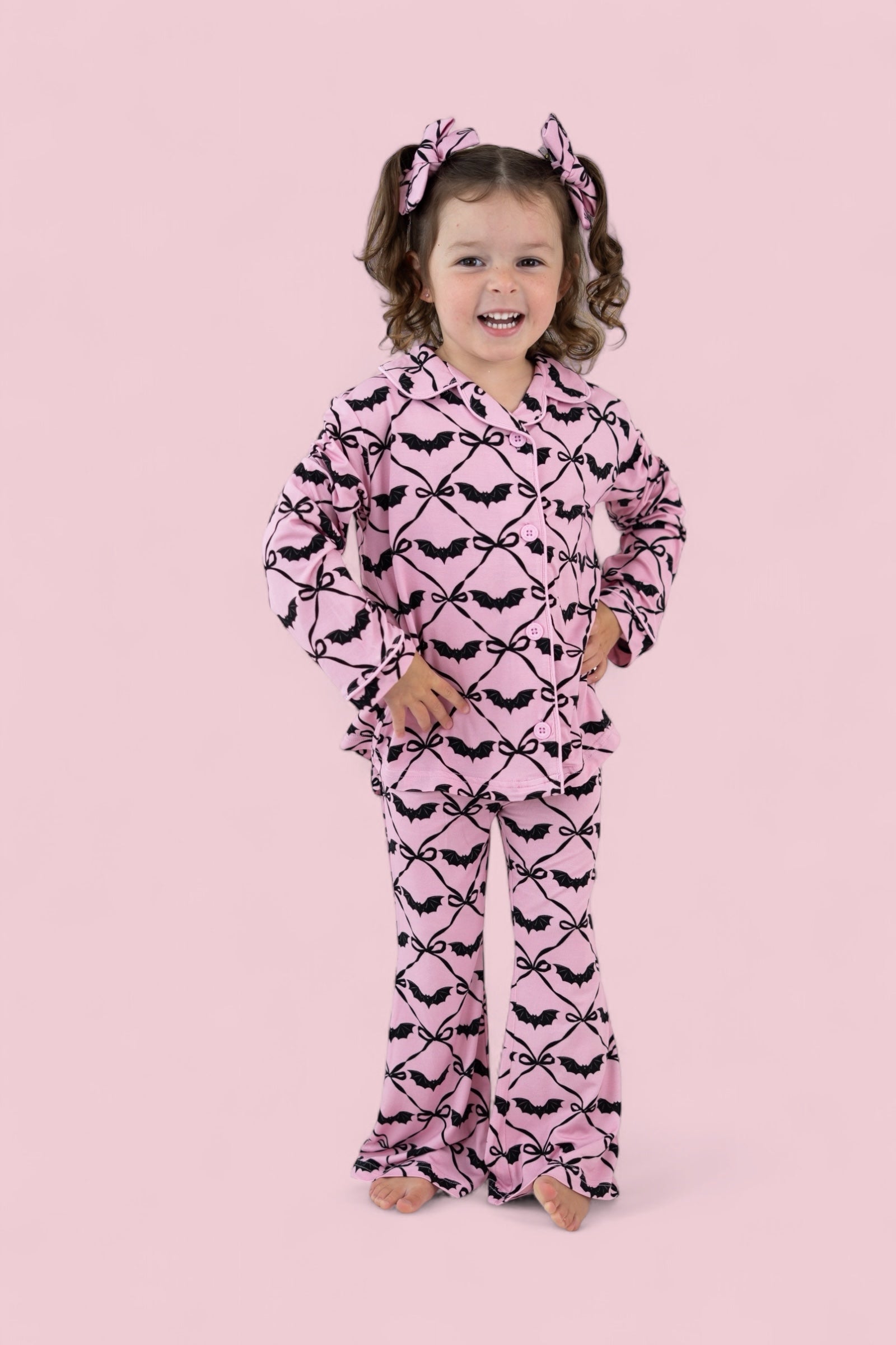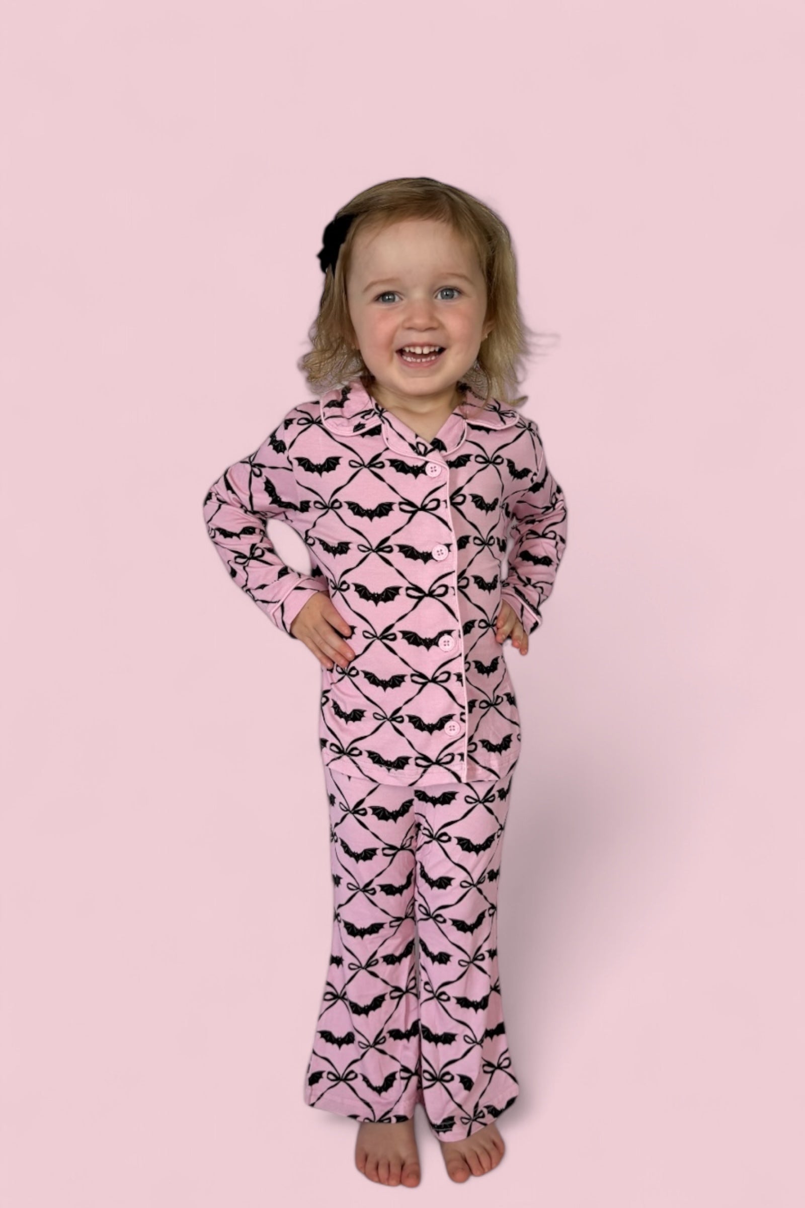 Let her swirl into spooky season with the Batty Bows Dream Girl’s Flare Set! Featuring an adorable all-over print of black bows and bats on a soft pink background, this two-piece set is made for playful fall days and cozy nights. With buttery-soft fabric and flowy flare pants, it’s equal parts comfy and charming—perfect for matching with siblings or twirling through Halloween fun.