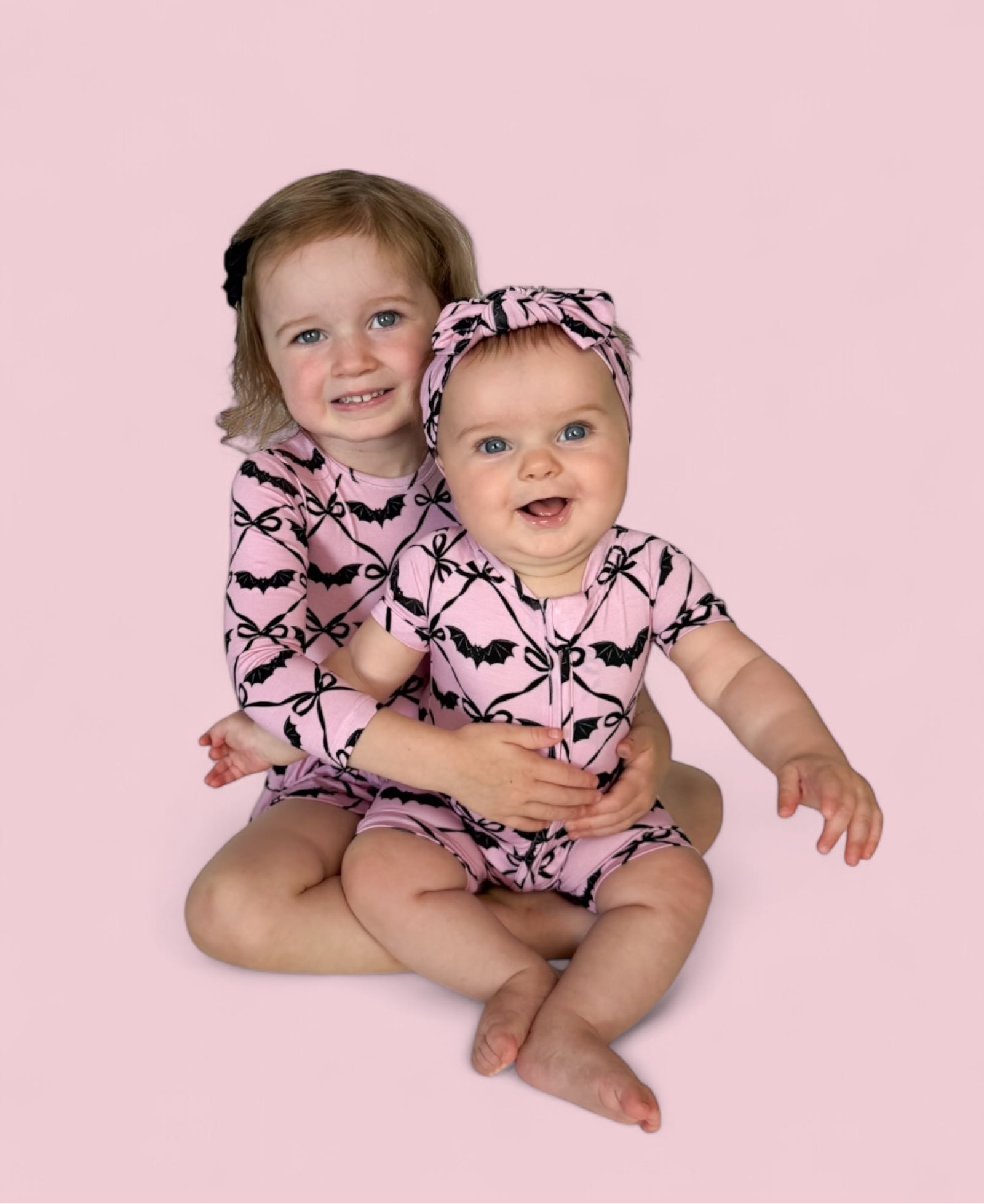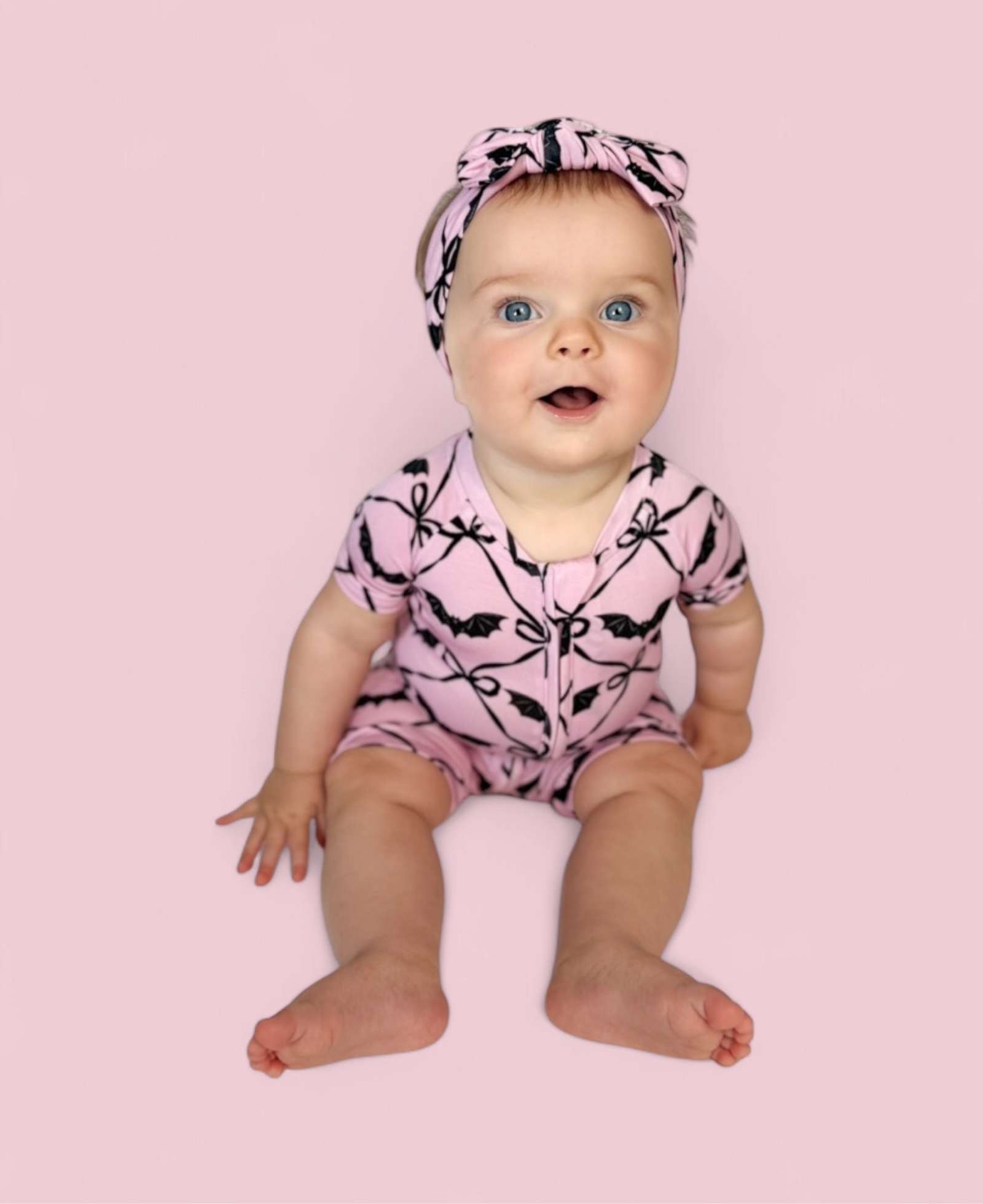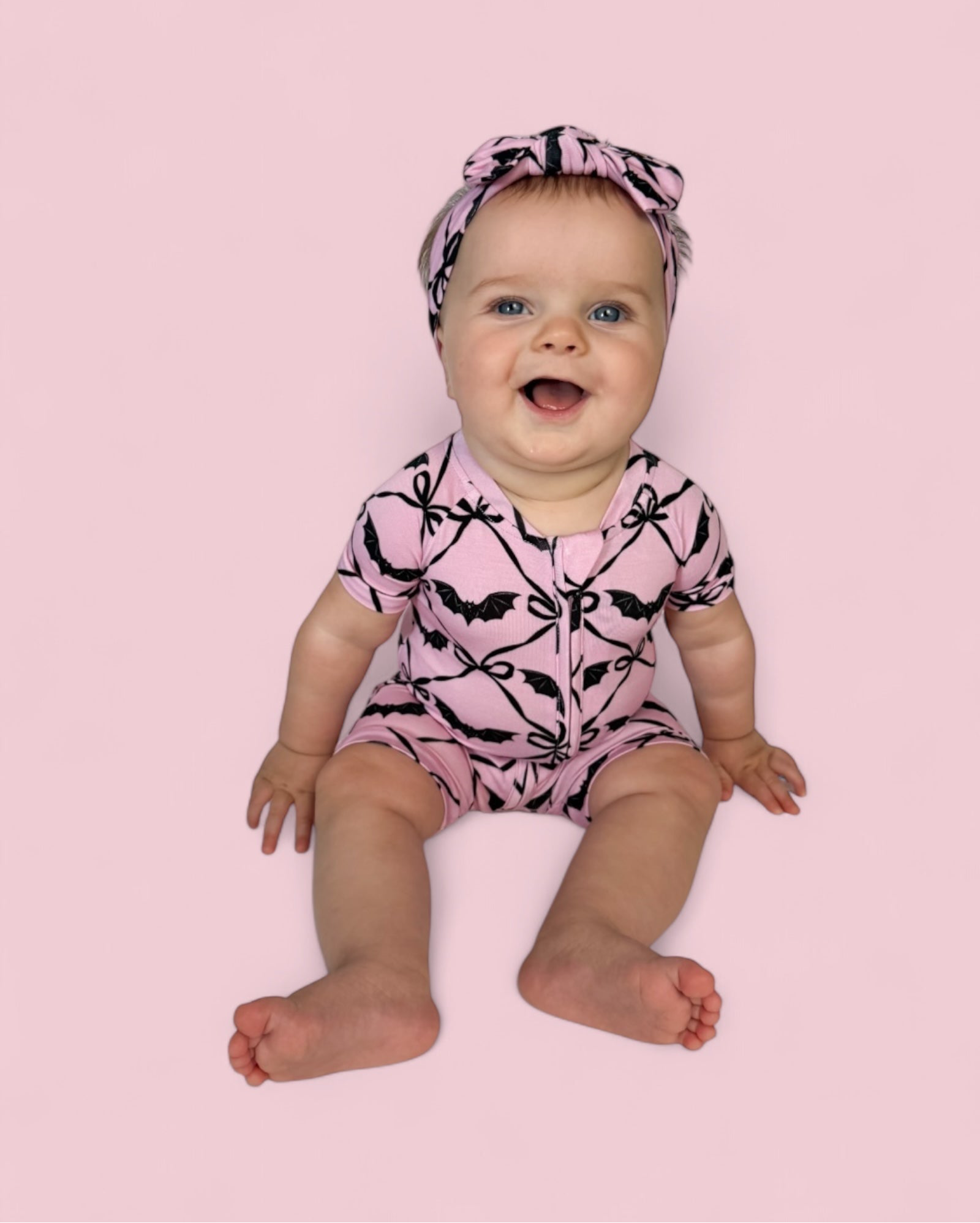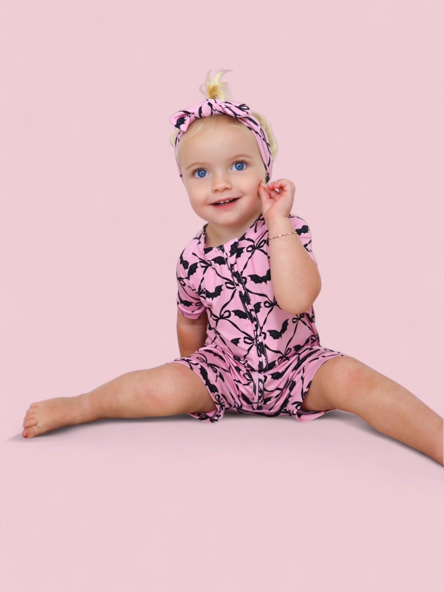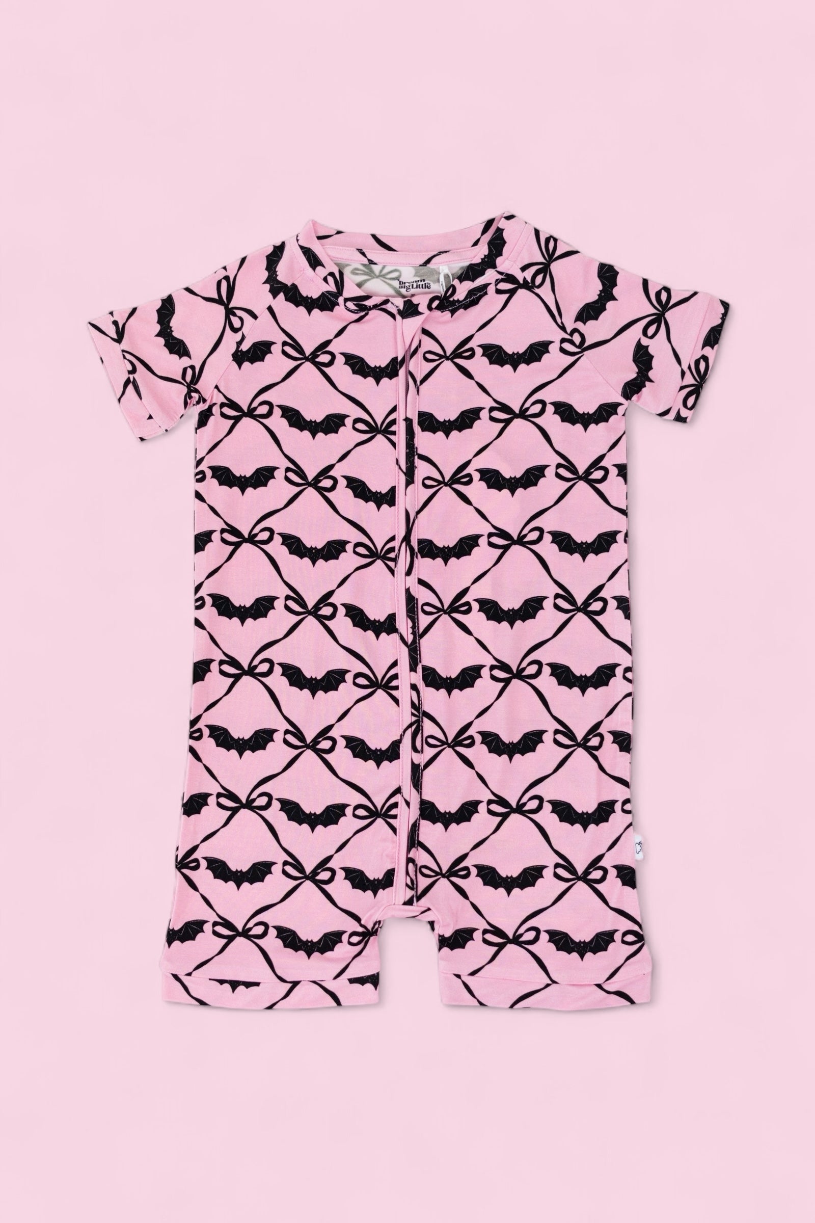 Bedtime gets a spooky-cute upgrade with the Batty Bows Dream Shortie! Featuring a pink background covered in black bows and fluttery bats, this one-piece zip romper is perfect for warm fall nights, Halloween sleepovers, and cozy mornings. With short sleeves, short legs, and our signature buttery-soft fabric, it's comfy, festive, and fang-tastically fun!