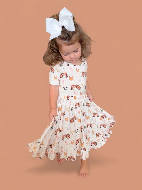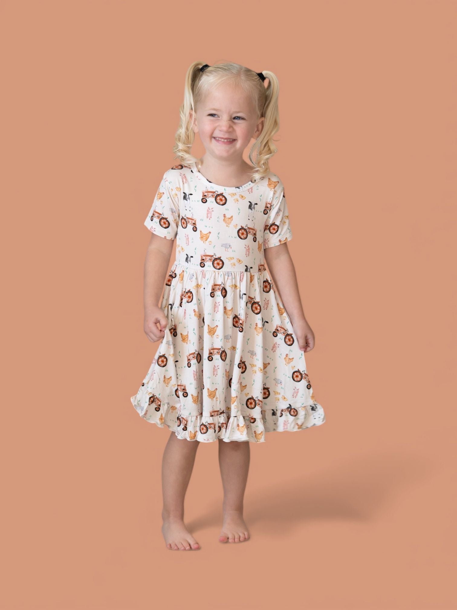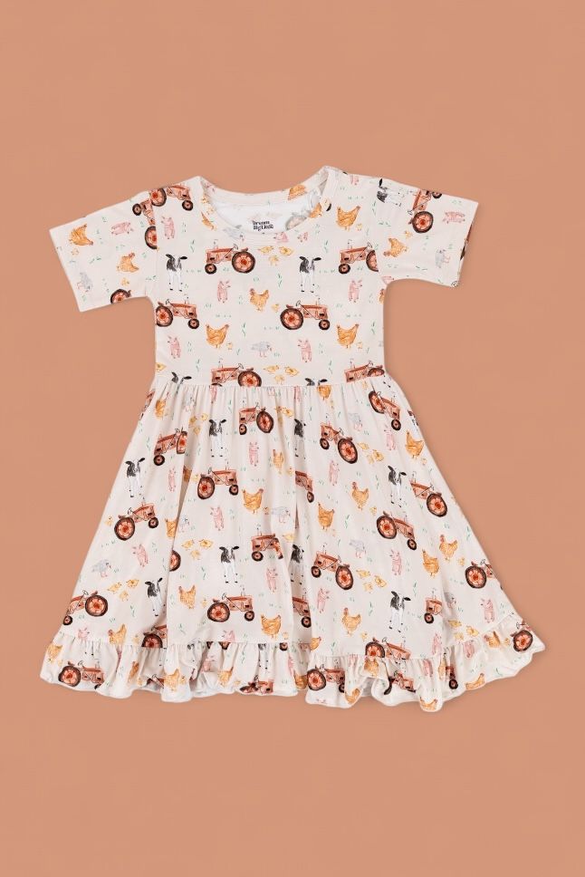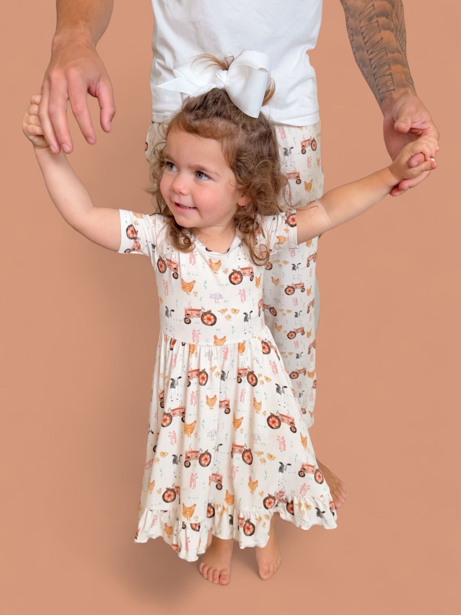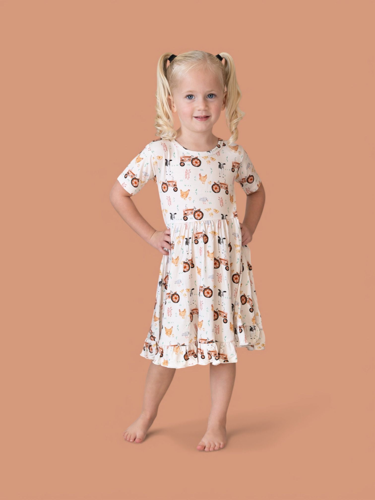 Bring the barnyard charm to her wardrobe with this darling ruffle dress! Featuring sweet farm animals, soft bamboo fabric, and the cutest ruffle details, this dress is perfect for twirling through playtime, nap time, or story time on the farm.