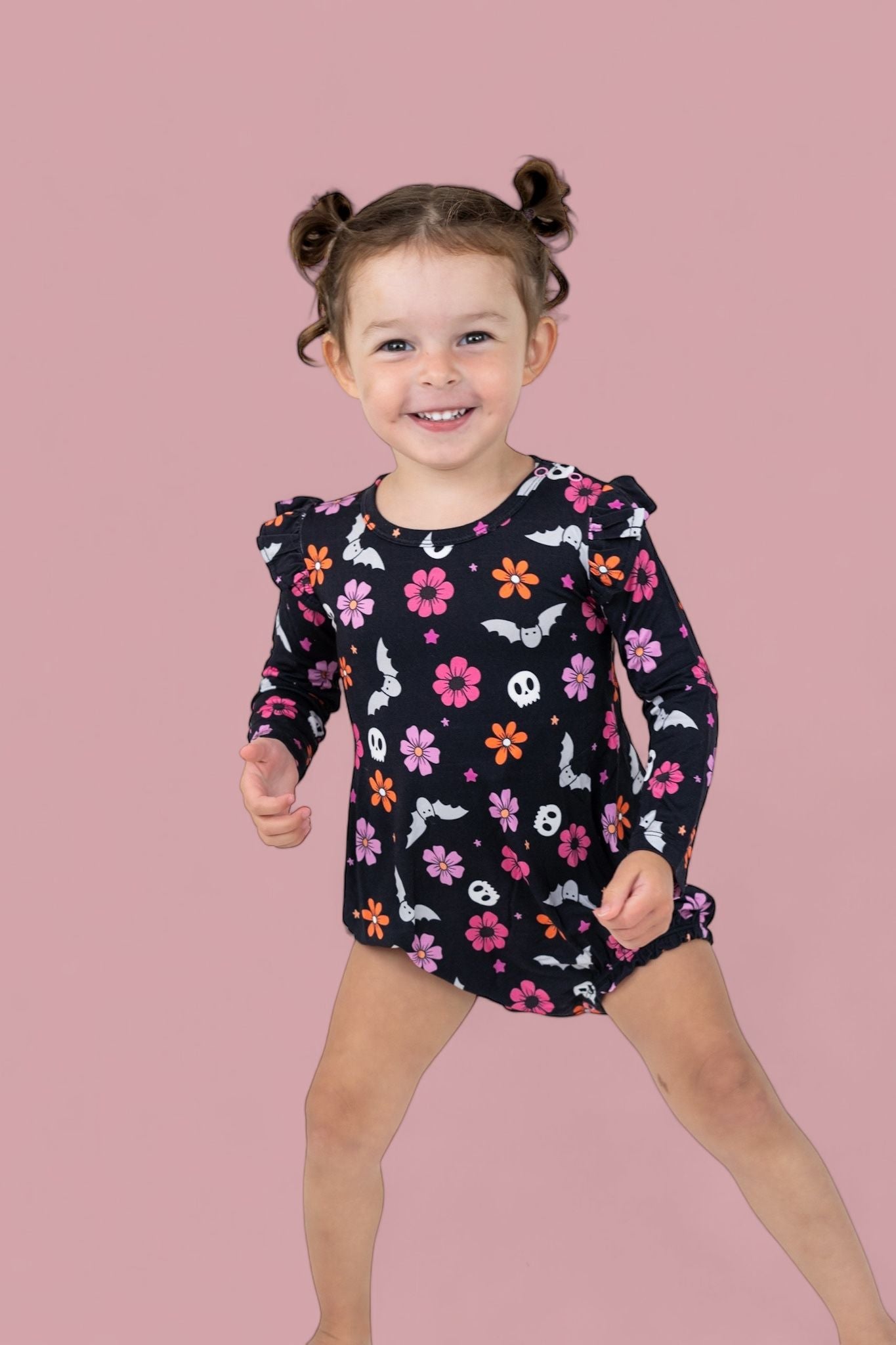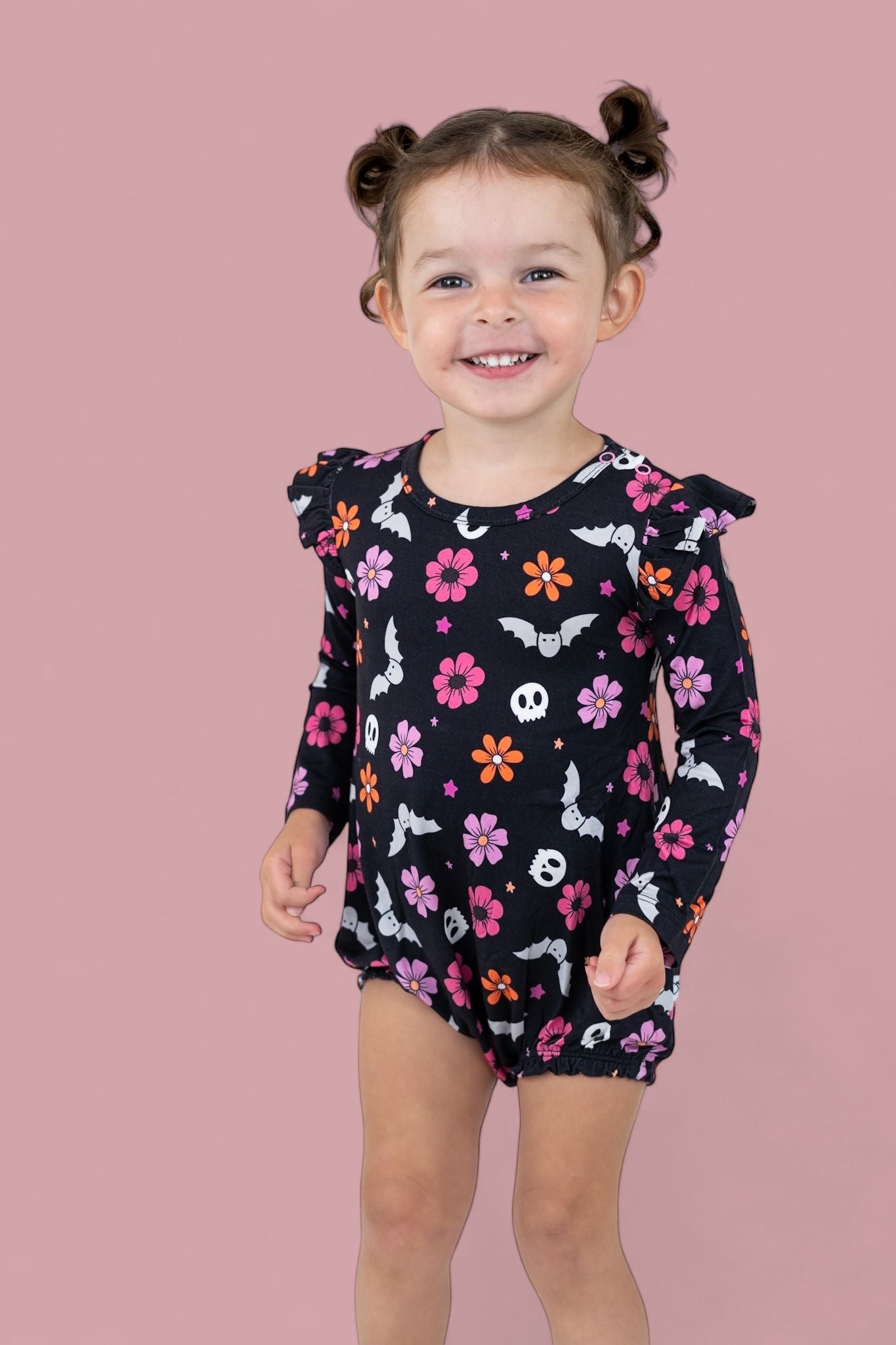 Cute meets spooky in this Bats for Brynleigh Dream Bubble Romper! Featuring pink and orange florals, smiling bats, and tiny skulls — it’s the perfect blend of sweet and spooky. Made from our buttery-soft, stretchy bamboo fabric with ruffle details for that extra charm.