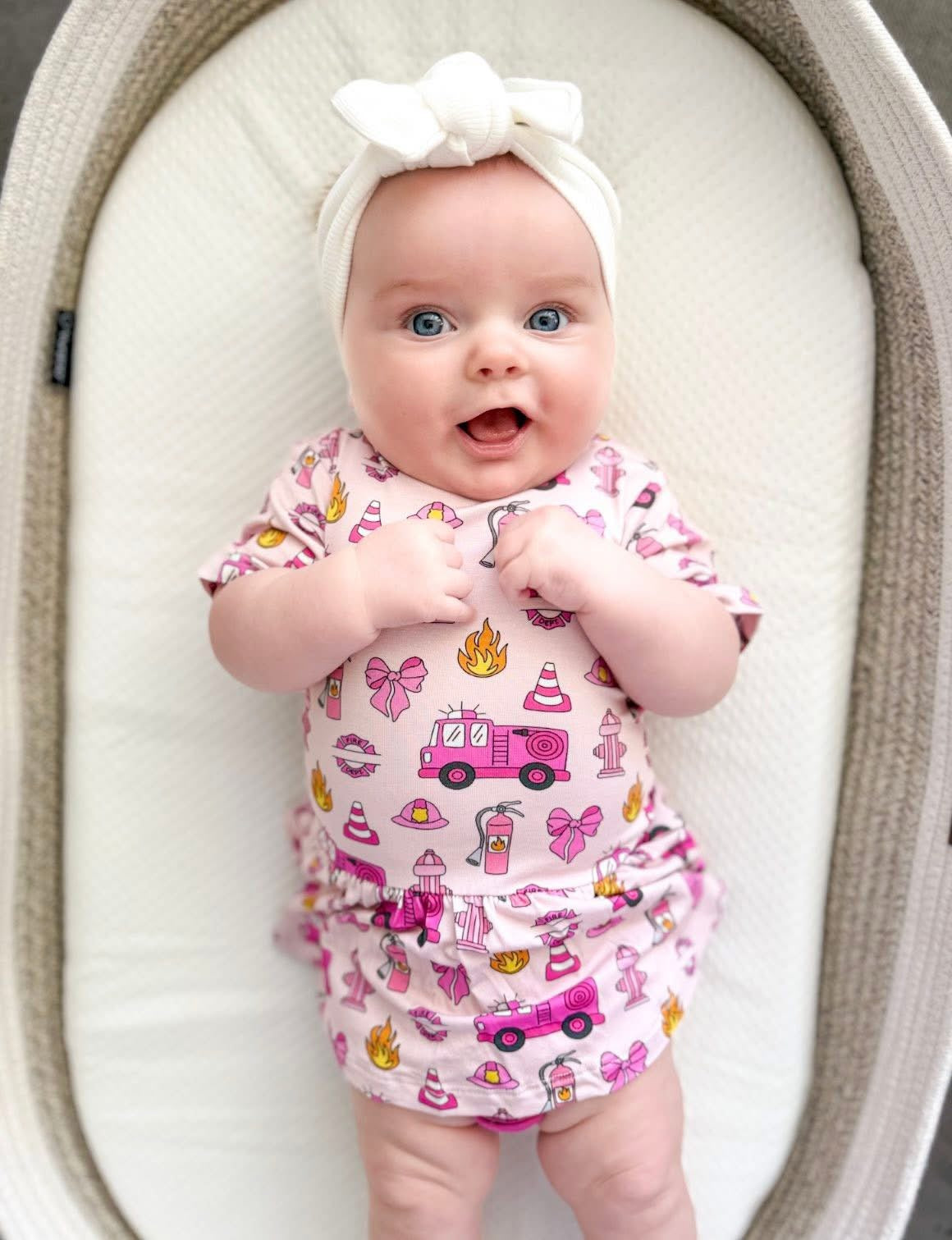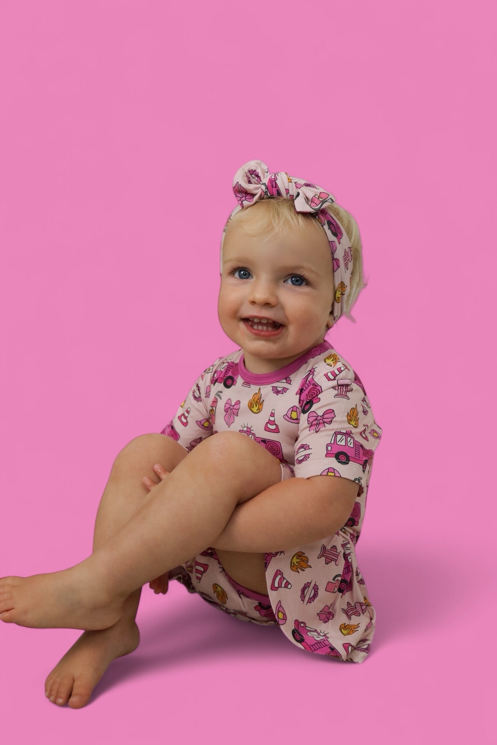 Sound the alarm—this Blazing Bows and Hydrants Dream Bodysuit Dress is coming in hot! Designed for little heroes who love a mix of courage and cuteness, this fire-inspired print features pink firetrucks, hydrants, safety cones, and extinguishers, all tied together with adorable bows on a soft pink background. Whether your little one is ready to rescue the day or snuggle up for a nap, this bodysuit dress is built for comfort and action!