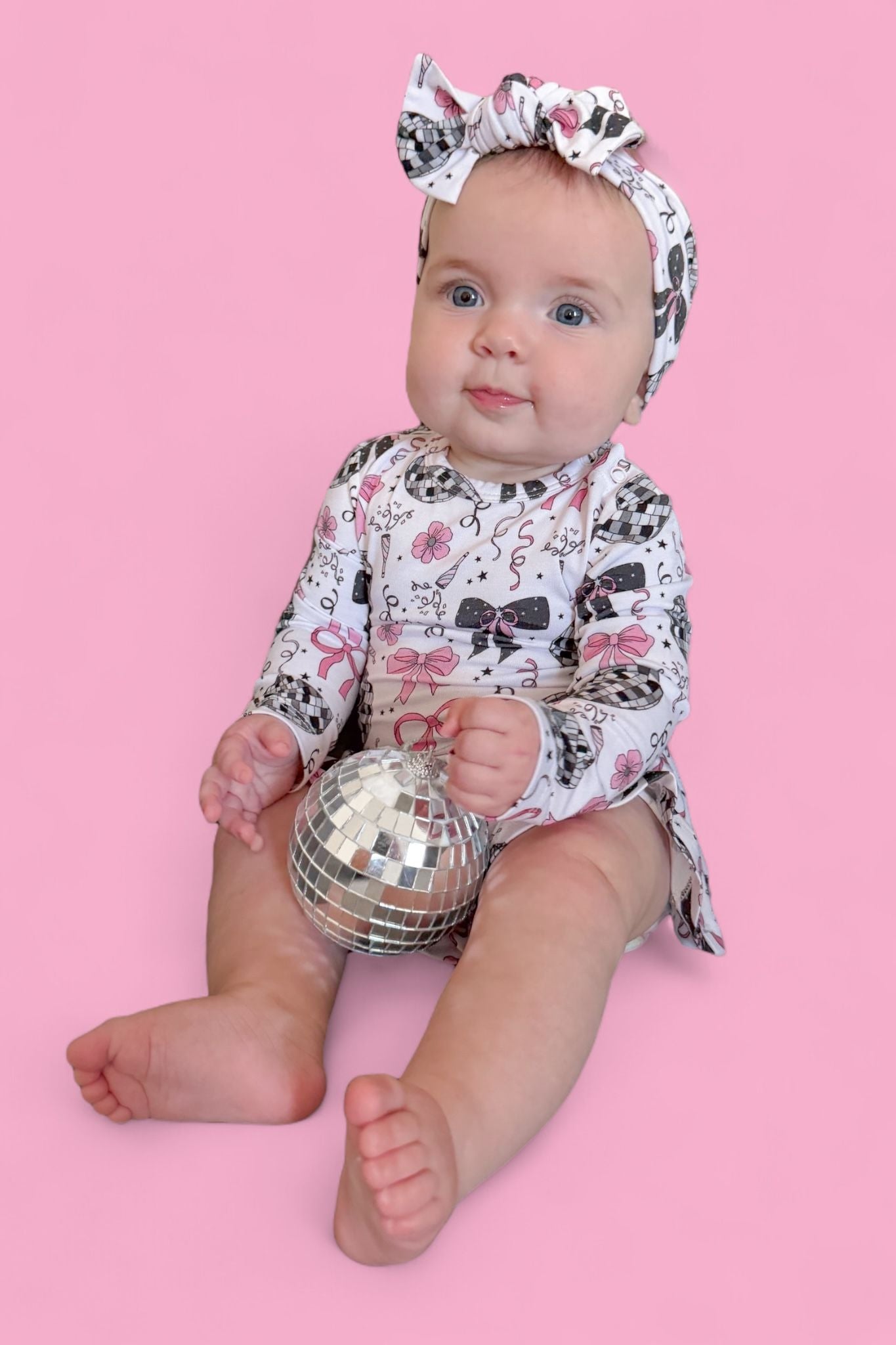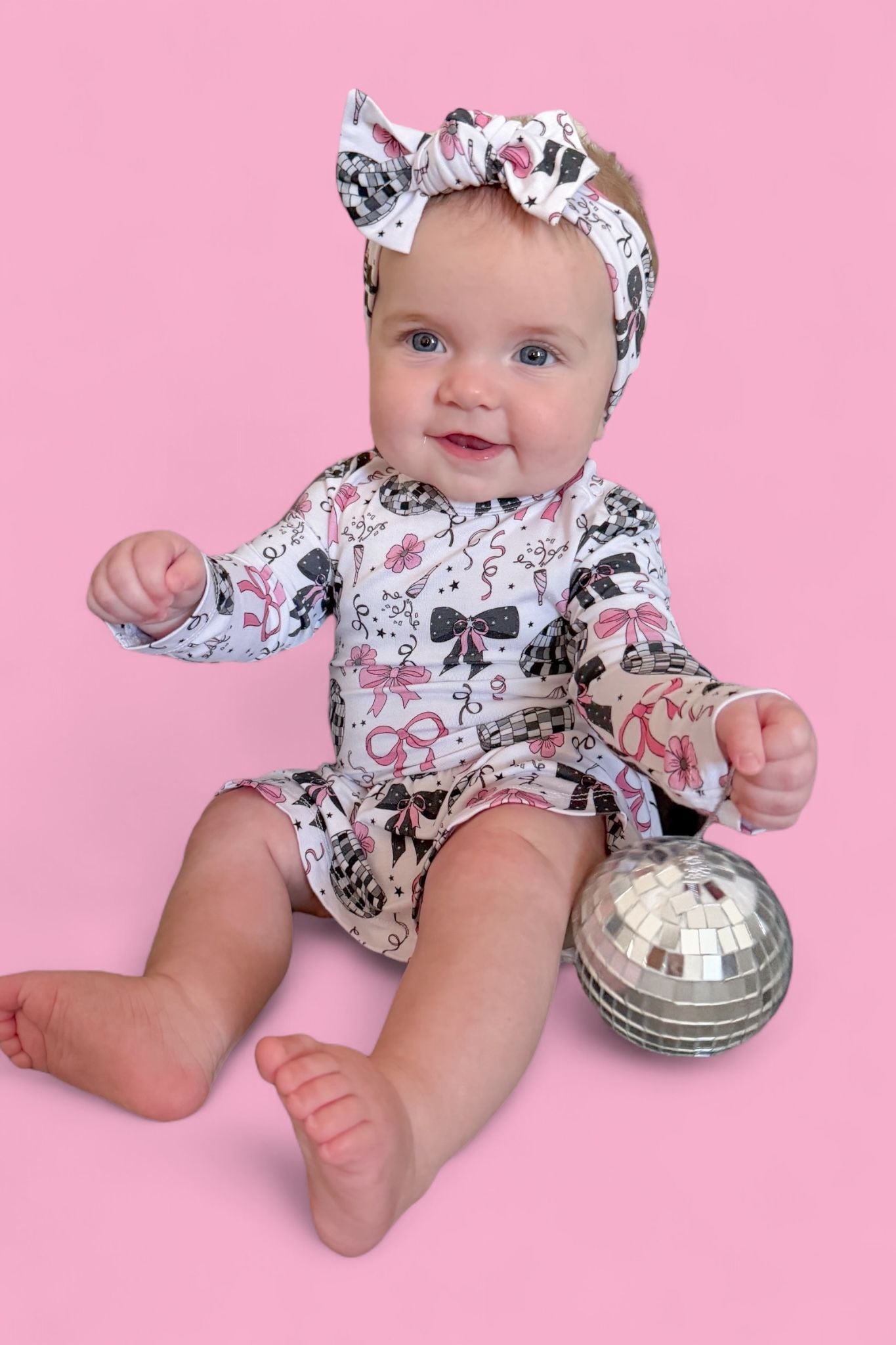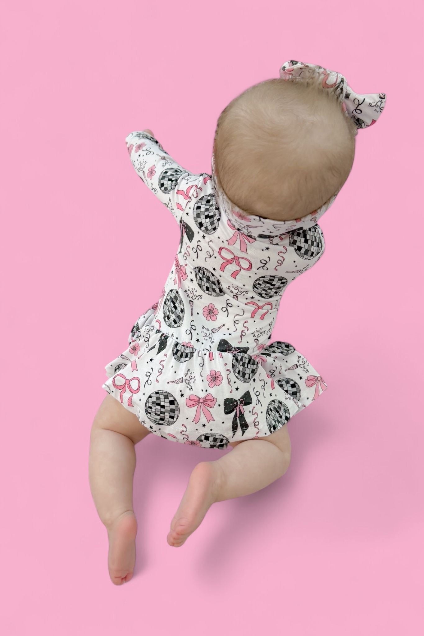 Glitz meets giggles in our Midnight Disco Darling Dream Bodysuit Dress! Featuring a festive print of dazzling disco balls, pink bows, and starry-night sparkle, this dress combines all the glam of a party outfit with the practicality of a built-in bodysuit. Perfect for little ones who love to twirl and stay comfy!