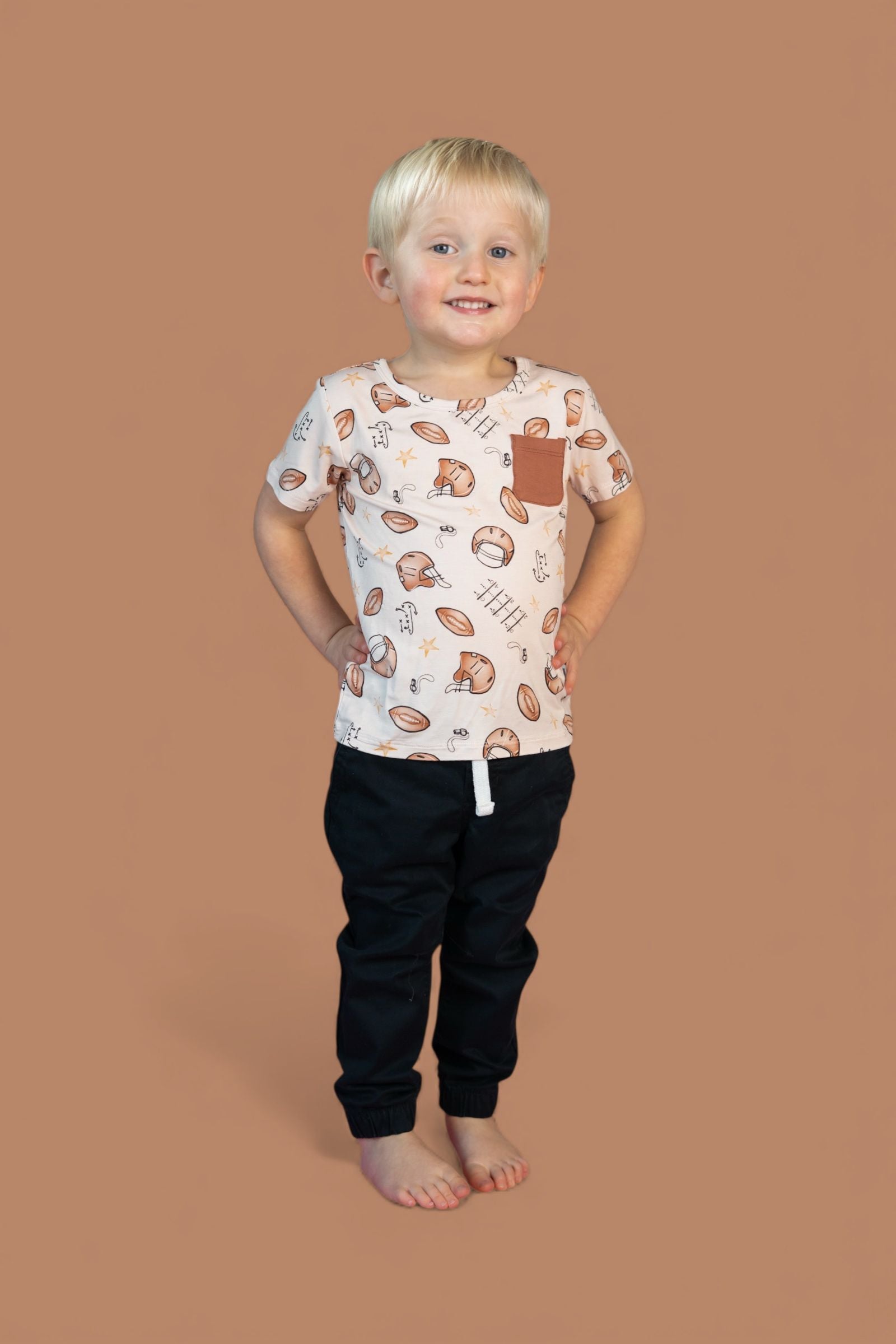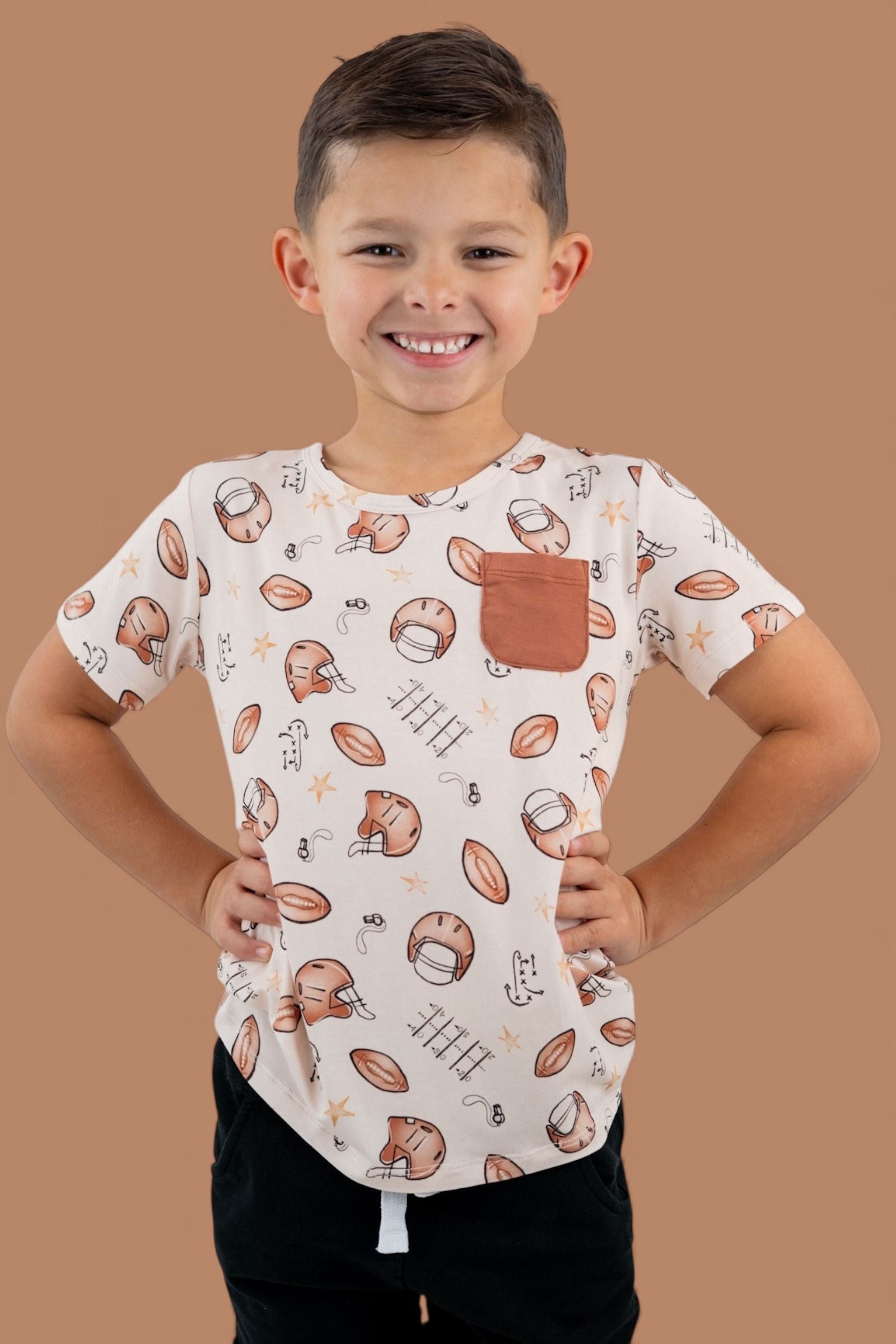 Game day style meets everyday comfort! The Tiny Touchdown Dream Pocket Tee is crafted from our buttery-soft bamboo fabric and features an all-over football + helmet + star print. Finished with a functional chest pocket, this tee is perfect for pairing with joggers, shorts, or layering for all-day play.