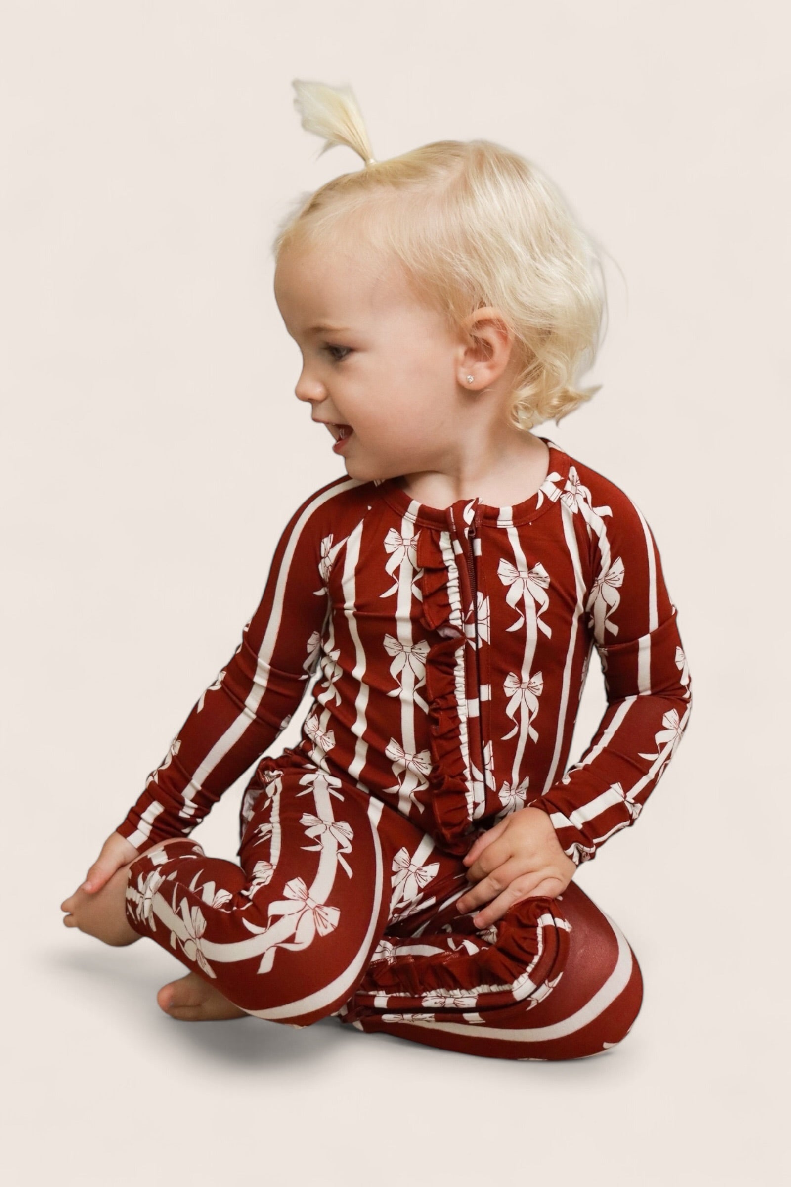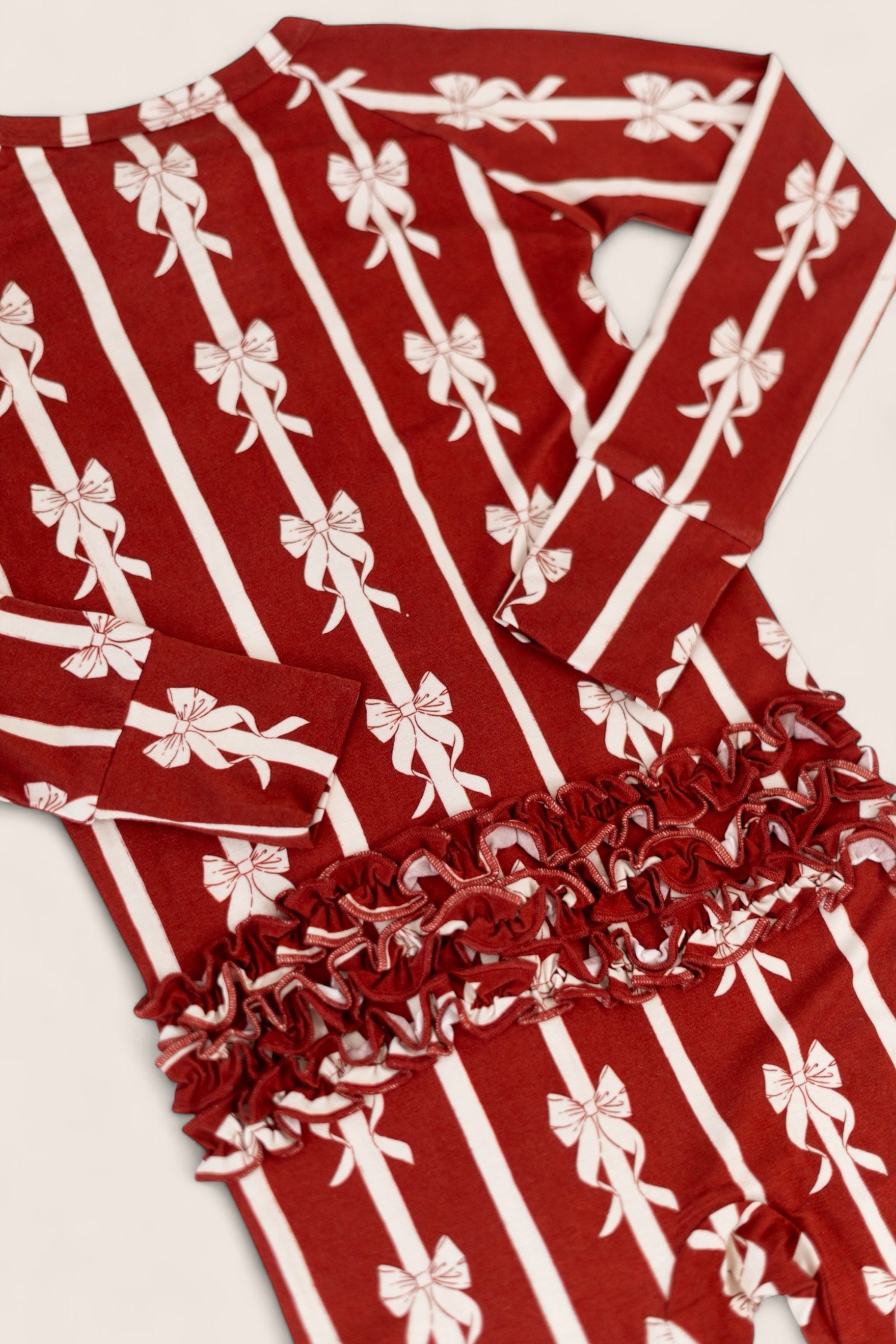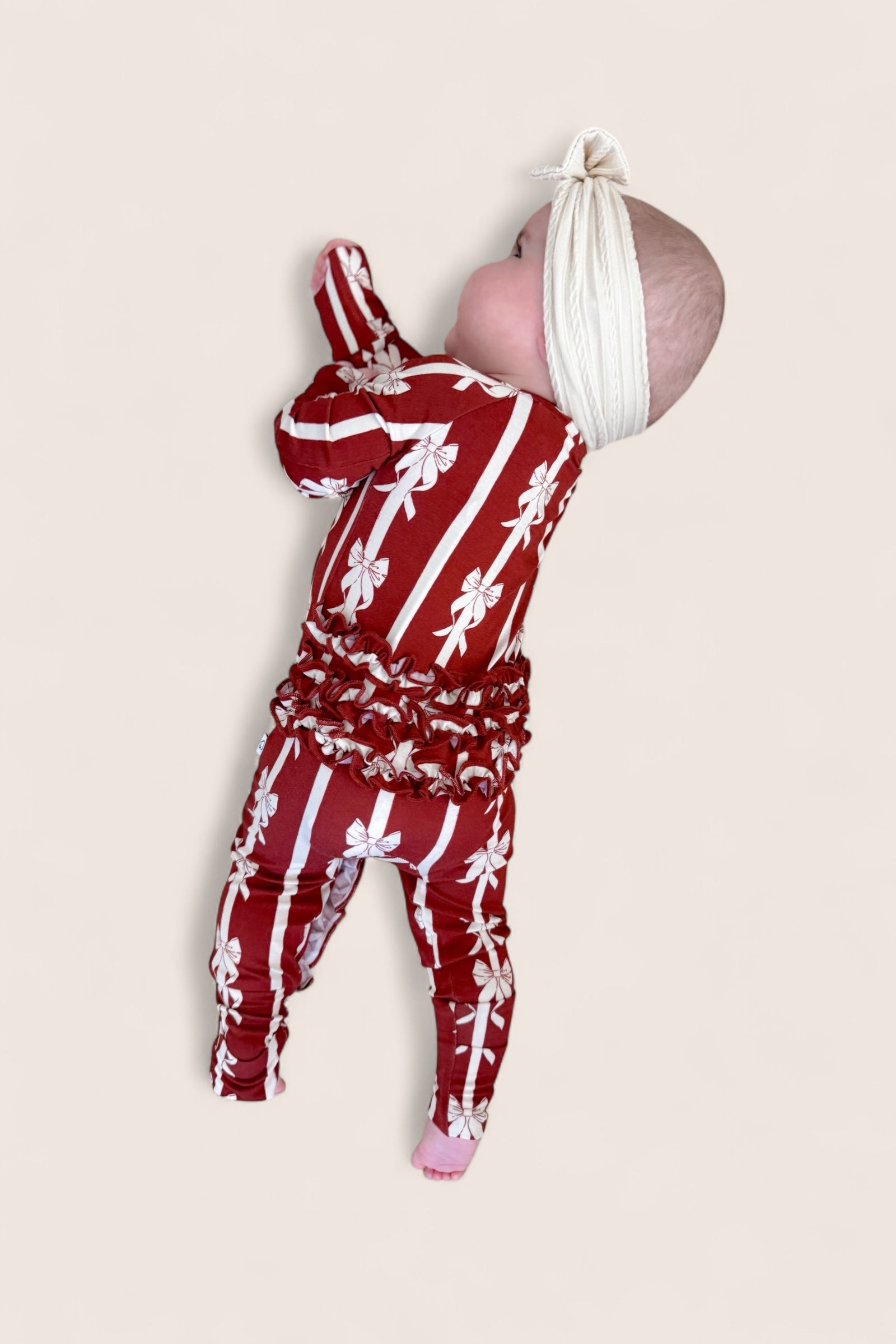 Your little one will be the best-dressed gift under the tree in our Mistle-Bows Dream Ruffle Romper! Featuring an elegant burgundy background with sweet ivory bows and stripes, this holiday-ready print is both classic and whimsical. The dreamy ruffle details add a dash of festive flair, while the buttery-soft fabric keeps your baby cozy through every cuddle, crawl, and Christmas cookie moment.