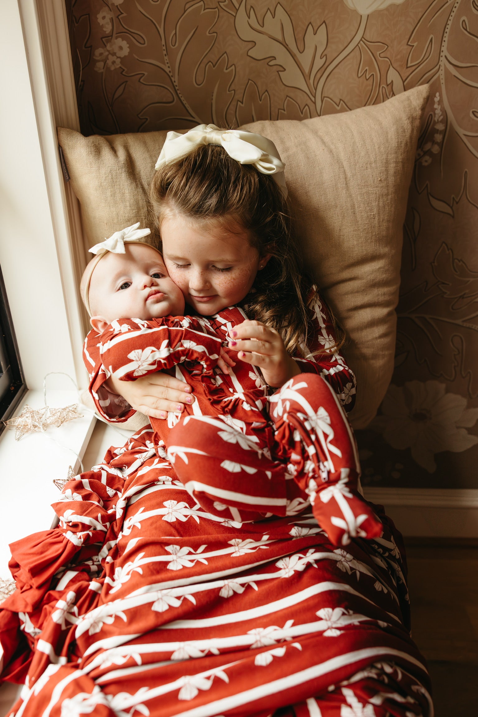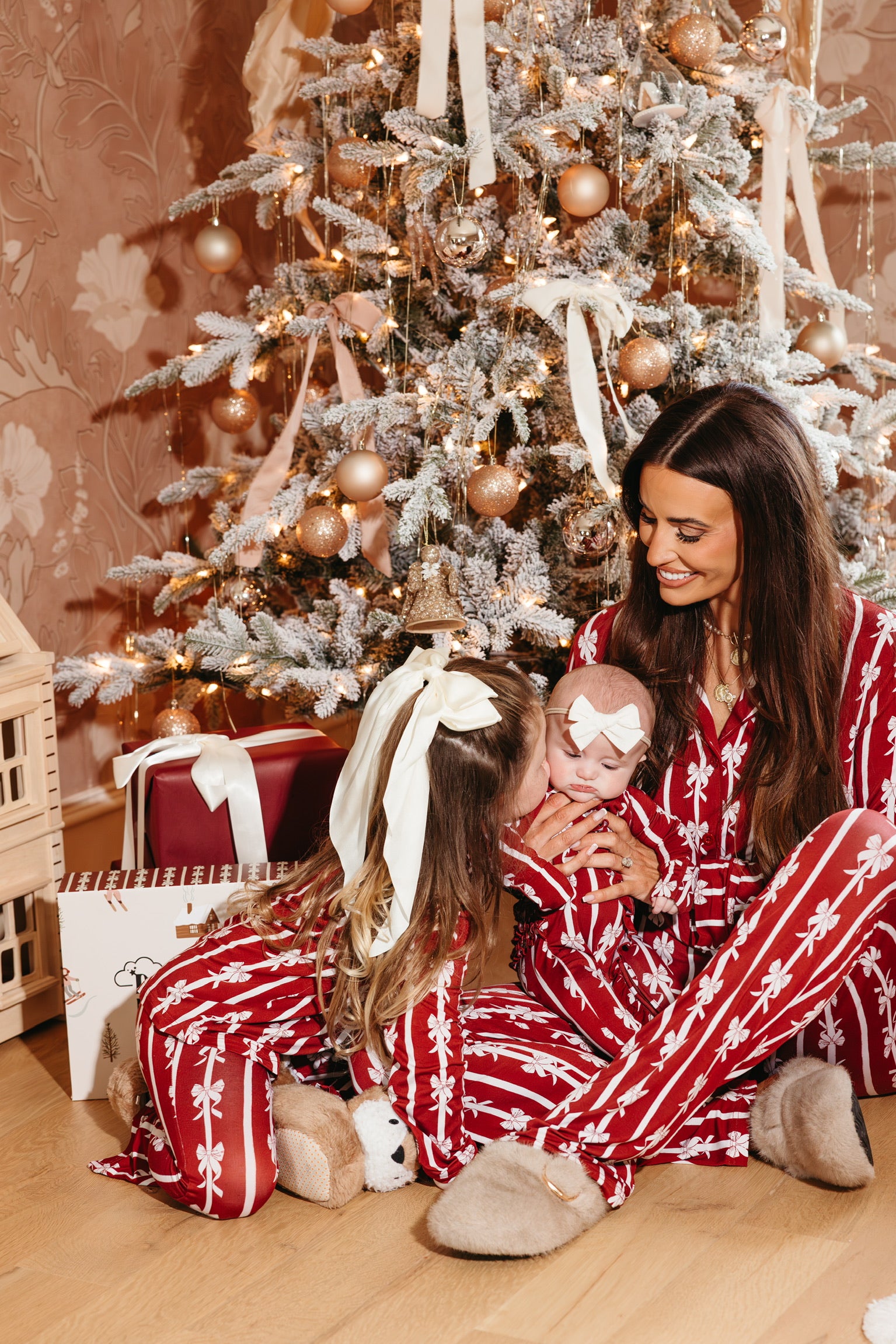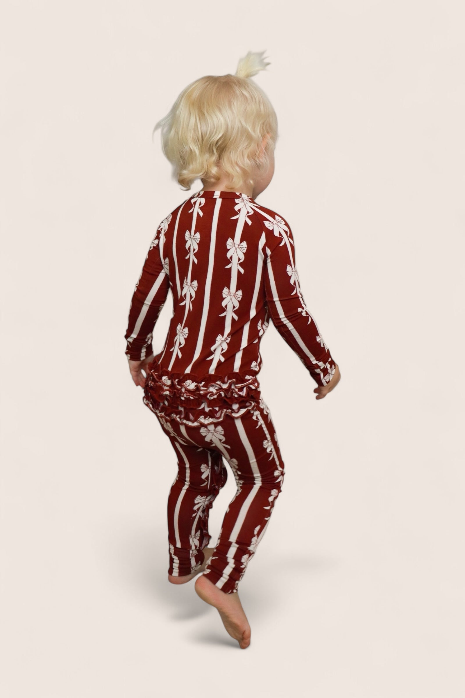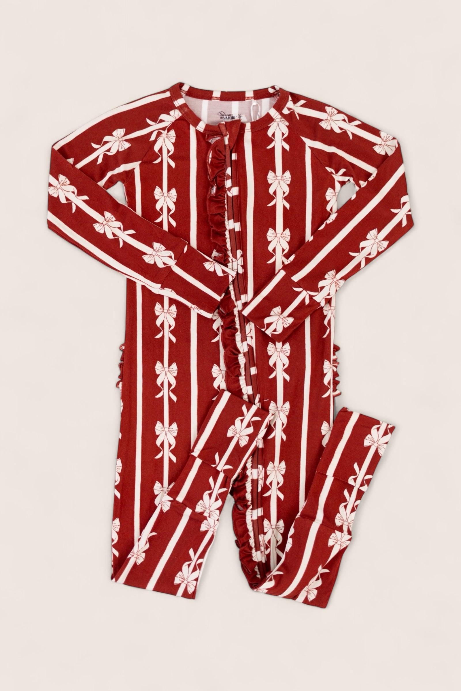 Your little one will be the best-dressed gift under the tree in our Mistle-Bows Dream Ruffle Romper! Featuring an elegant burgundy background with sweet ivory bows and stripes, this holiday-ready print is both classic and whimsical. The dreamy ruffle details add a dash of festive flair, while the buttery-soft fabric keeps your baby cozy through every cuddle, crawl, and Christmas cookie moment.