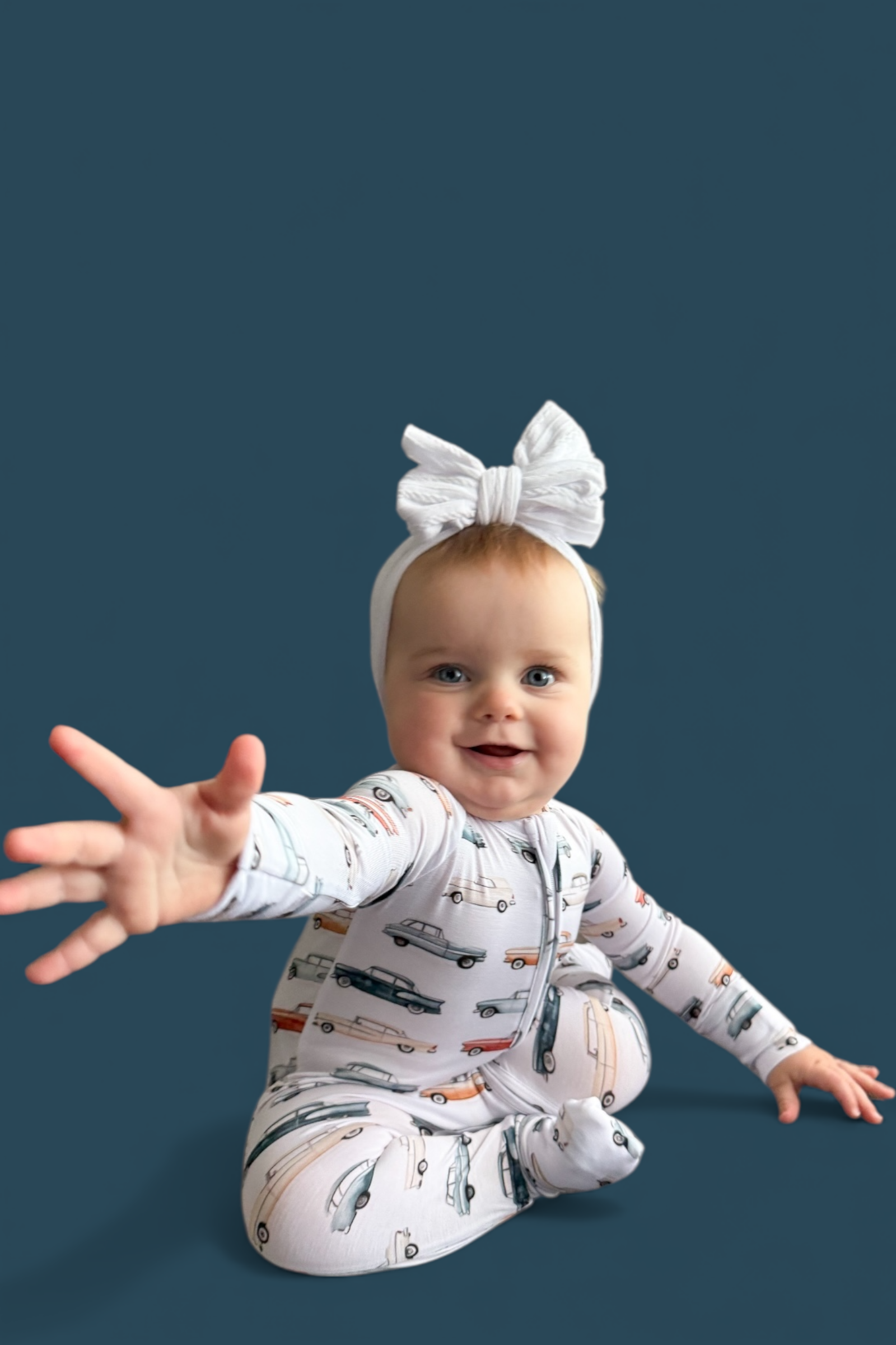 Classic cars, cozy comfort! The Retro Rides Dream Romper features a playful all-over print of vintage cars in muted retro hues. Made from our signature buttery-soft bamboo fabric, this romper is breathable, stretchy, and perfect for little ones on the go. With a two-way zipper for quick changes and a snug yet comfy fit, it’s built for cruising through naps, playtime, and dreamland.