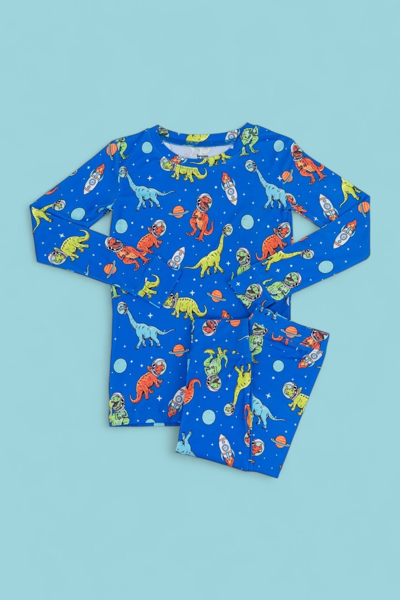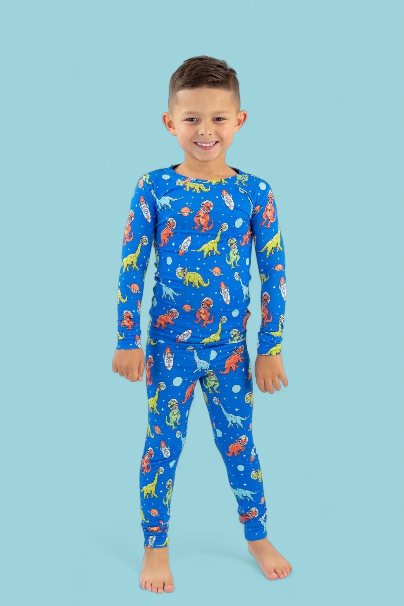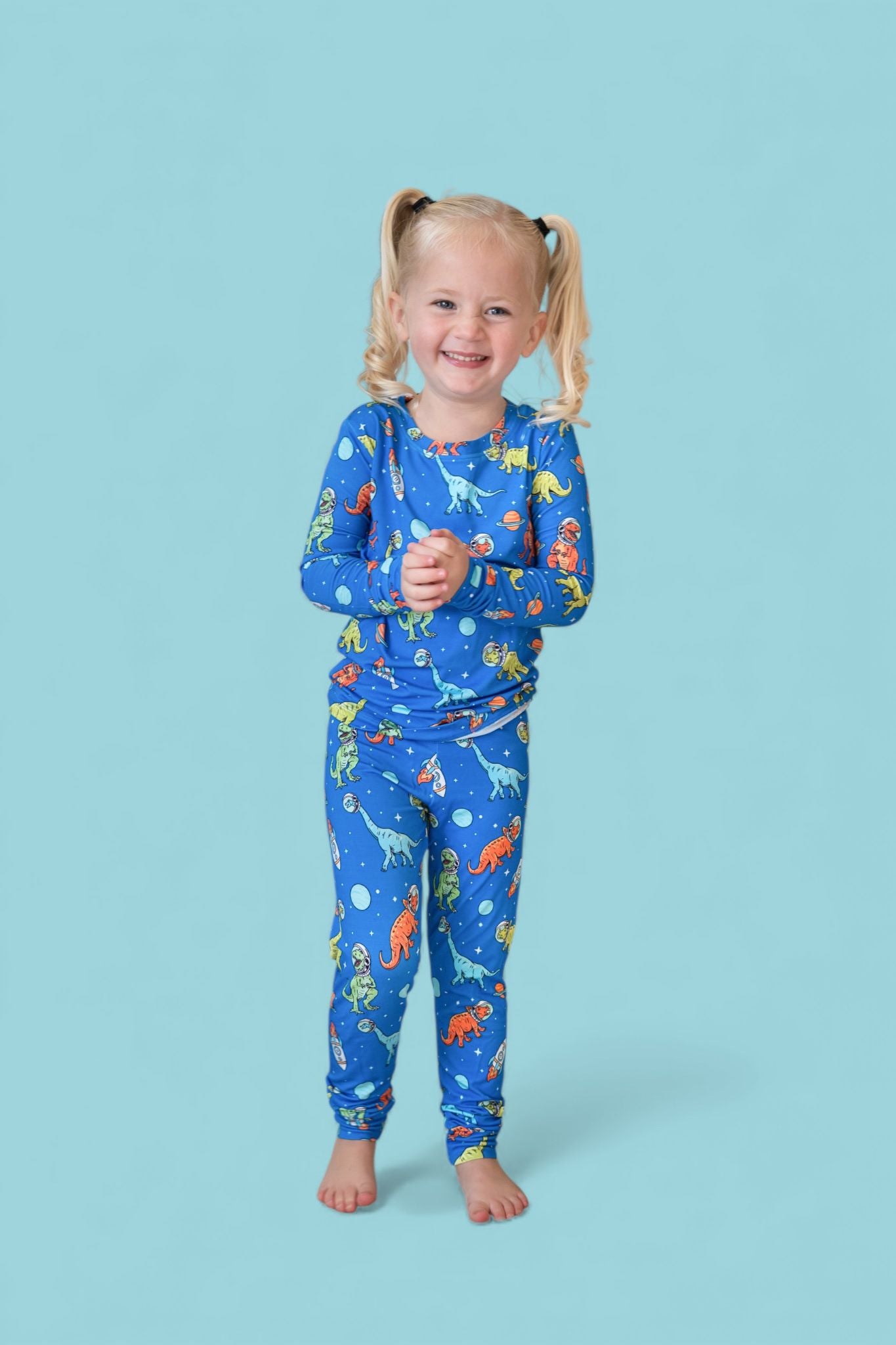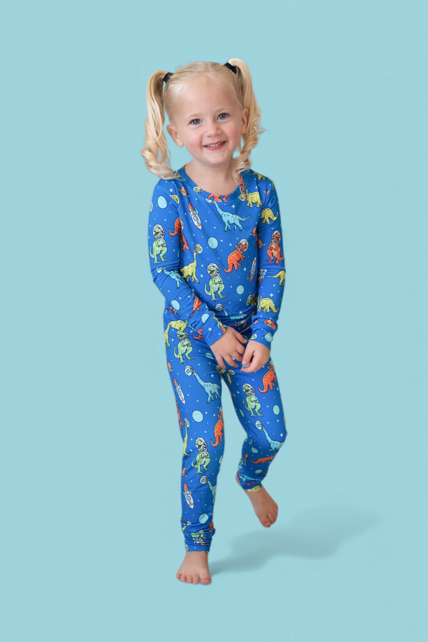Bedtime just got a major upgrade with our Astro-Dino two-piece pajama set! This long sleeve and pants combo features a wildly fun print of astronaut dinosaurs, flying rockets, and colorful planets—all set against a bold blue sky full of stars. It's the perfect pair for little dreamers who love dinos and space adventures.