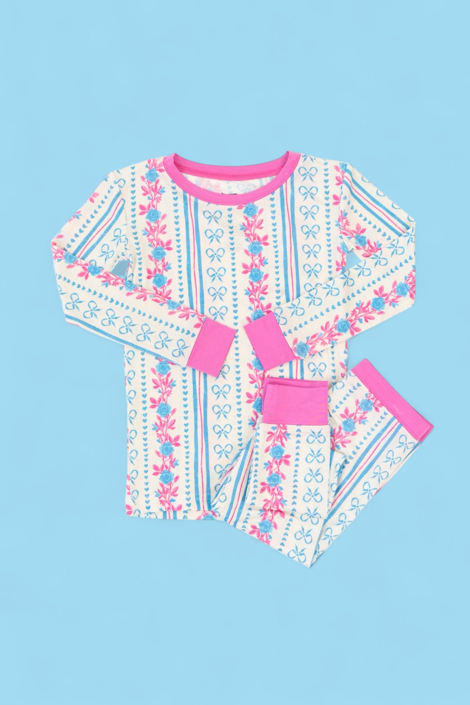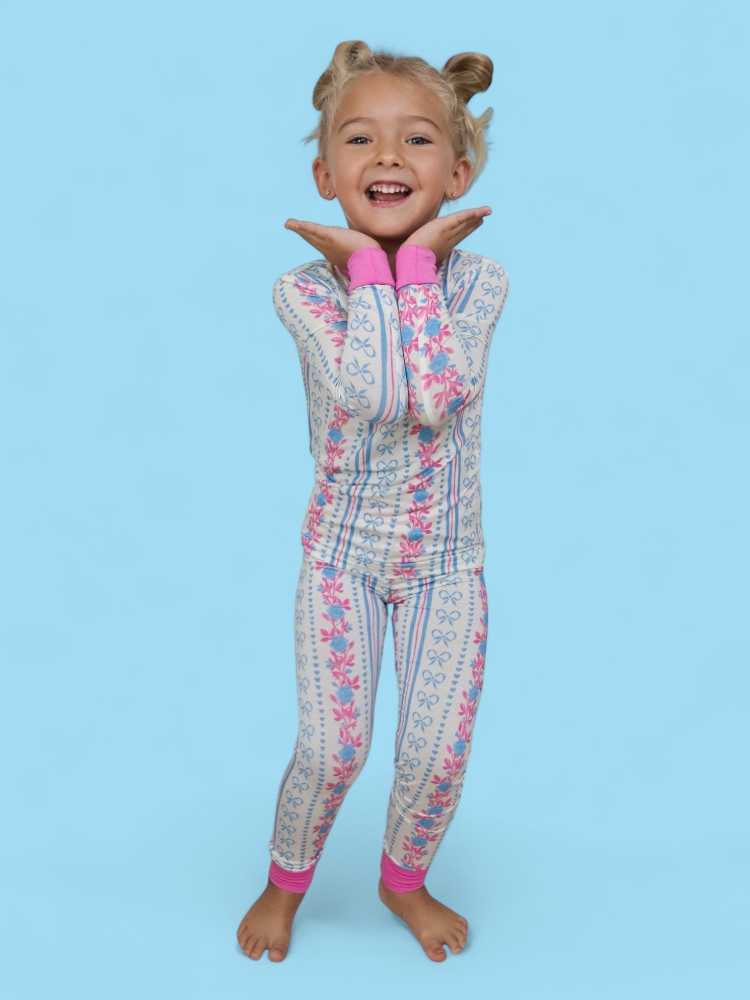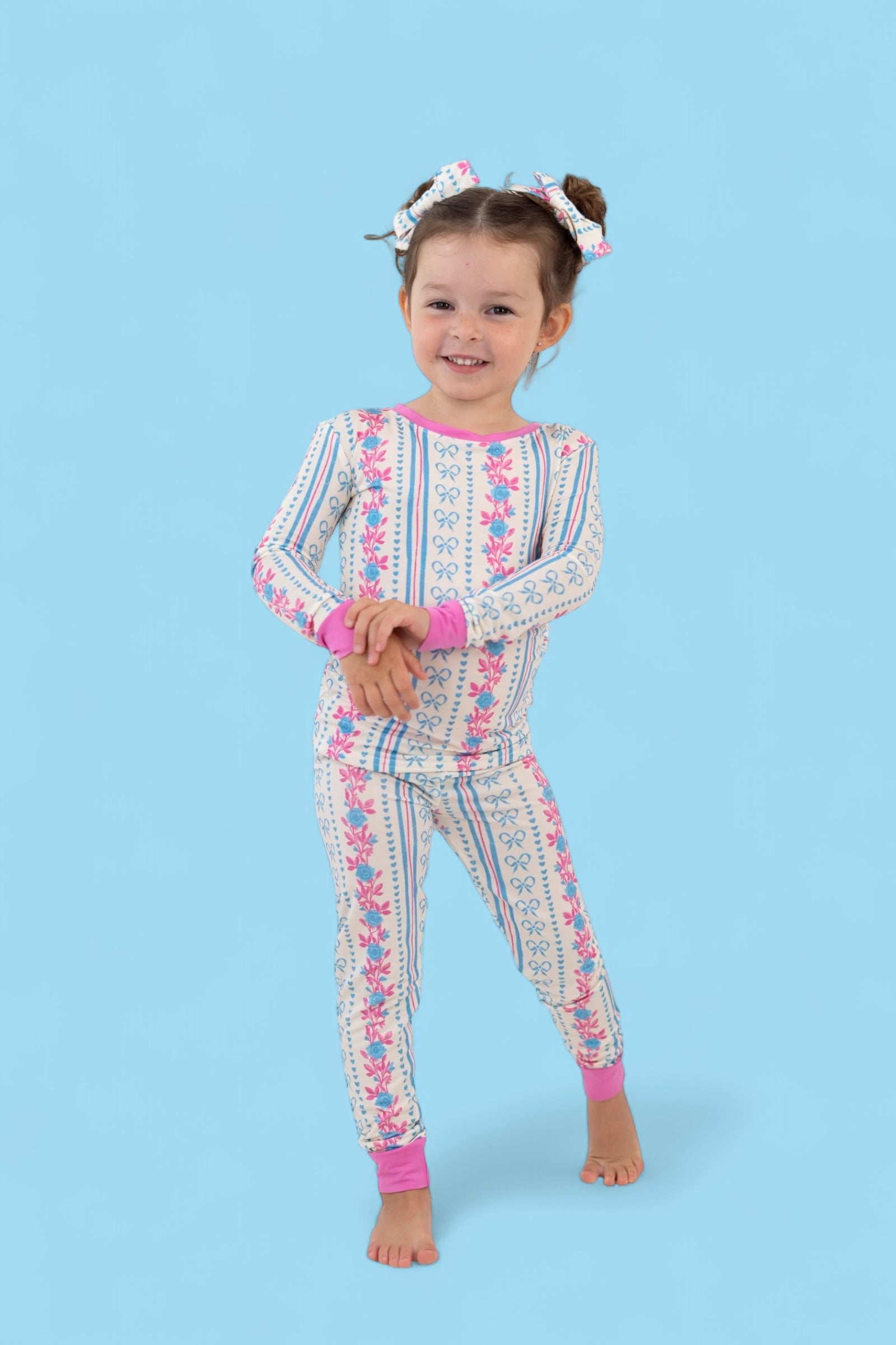 Crafted from the softest, most breathable seasonal bamboo viscose, this long-sleeve pajama set is designed to keep your babe comfy all night long and stylish during morning play. The Petite Posie print features delicate pink florals, tiny hearts, and subtle stripes—bringing a vintage-inspired touch to their nighttime routine.