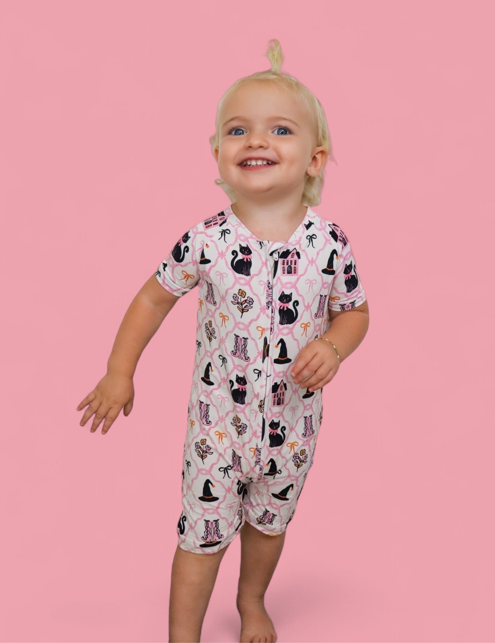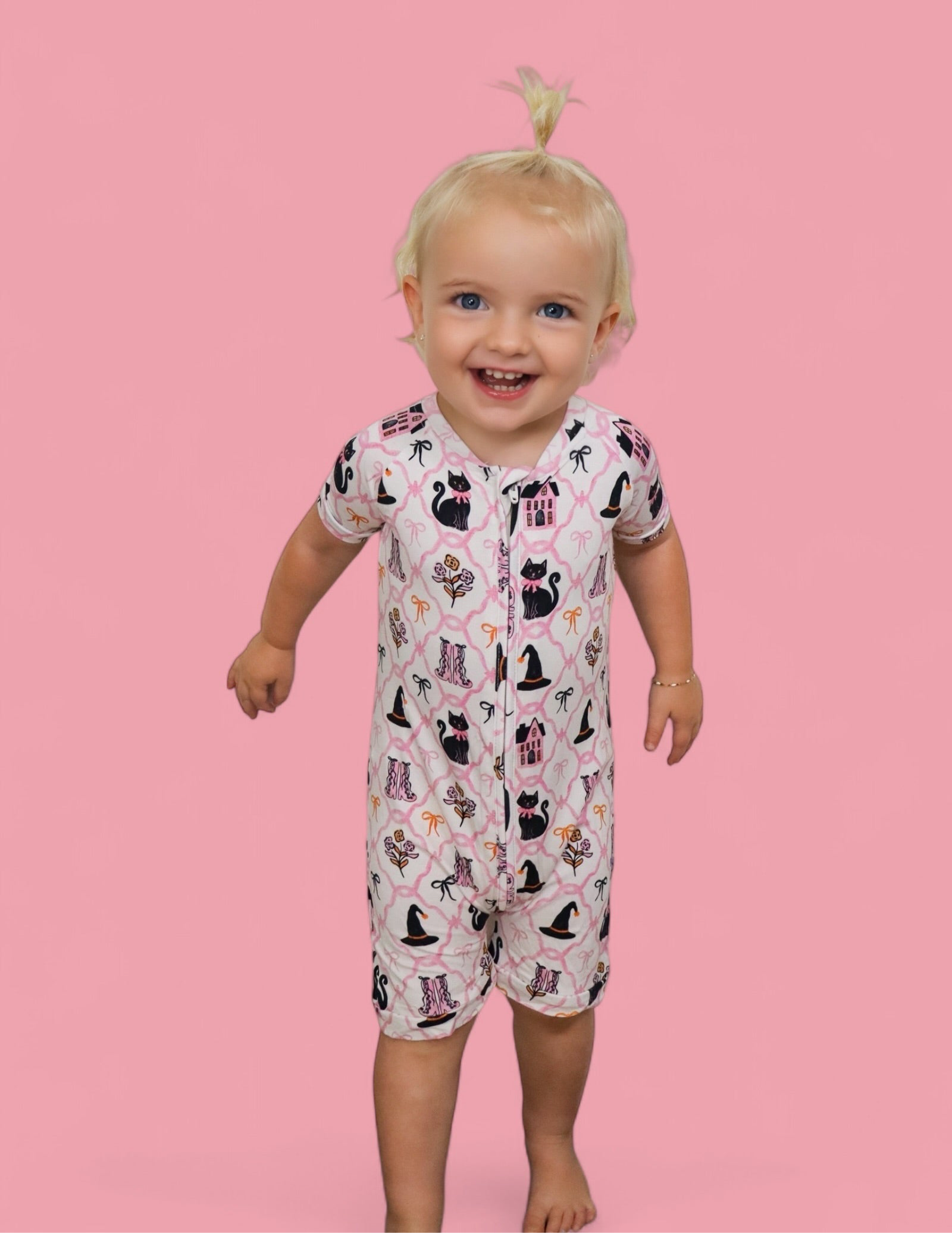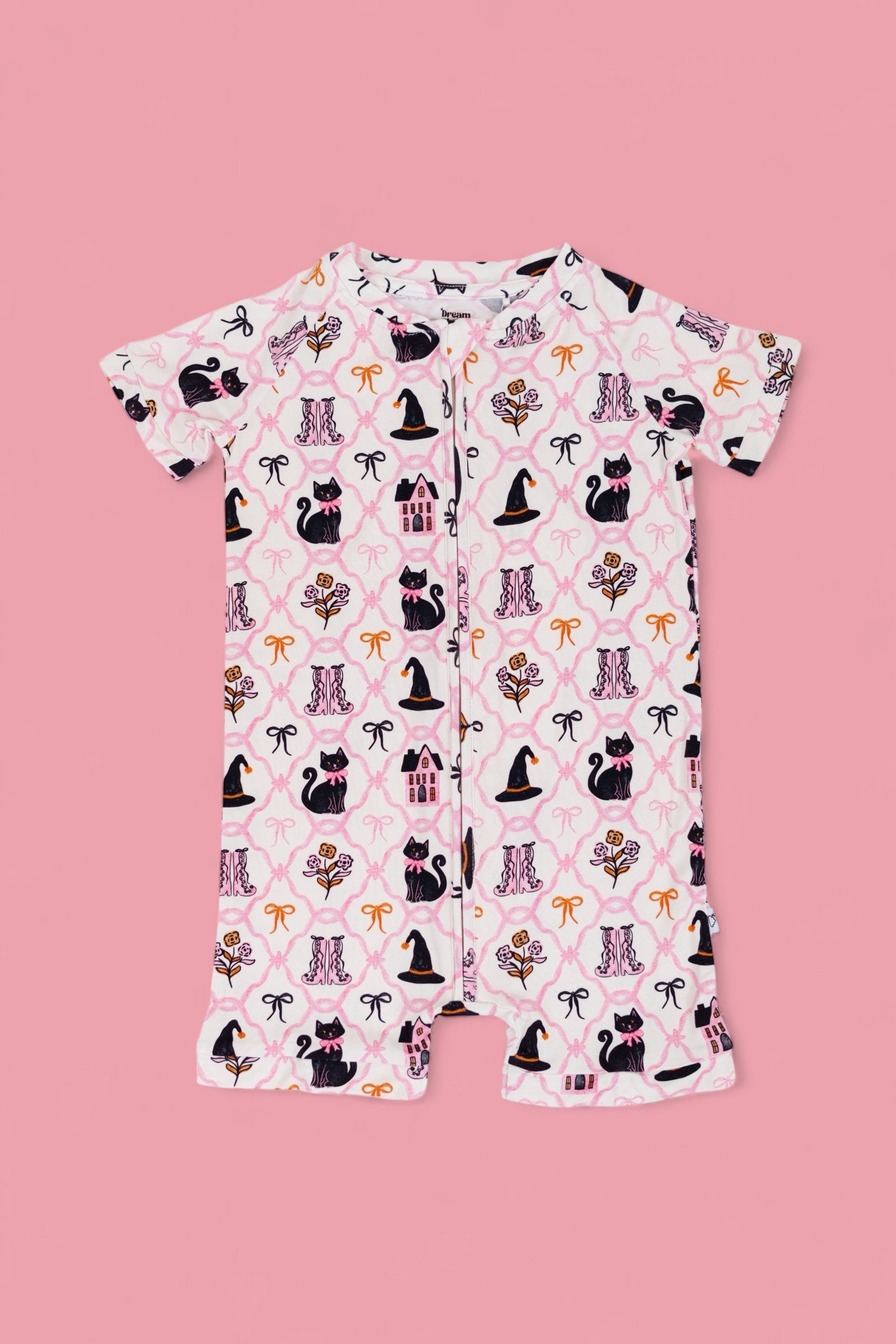 Perfect for warm fall nights and cozy daytime play, the Broomsticks and Blossoms Dream Shortie brings a touch of Halloween magic to your little one's wardrobe. Featuring a whimsical pink print with black cats, witch hats, floral boots, and pretty bows, this one-piece romper is made from our signature buttery-soft fabric with short sleeves, short legs, and an easy zip closure for quick changes.