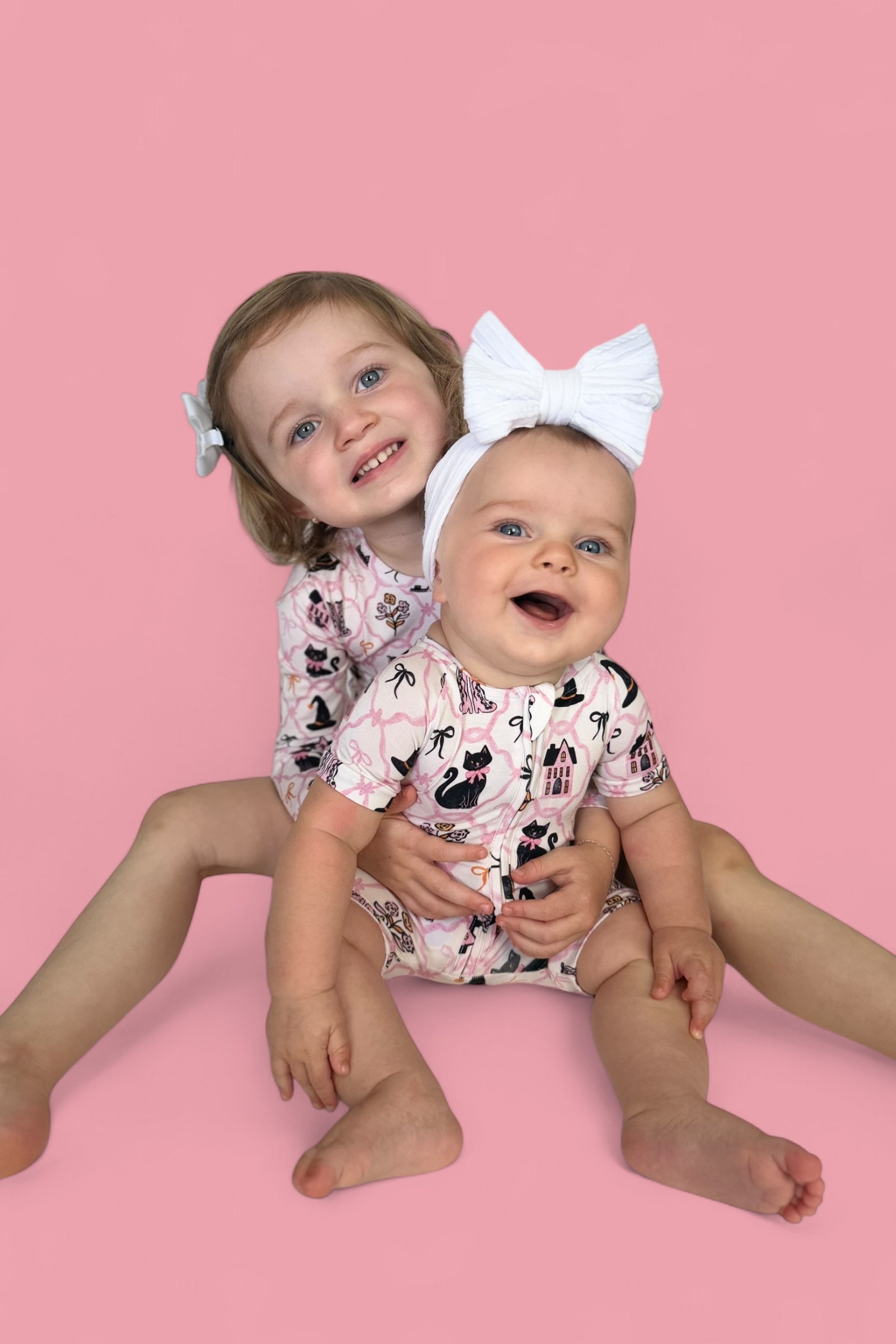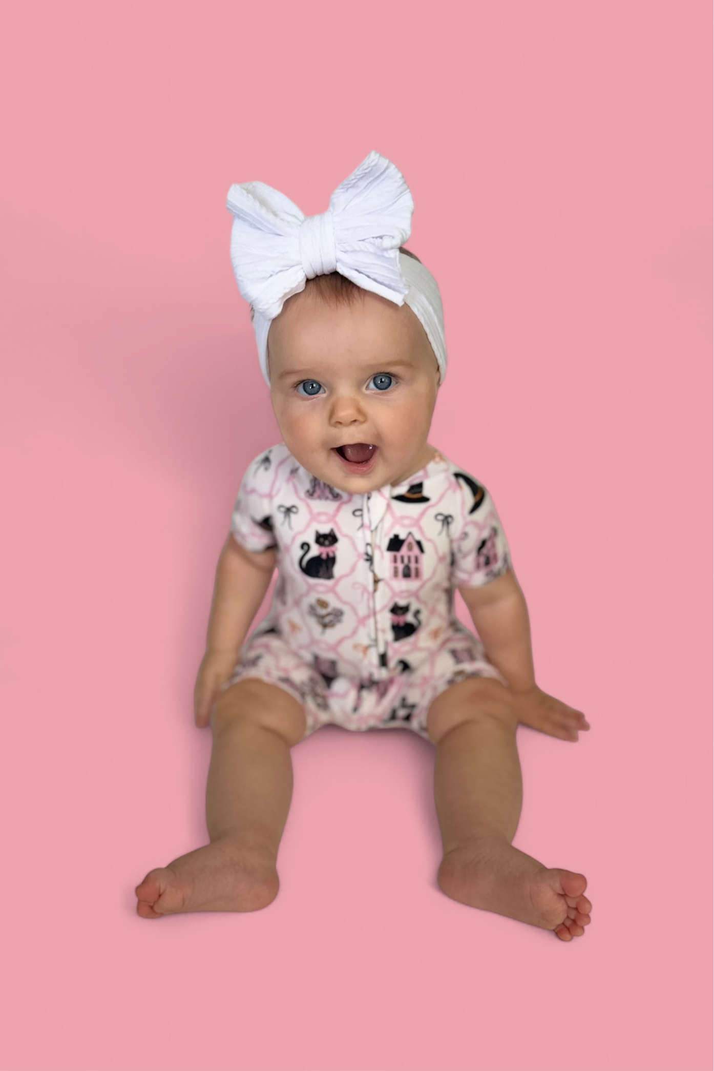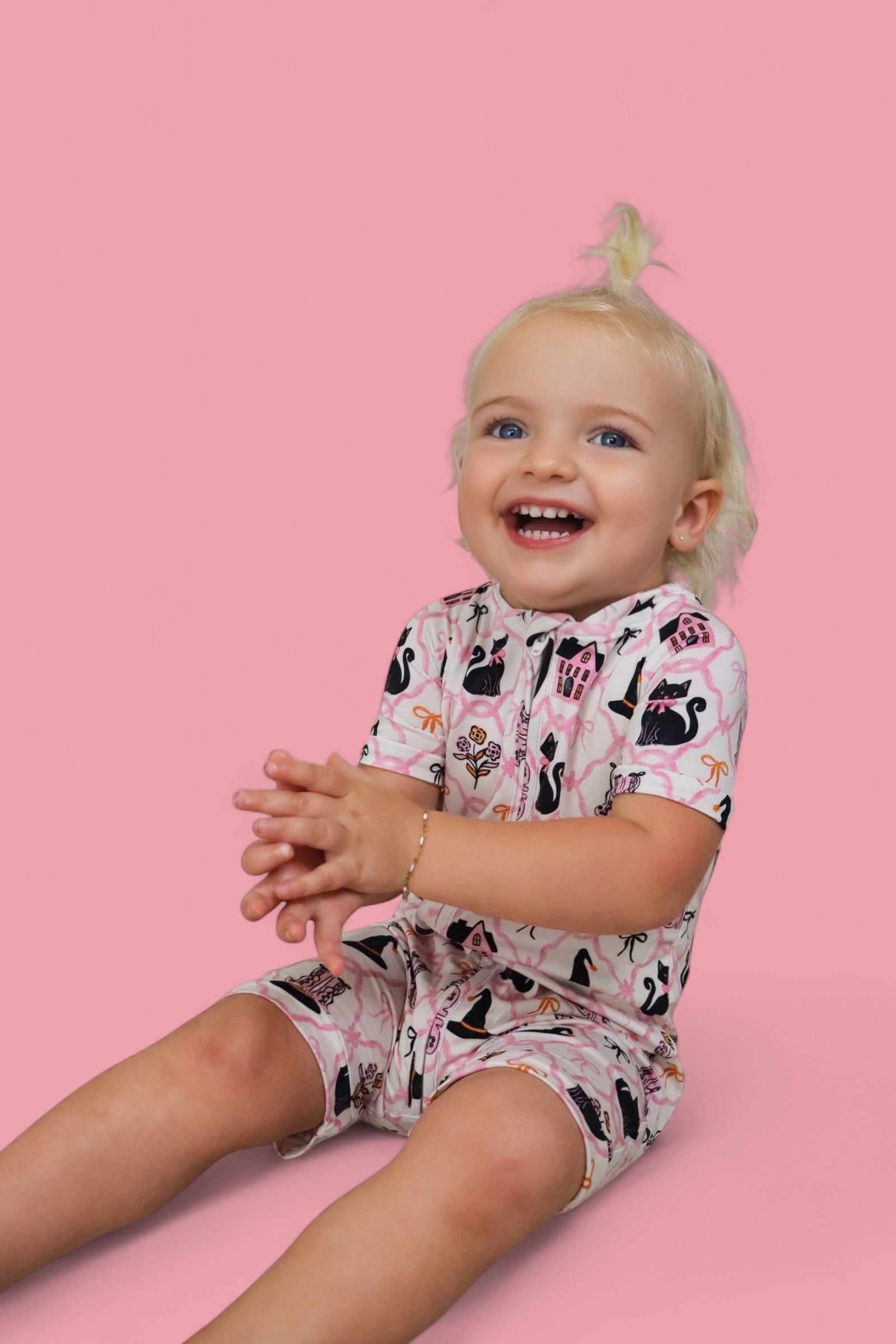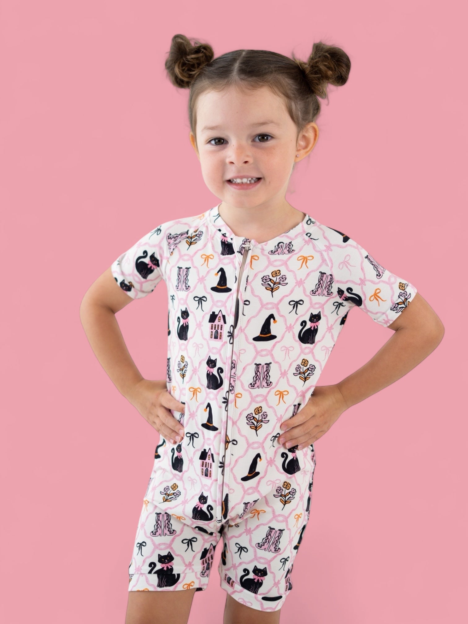 Perfect for warm fall nights and cozy daytime play, the Broomsticks and Blossoms Dream Shortie brings a touch of Halloween magic to your little one's wardrobe. Featuring a whimsical pink print with black cats, witch hats, floral boots, and pretty bows, this one-piece romper is made from our signature buttery-soft fabric with short sleeves, short legs, and an easy zip closure for quick changes.
