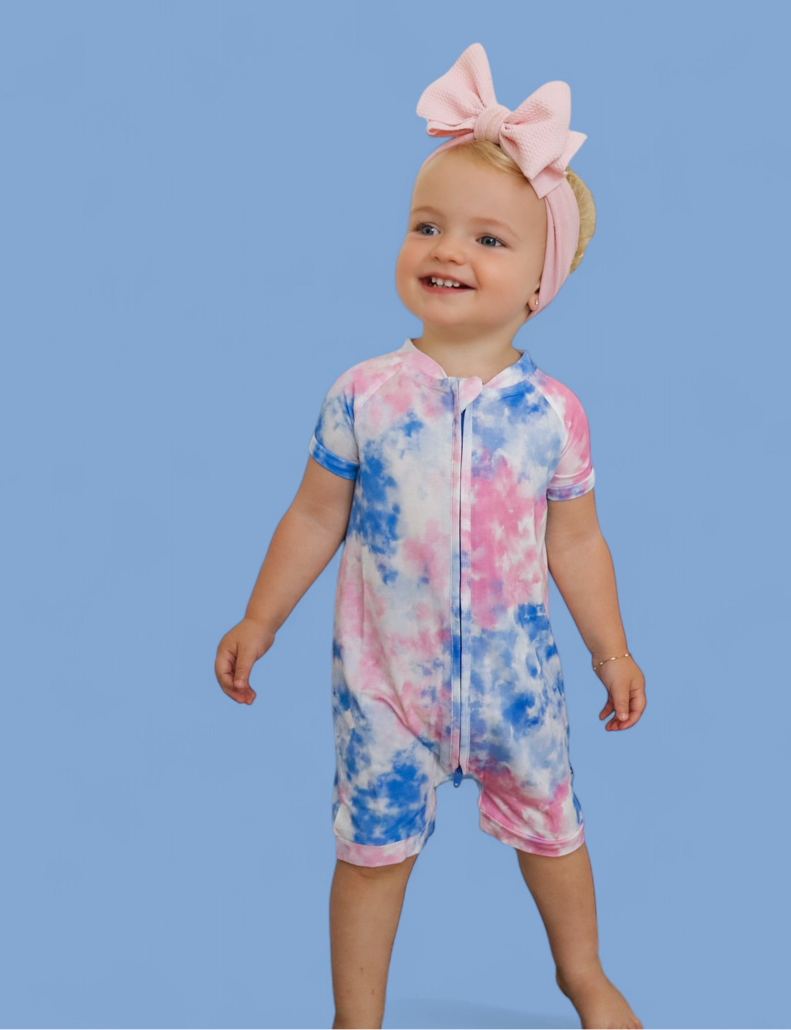 The Cotton Candy Tie Dye Dream Shortie is the perfect mix of cozy comfort and playful style. With its soft swirl of pastel pinks, purples, and blues, this short romper is a must-have for warm-weather adventures, stroller naps, and everything in between.