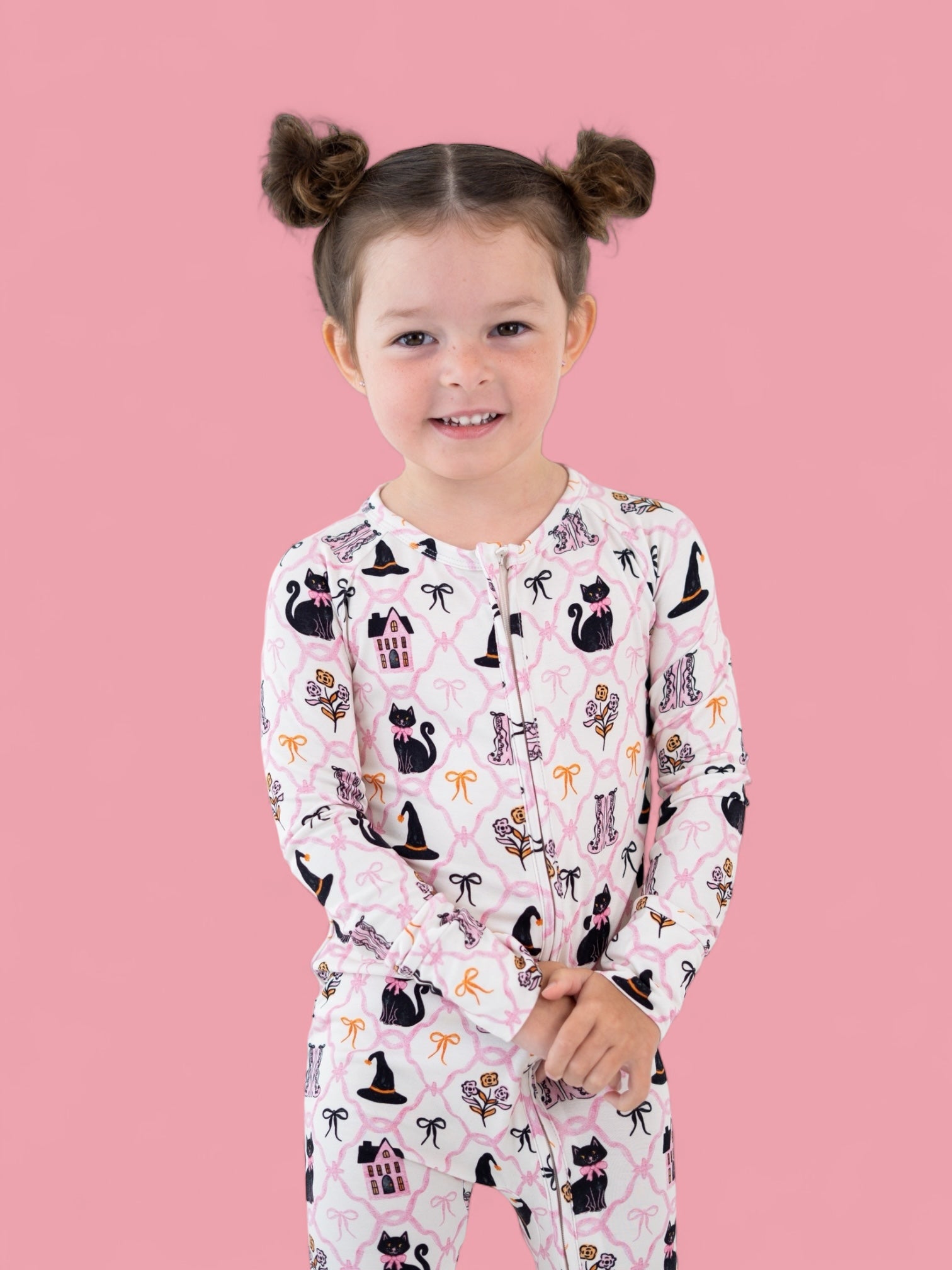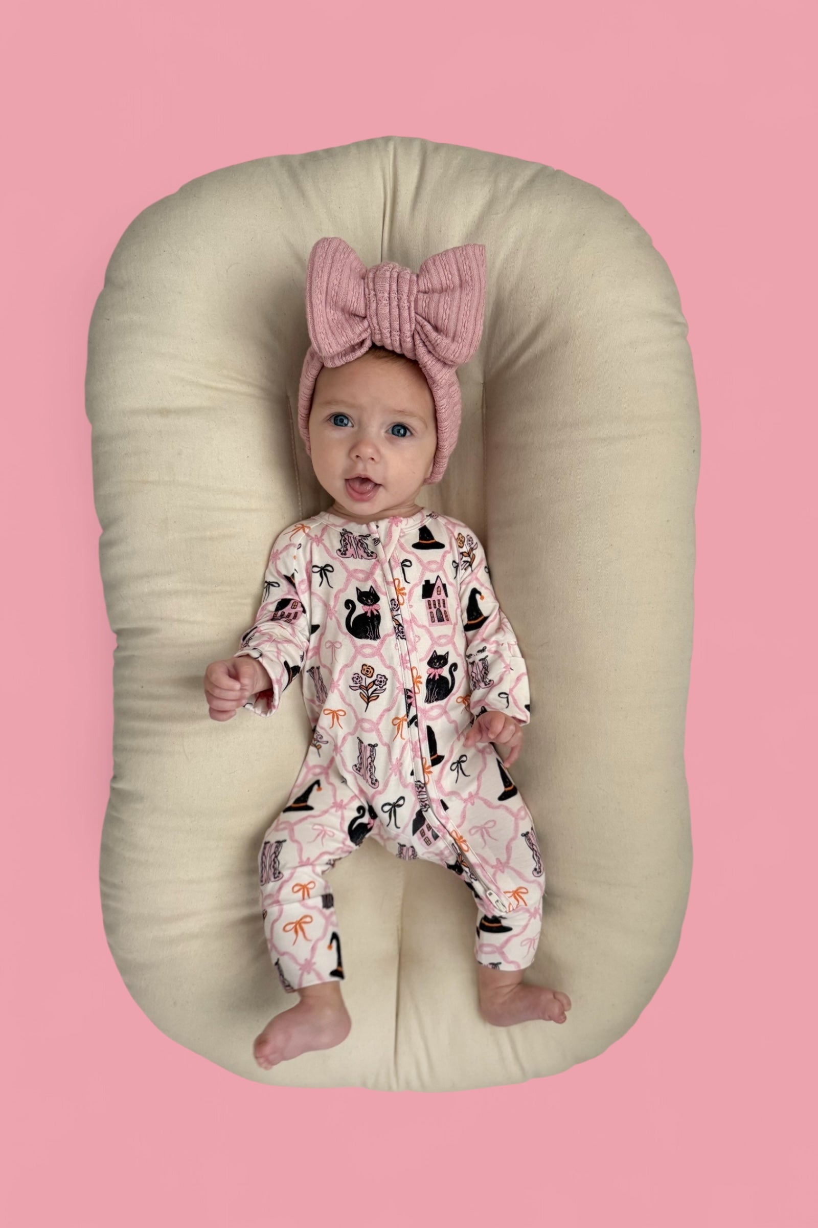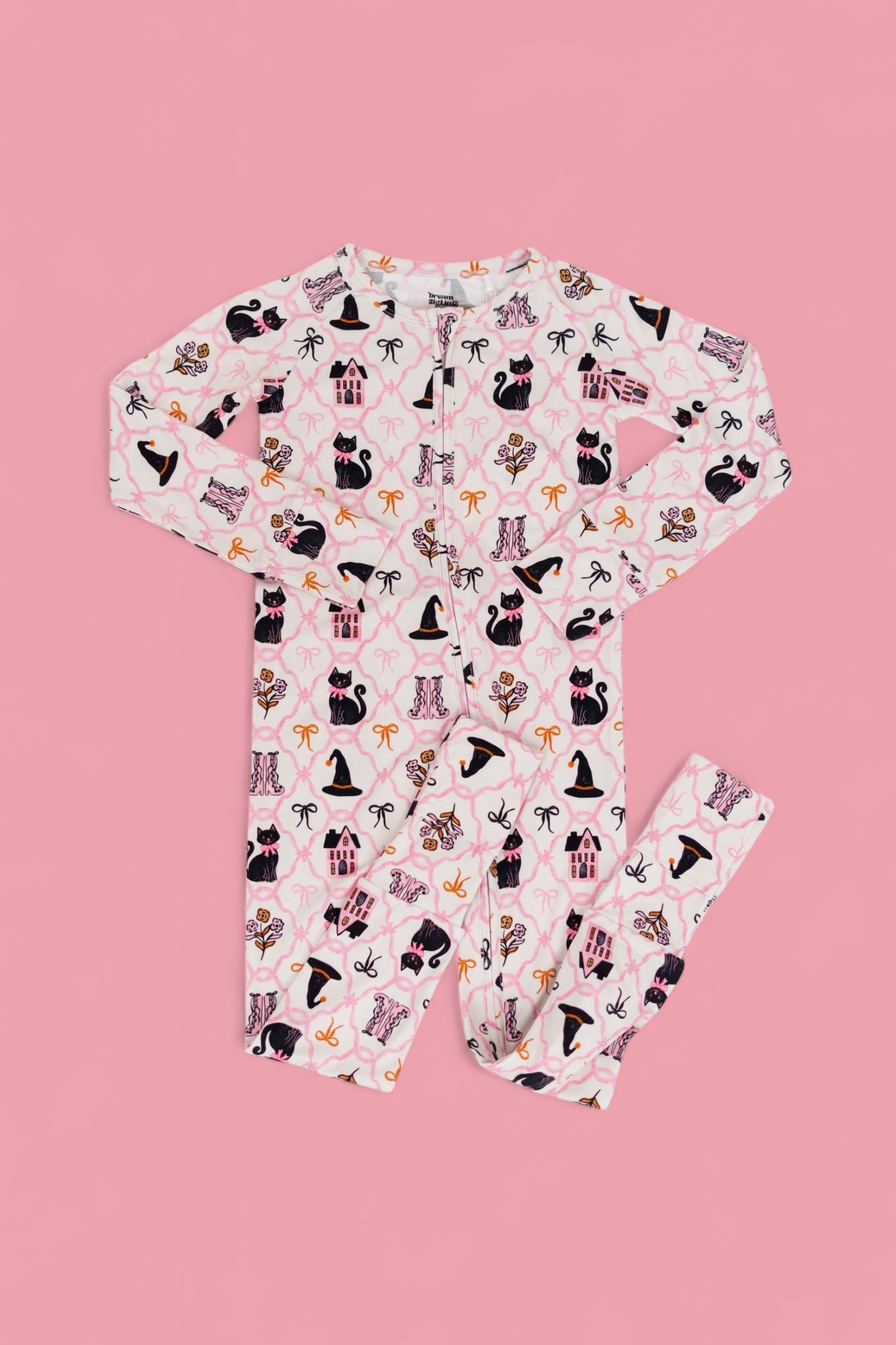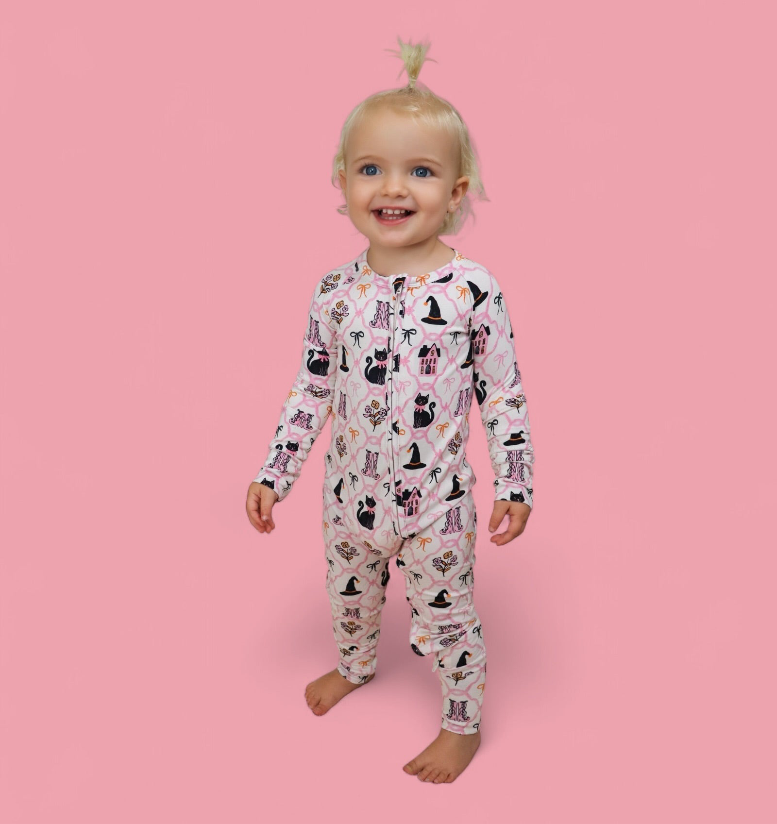 Cast a cozy spell with the Broomsticks and Blossoms Dream Romper! Adorned with vintage witchy charm—like black cats with bows, magic hats, floral boots, and spooky houses—this enchanting print is set on a soft blush background with pink ribbon accents. Crafted from our signature buttery-soft fabric with fold-over mittens, footies, and a double zipper, this one-piece is made for magical naps and dreamy adventures.