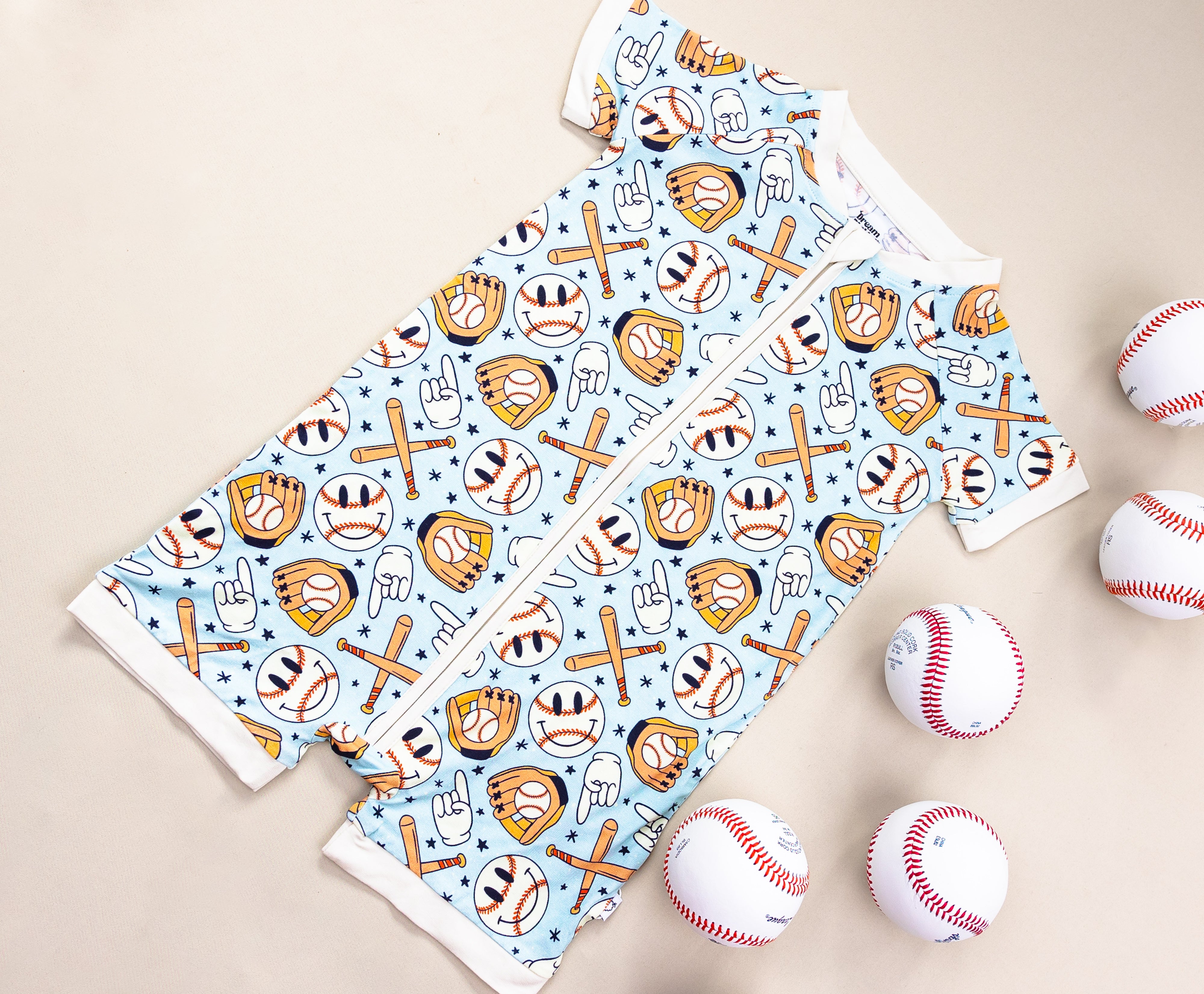• Playful baseball-themed print with smileys, mitts, bats, and stars