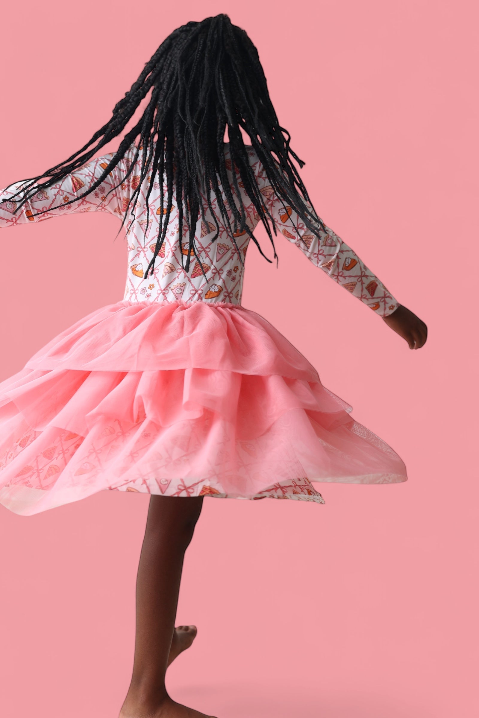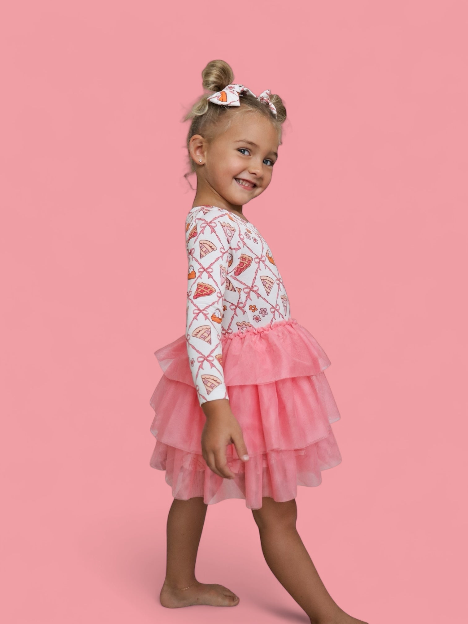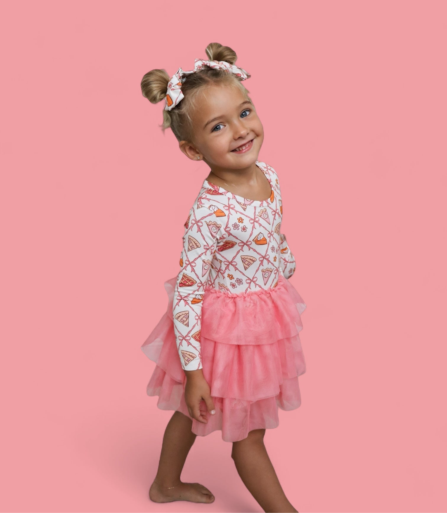 Whisk her away into a world of fall fun with our Slice of Fall Long Sleeve Dream Tutu Dress! Featuring a cozy pie-inspired print with smiling slices, florals, and sweet little bows, this dress brings the perfect mix of comfort and whimsy. The soft bamboo bodice and layered tulle skirt make it twirl-ready for every autumn adventure.