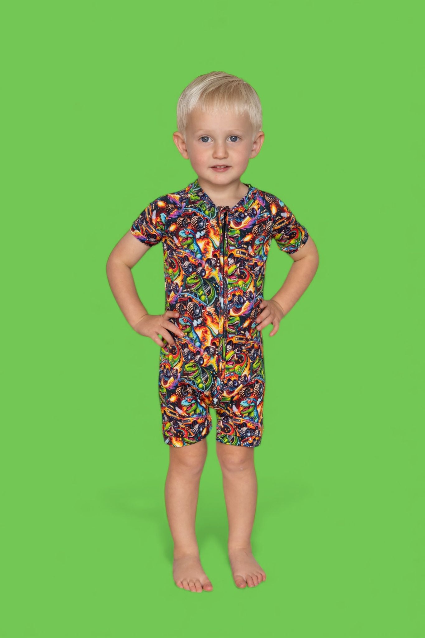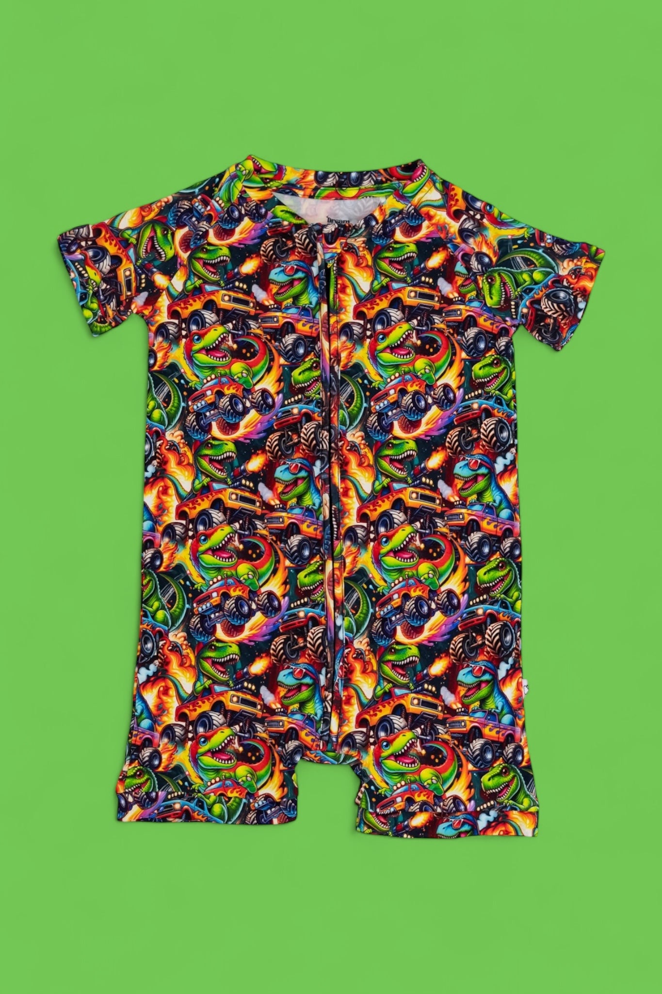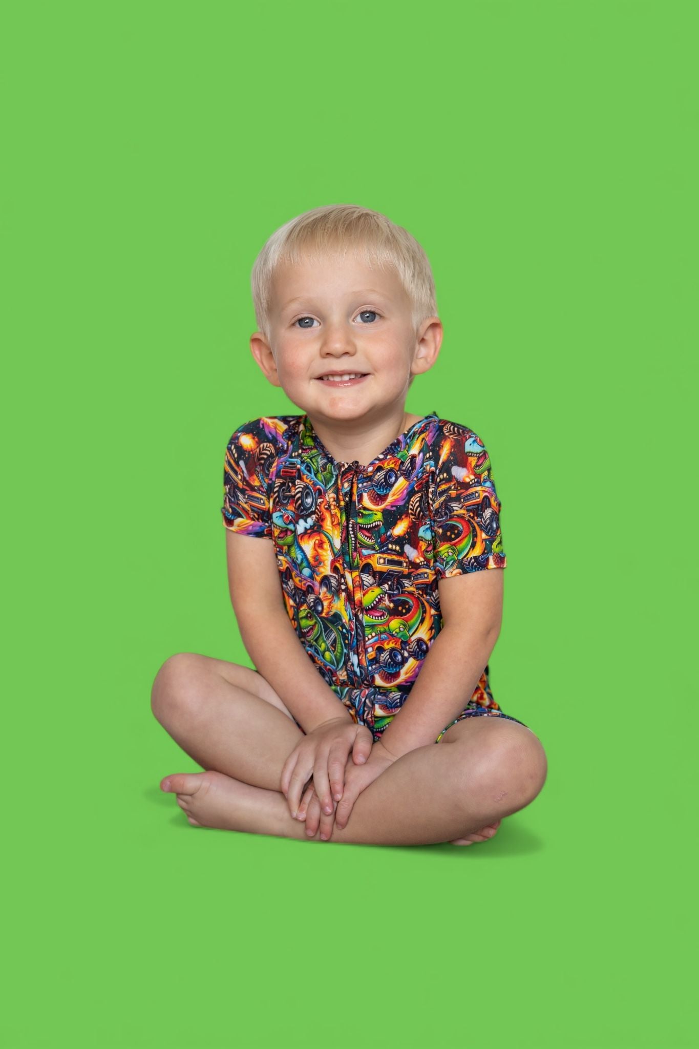 Bedtime just got a whole lot louder (in the best way) with our Roar and Rev Dream Shortie! Featuring a high-octane mix of roaring dinosaurs and revving monster trucks, this one-piece pajama is made for little ones who dream in dino roars and engine revs.