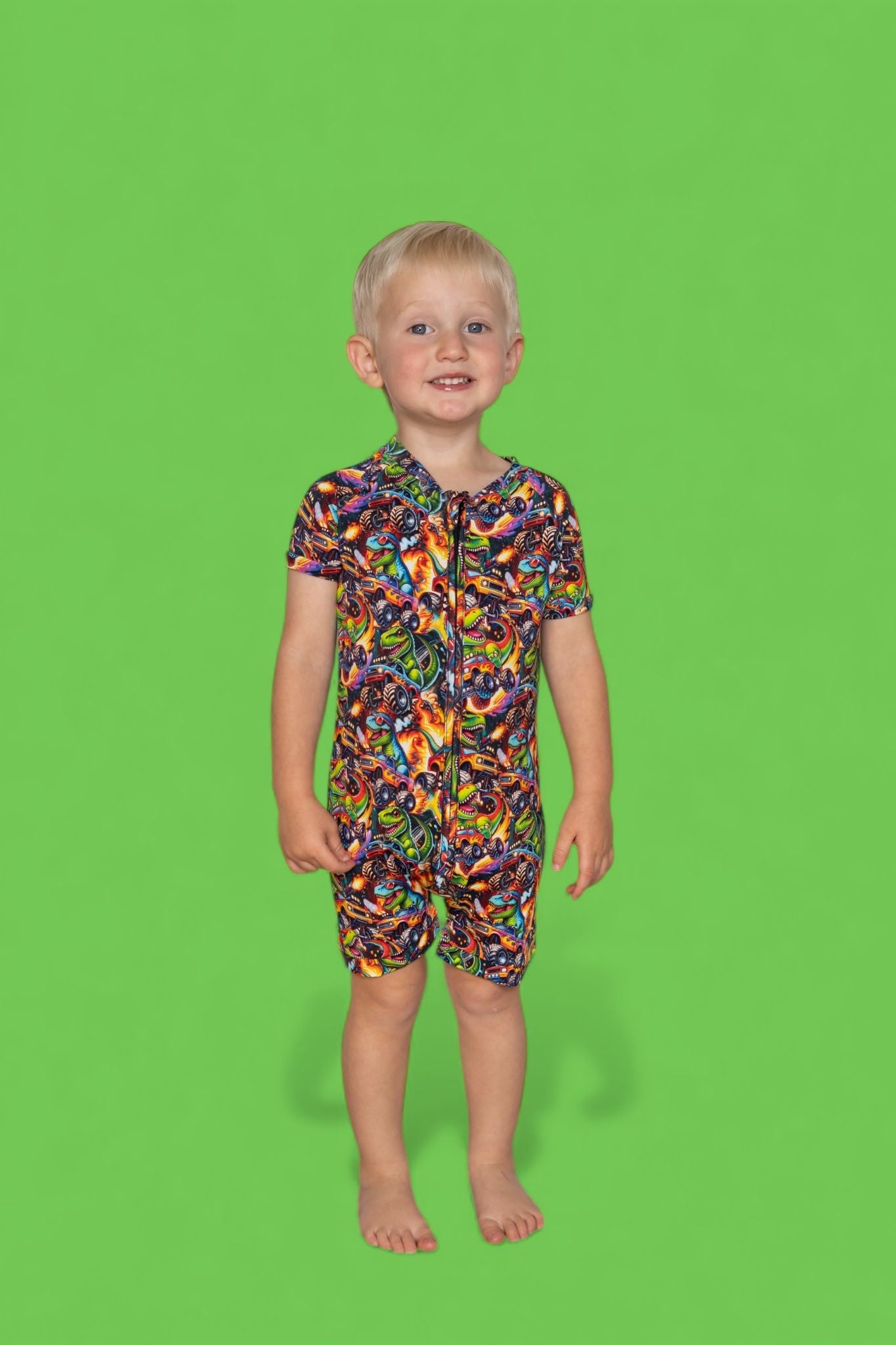 Looking for comfort and style try our Dream Shortie! This stylish short romper is perfect for easy transitions between playtime and naptime. Featuring a convenient zipper for quick diaper changes, your child will stay comfy and cool all day long.