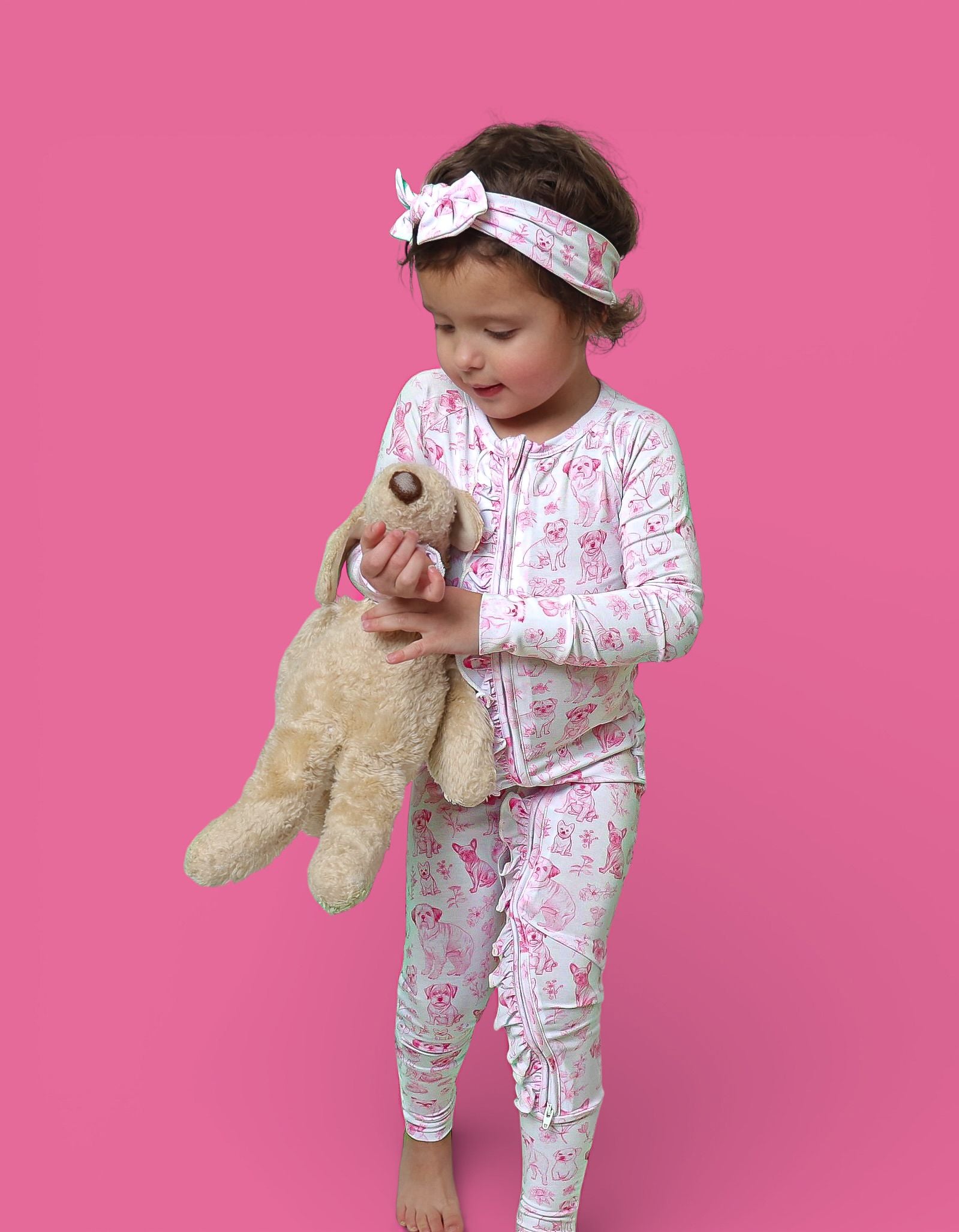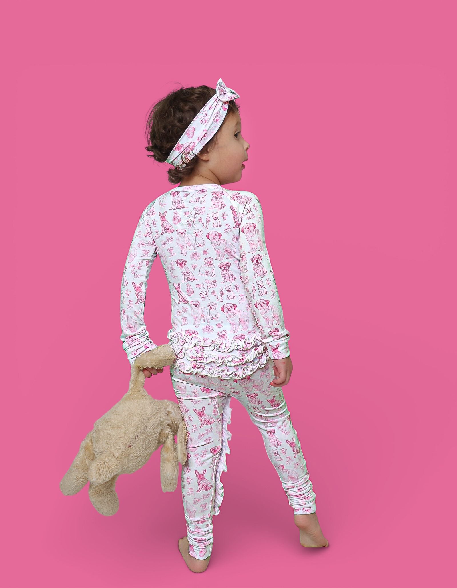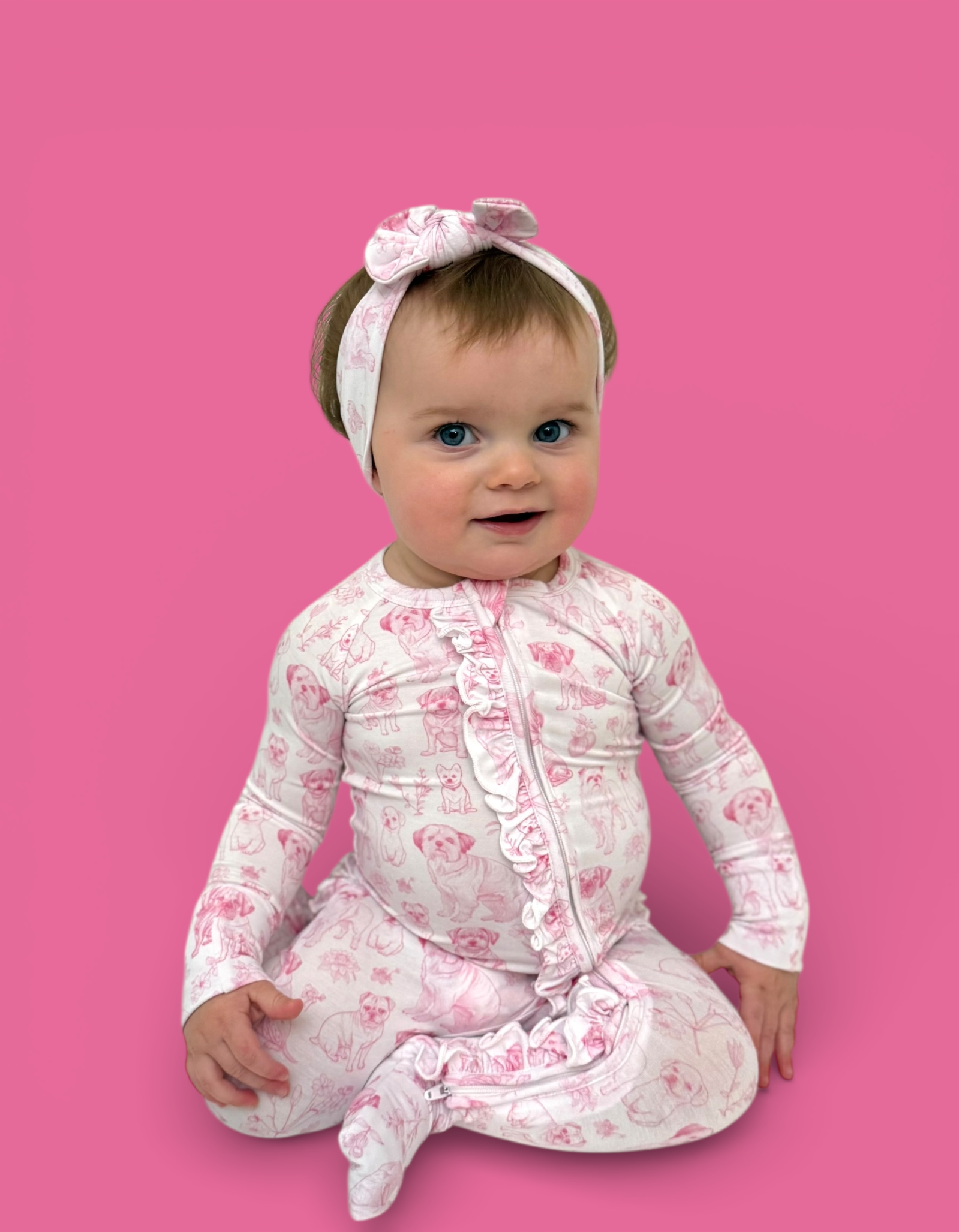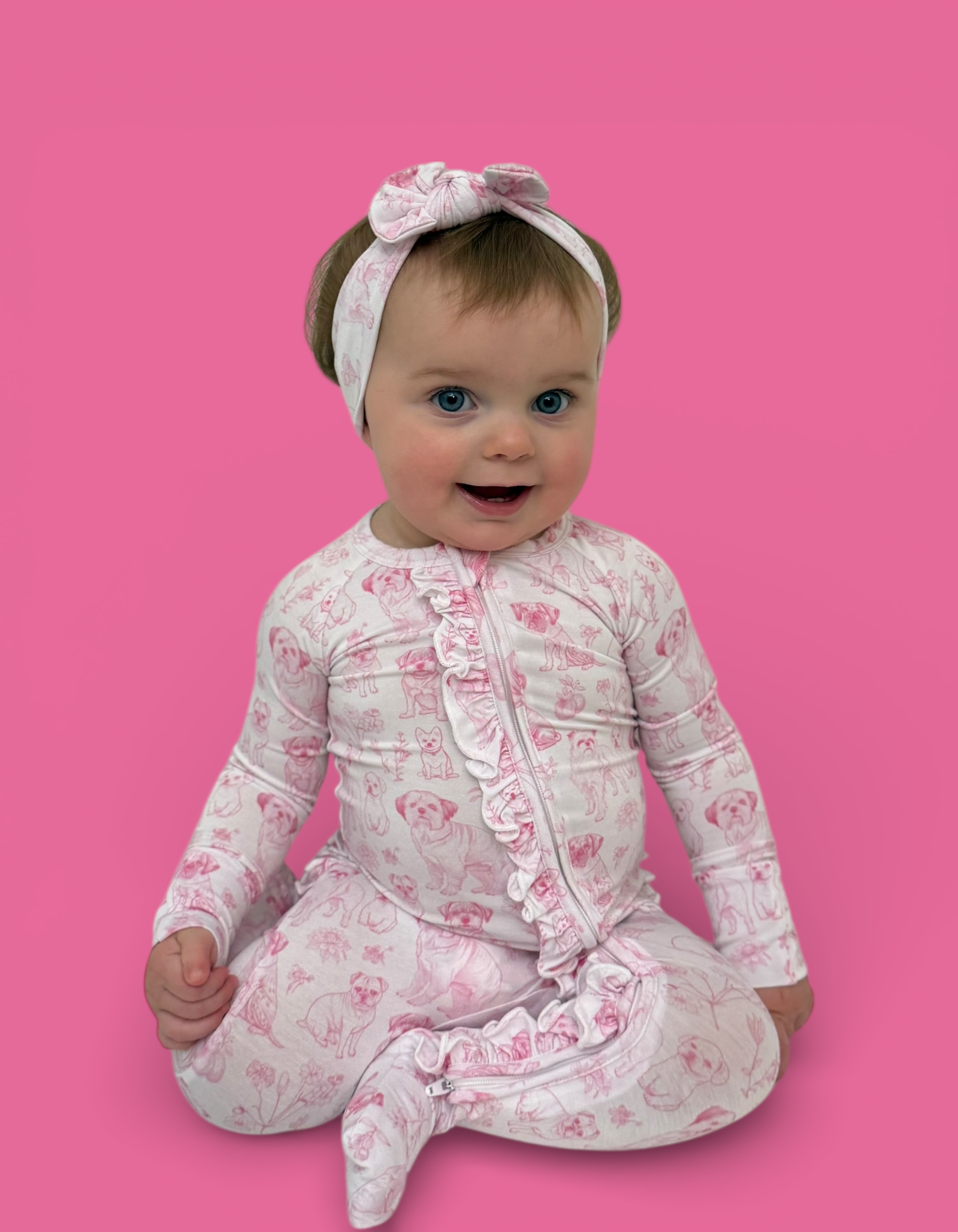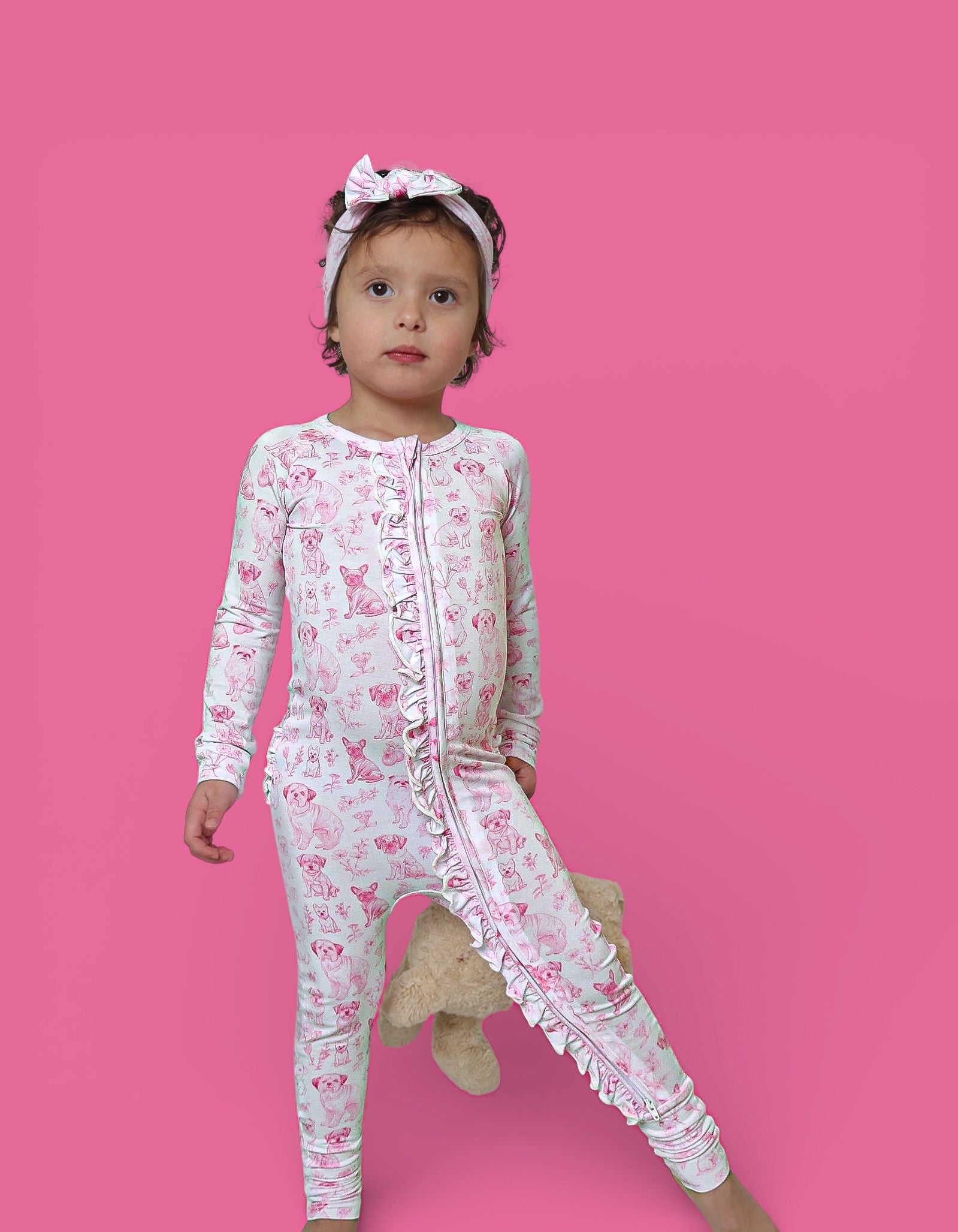 The Pink Puppy Toile Dream Ruffle Romper is made for cozy cuddles and heart-melting moments. Featuring a delicate pink puppy toile print with charming ruffle details, this one-piece favorite is crafted from our signature buttery-soft bamboo fabric to keep baby comfy, breathable, and adorable all day and night.