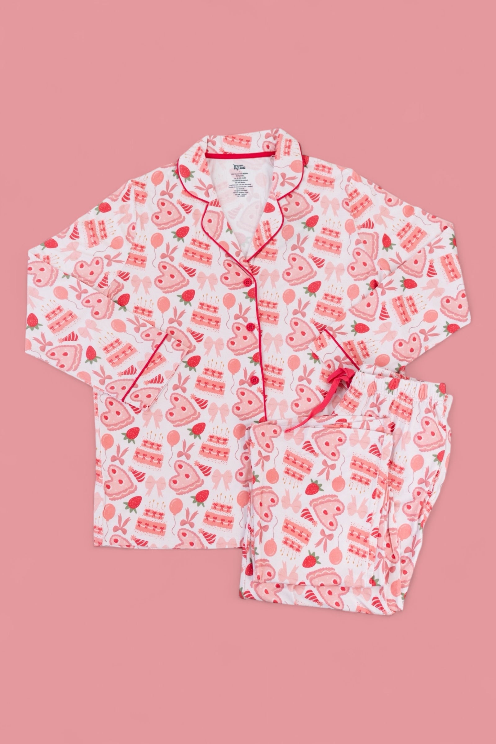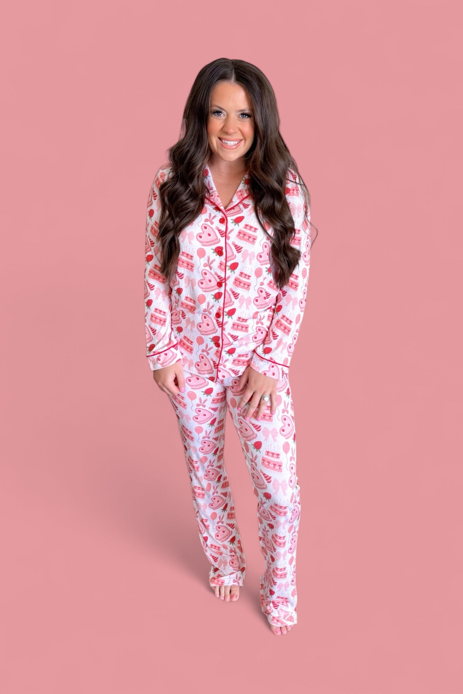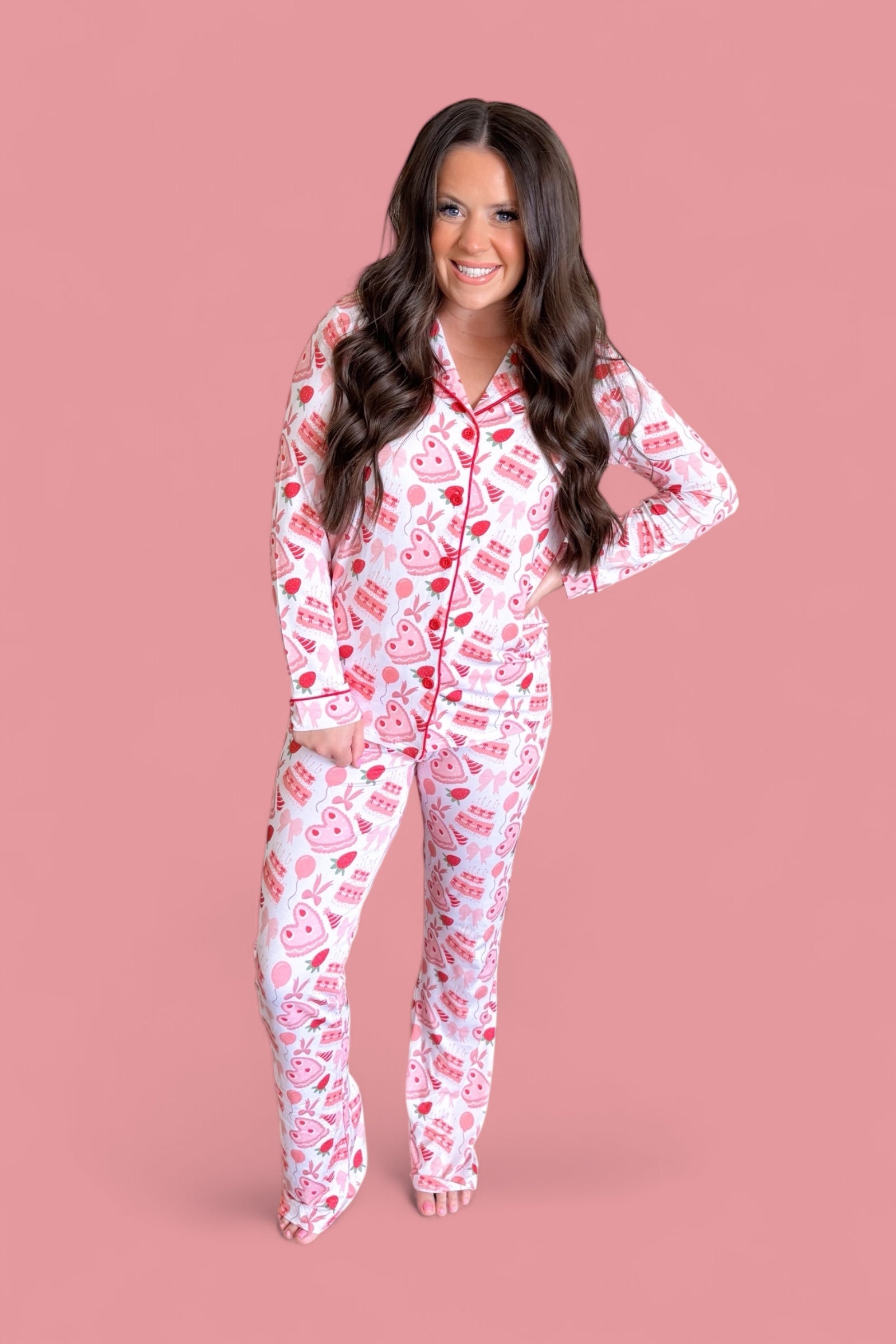 Treat yourself to a slice of birthday magic with our Berry Sweet Birthday Women's Dream Set! 🍓🎂 This charming two-piece features a soft long sleeve top and flattering flare pants, adorned with a playful print of heart-shaped cakes, strawberries, bows, and balloons. Whether you're matching with your mini or simply celebrating in cozy style, this set is perfect for lounging, gifting, or savoring your own sweet moments. Because birthdays aren’t just for kids! 💖🎉