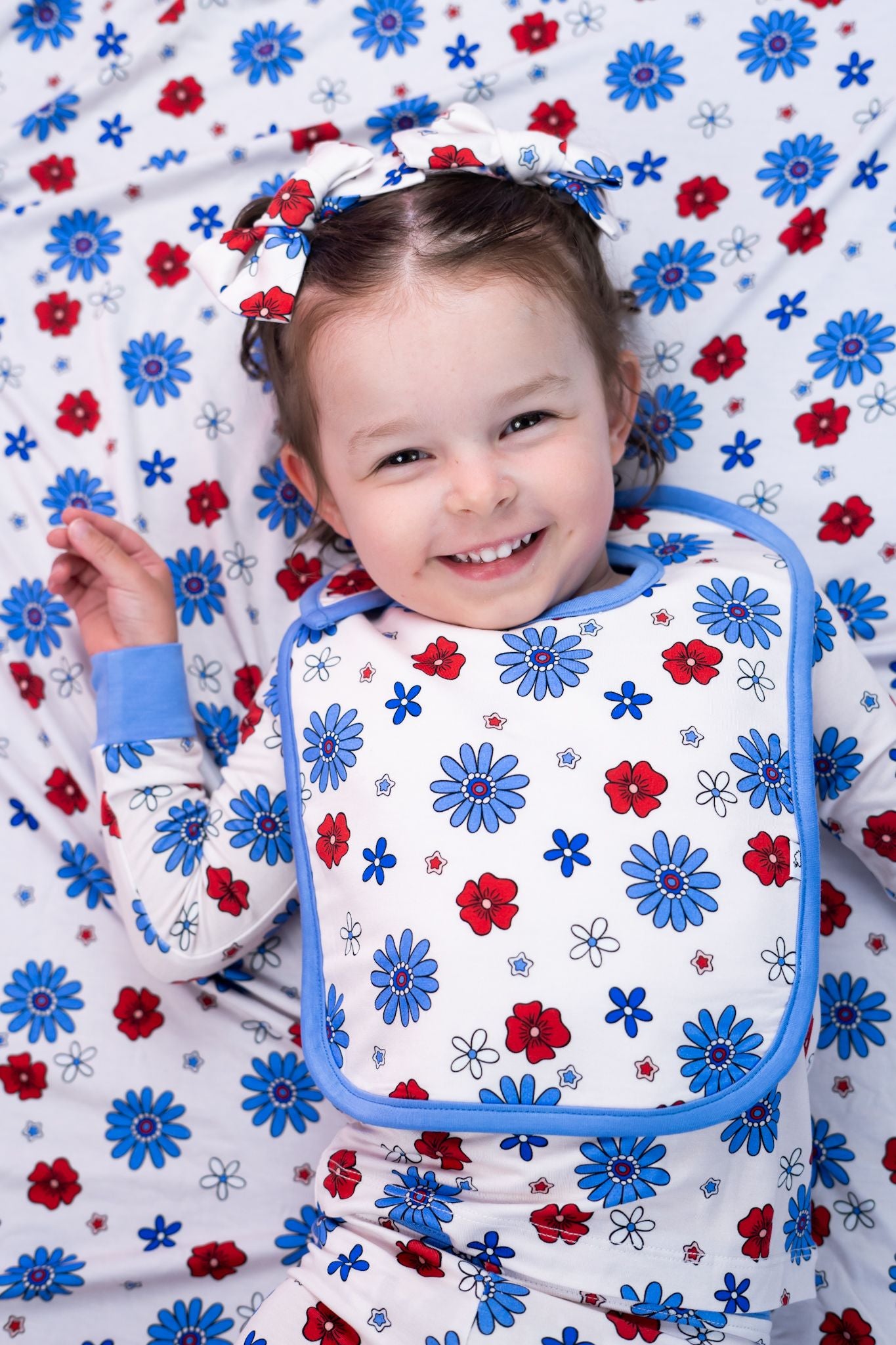 Introducing our adorable new baby bib, the ultimate combo of style and functionality! With its convenient snap enclosure, mealtime messes are a breeze to tackle, leaving more time for giggles and play. This bib pack consists of three prints: Star Spangled Sassy, Freedom Blooms, and Little Miss Firecracker. Crafted from super-soft bamboo material, it's gentle on delicate skin, making it the perfect companion for your little one's feeding adventures or playtime escapades!