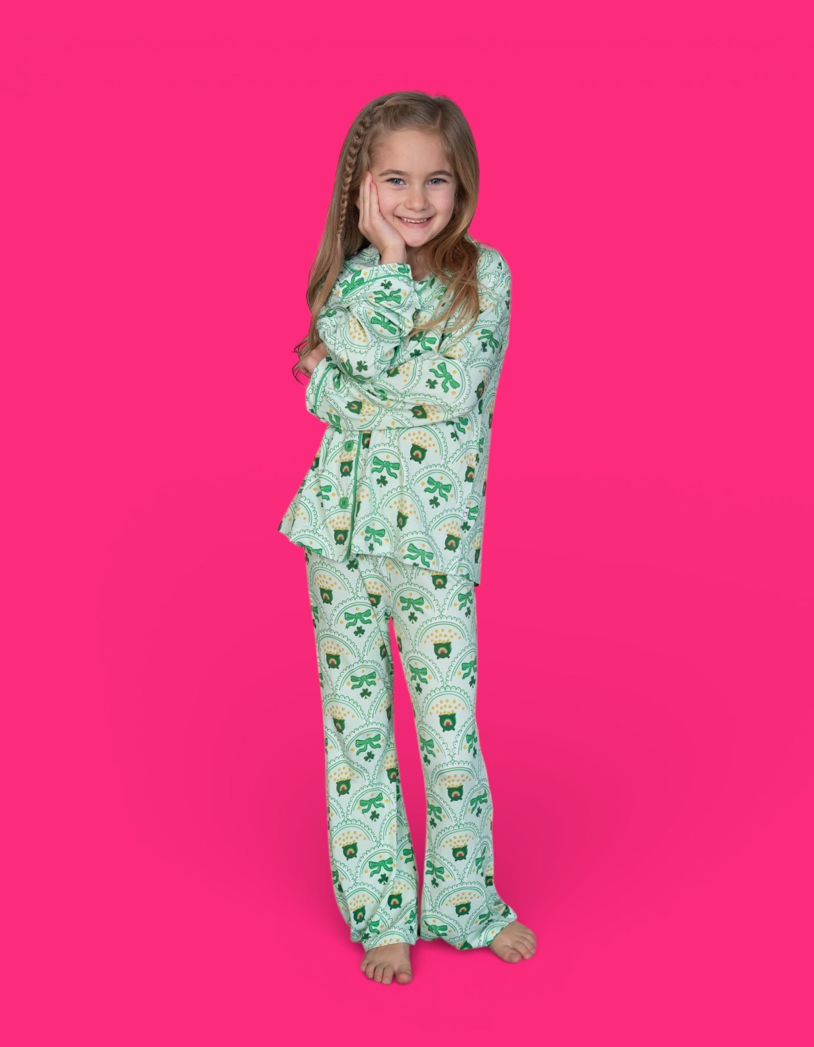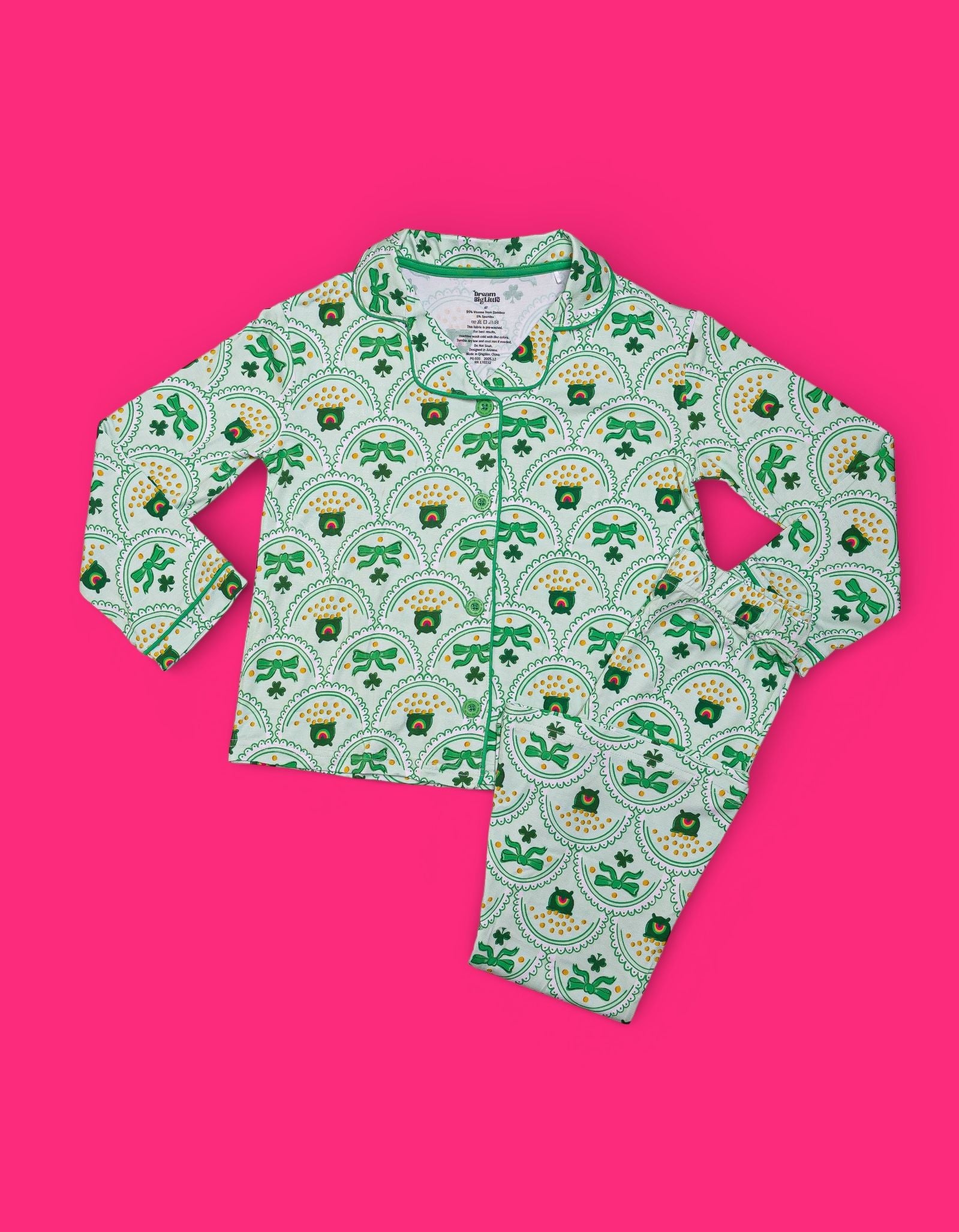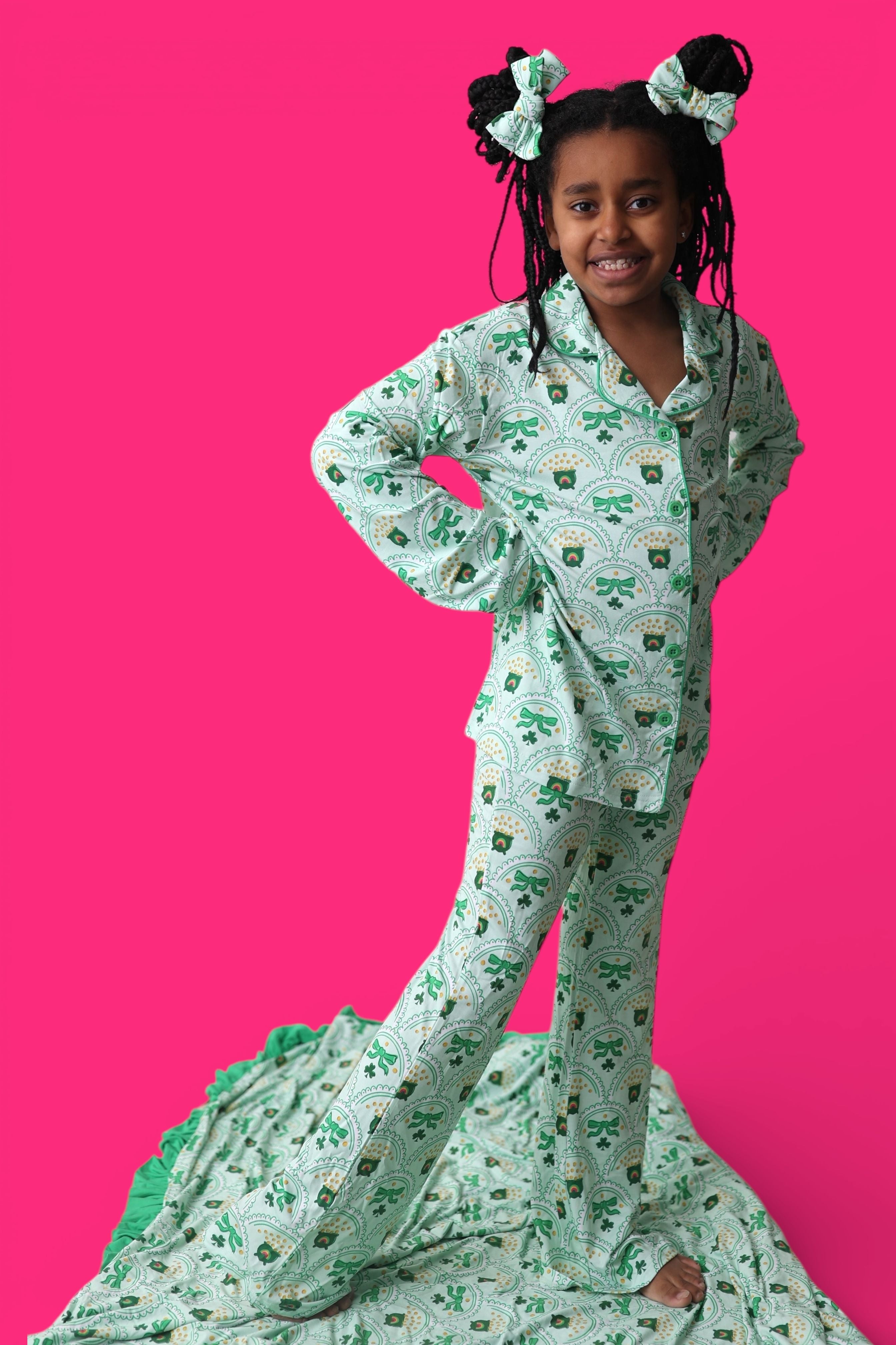 Bright, fun, and full of lucky charm, the Clover & Coins Dream Girl’s Flare Set features a scalloped pattern of shamrocks, lucky coins, and sweet bows paired with matching flare pants for the cutest festive look. Soft, stretchy, and perfect for twirling, playing, and celebrating St. Patrick’s Day in style, this set brings a cheerful sparkle to every moment. 💚✨